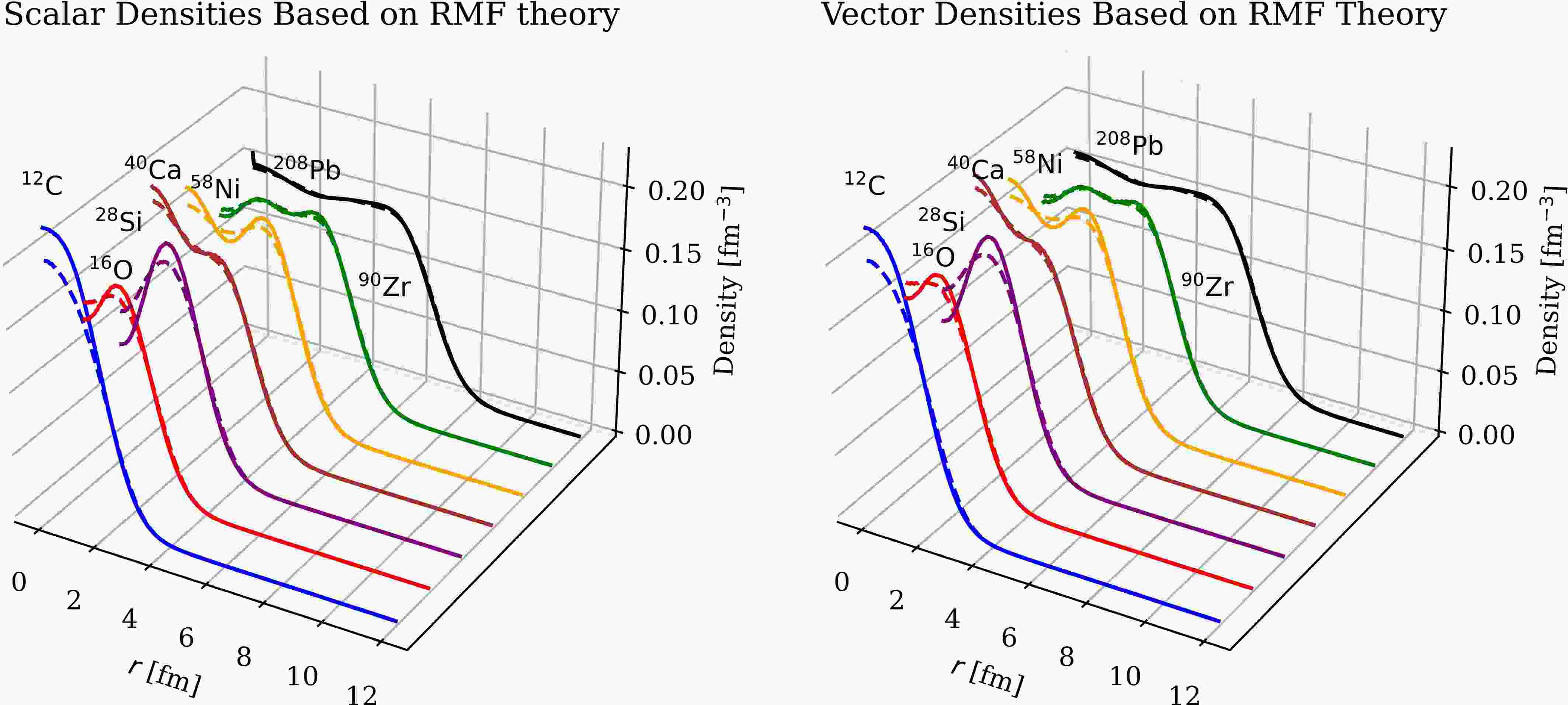 $ {r}_{n} $ ), the rms proton radius ($ {r}_{p} $ ), rms radius ($ {r}_{\rm rms} $ ), rms charge radius ($ r_{c}^{\rm cal} $ ), and$ {r}_{np}={r}_{n}-{r}_{p} $ , as well as the binding energy (Ecal) and energy per nucleon (E/A) were calculated within the RMF theory using a modified DIRHB code for 12C, 16O, 28Si, 40Ca, 58Ni, 90Zr, and 208Pb nuclei along with the corresponding experimental values of$ r_{c}^{\rm exp} $ , and Eexp are listed in Table 1. For each nucleus, values were calculated using the DD-ME2 and DD-PC1 parameterizations. A comparison of the results reveals a small difference between two models.Nucleus Model $ {{r}}_{{n}} $ $ {{r}}_{{p}} $ $ {\Delta {r}}_{{n}{p}} $ $ {{r}}_{\rm rms} $ $ {r}_{{c}}^{\rm {e}{x}{p}} $ $ {r}_{{c}}^{\rm {c}{a}{l}} $ $ {{E}}^{\rm {e}{x}{p}} $ $ {{E}}^{\rm {c}{a}{l}} $ E/A 12C DD-ME2 2.351 2.376 −0.025 2.363 2.470 2.507 −92 −87.31 −7.276 DD-PC1 2.401 2.423 −0.022 2.412 2.552 −87.15 −7.263 16O DD-ME2 2.577 2.606 −0.029 2.591 2.730 2.726 −128 −127.8 −7.988 DD-PC1 2.601 2.627 −0.026 2.614 2.746 −128.4 −8.026 28Si DD-ME2 2.916 2.953 −0.037 2.935 3.138 3.060 −237 −229.7 −8.205 DD-PC1 2.966 3.001 −0.035 2.984 3.105 −228.9 −8.175 40Ca DD-ME2 3.318 3.370 −0.052 3.344 3.478 3.464 −342.05 −342.7 −8.569 DD-PC1 3.316 3.363 −0.047 3.340 3.457 −344.7 −8.619 58Ni DD-ME2 3.670 3.666 0.010 3.668 3.776 3.752 −506.45 −501.6 −8.648 DD-PC1 3.693 3.689 0.004 3.691 3.775 −501.9 −8.653 90Zr DD-ME2 4.267 4.192 0.075 4.234 4.270 4.268 −783.89 −783.1 −8.702 DD-PC1 4.281 4.191 0.090 4.241 4.267 −785.2 −8.725 208Pb DD-ME2 5.560 5.460 0.100 5.576 5.501 5.576 −1636.43 −1640.0 −7.884 DD-PC1 5.649 5.450 0.199 5.571 5.508 −1641.3 −7.890 The obtained scalar and vector (baryon) density distributions of various target nuclei are illustrated in Fig. 1. The vector density distribution for 12C exhibited a pronounced central peak. By contrast, the vector density distributions for 16O and 28Si displayed a bubble-like structure, characterized by a depleted central density. For 40Ca, the vector density distribution was centrally peaked, with a secondary minor peak observed at approximately 3 fm. The vector density distribution of 58Ni was distinguished by a double-peak structure, without the bubble-like feature observed in lighter nuclei. In the case of 90Zr, the vector density distribution showed a reduced central density, with a gradual increase as the radial distance from the nucleus center grew. For 208Pb, the vector density distribution remained nearly constant, with a slight decrease noted at approximately 2.5 fm.