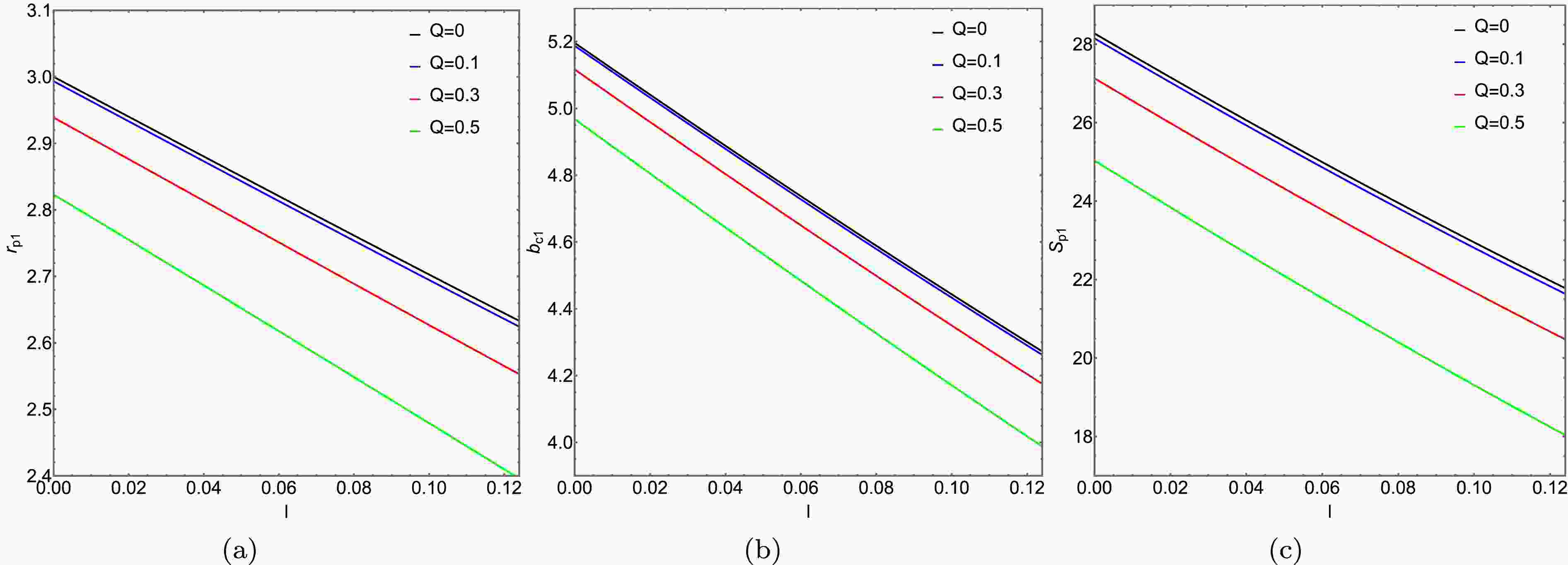 To study the effects of charge Q and Lorentz-violation parameter l on the photon sphere radius $ r_{{\rm ph}_i} $ and critical collision parameter $ b_{c_i} $, calculations were conducted using the formula for a photon sphere radius with $ M_1=1 $ and $ M_2=1.2 $. The results are shown in Tables 1 and 2. The variations of the photon sphere radius and its corresponding area with respect to the charge Q and Lorentz-violation parameter l are plotted in Figs. 1 and 2. Based on the relevant research, the charge Q is limited to the range of 0 to 0.5, and the Lorentz-violation parameter l is limited to the range of 0 to 0.1. It was observed that when $ Q=0 $ and $ l=0 $, the scenario corresponds to the Schwarzschild ATSW, and when $ l=0 $, it corresponds to the Reissner-Nordström case. From Figs. 1 and 2 and Tables 1 and 2, it is observed that the impact parameter $ b_{c_{i}} $, photon sphere radius $ r_{p_{i}} $, and the corresponding enclosed area $ S_{p_{i}} $ decrease with increasing charge Q and Lorentz-violation parameter l.