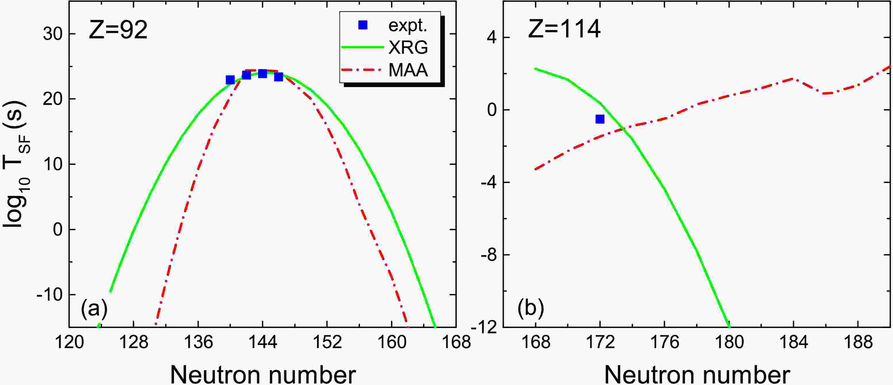 Figure 1.  (color online) Comparison of the predicted SF half-lives for even-even Uranium and Flerovium isotopes. The squares denote the experimental data taken from NUBASE2020 [36]. The solid and dot-dashed curves denote the results of XRG formula proposed in [18] and those of the MAA formula in [24], respectively.