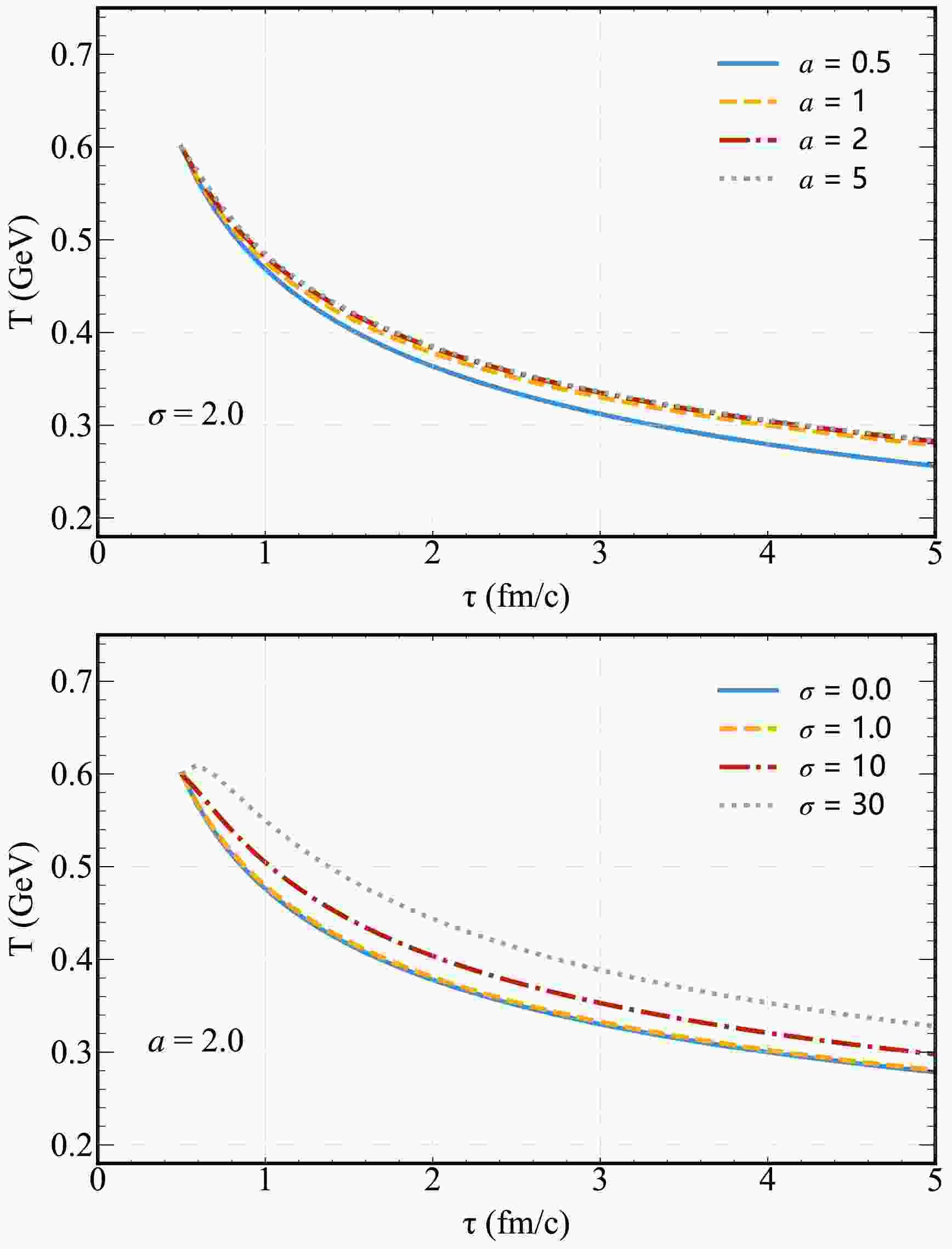 is a constant determined by the number of quark flavors $ N_f $ and gluon colors. The dimensionless parameter σ characterizes initial magnetic field strength. For RHIC energies ($ T_0 = 0.31 $ GeV) with $ B_0 \in [10^{18}, 10^{19}] $ Gauss (generated by rapid motion of charged spectator nucleons), results in σ ranges from $ 0.04 $ to $ 40 $. Notably, $ B_0^2 = \sigma T_0^4$ is an effective estimation of the initial magnetic field strength based on vacuum calculations for relativistic heavy-ion collisions [55, 56] valid for central-to-moderately non-central collisions in the ideal MHD limit. This relationship fails for finite QGP conductivity, magnetized QGP, or ultra-peripheral collisions, where the initial field depends strongly on the impact parameter b and requires spatial-resolved calculations.