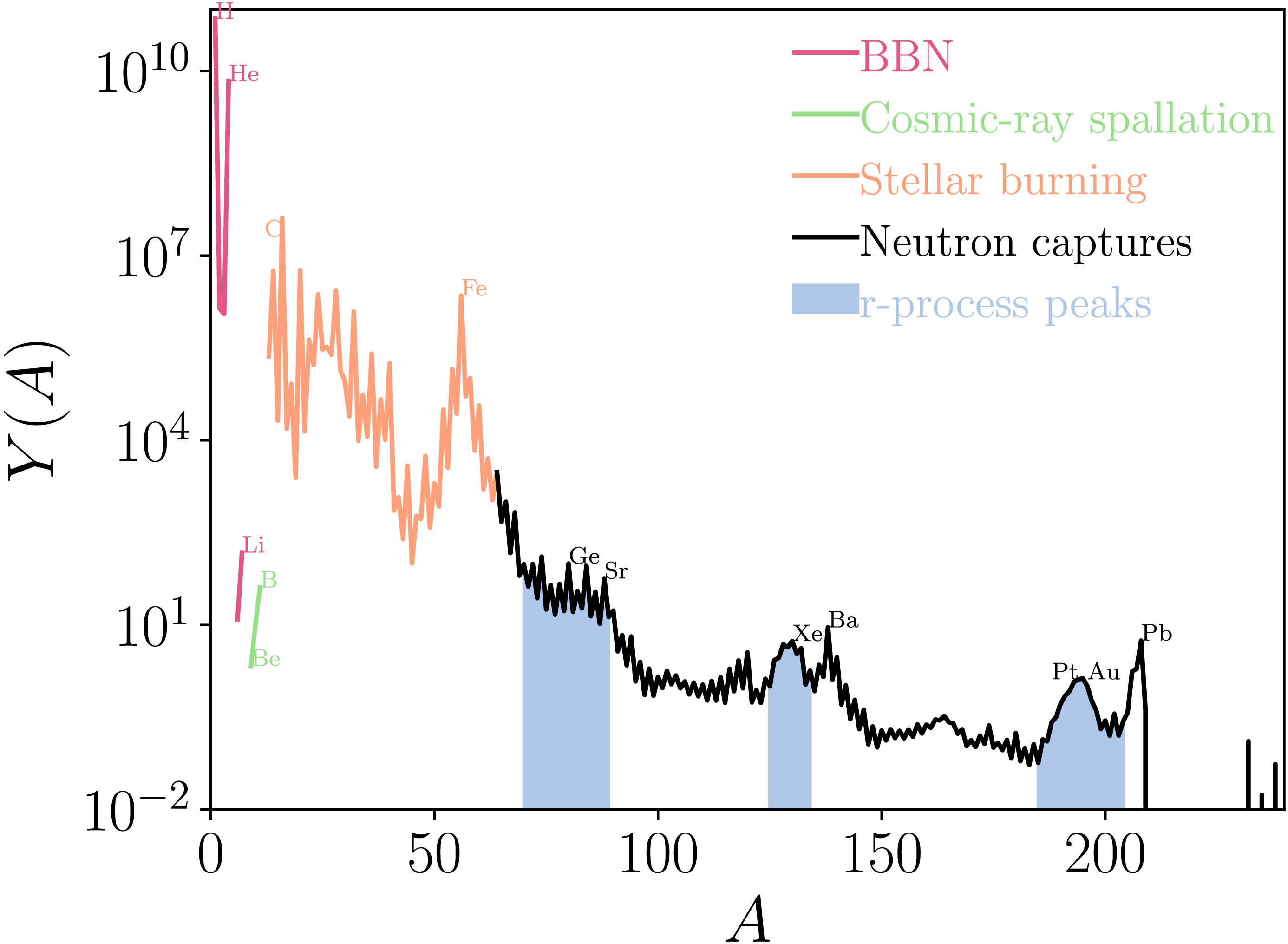 Figure 1.  (color online) Element abundance $ Y_i $ is considered as a function of the mass number $ A_i = N_i + Z_i $. We have applied the most commonly used scaling, which normalizes the abundance of Silicon to $ Y(\text{Si}) = 10^{6} $.