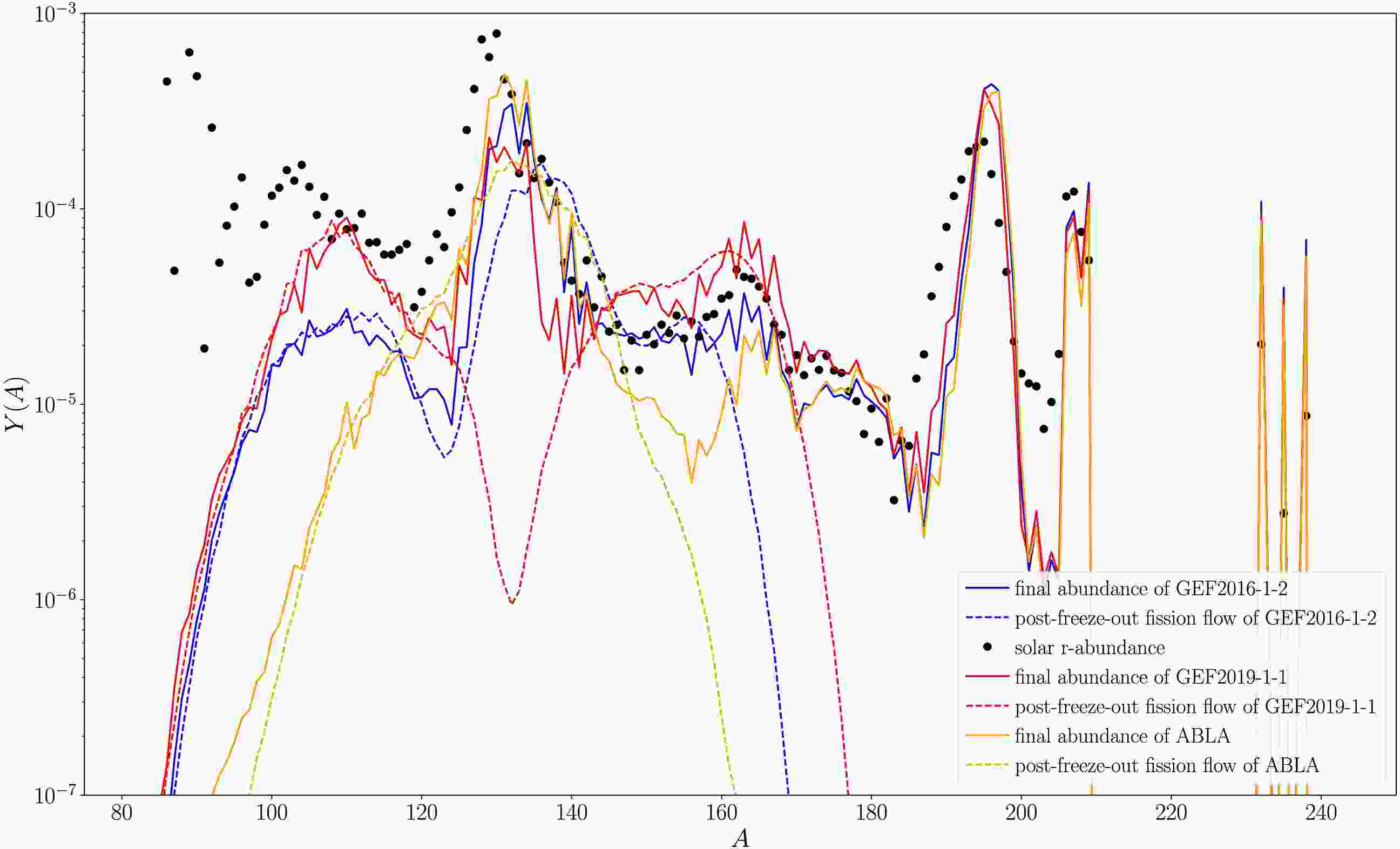 Before the freeze-out, the models GEF 2016-1-2, GEF 2019-1-1, and ABLA yield results for the fission cycle $ \Lambda \approx 1.80 $, while after freeze-out $ \Lambda \approx 0.33 $. This means that most of the fission occurs before freeze-out. However, as shown in Fig. 2, the post-freeze-out fission flow $ J_{\rm fission} $ (dashed lines) aligns directly with the final abundance pattern (solid lines), particularly in the shoulder regions ($ 95 \lt A \lt 120 $ and $ 140 \lt A \lt 170 $). This demonstrates that while pre-freeze-out fission is quantitatively dominant, it is the fission fragments produced after freeze-out, which are no longer reprocessed by neutron captures, that directly determine the final r-process abundance pattern.