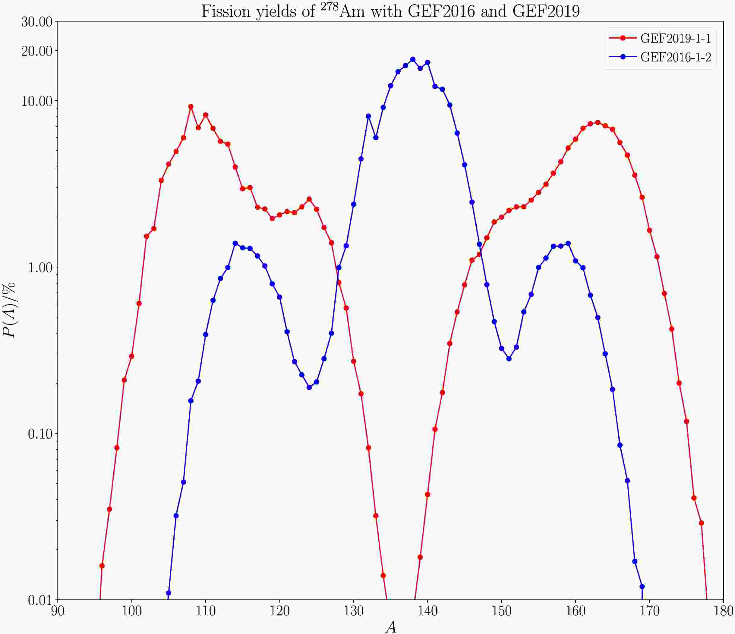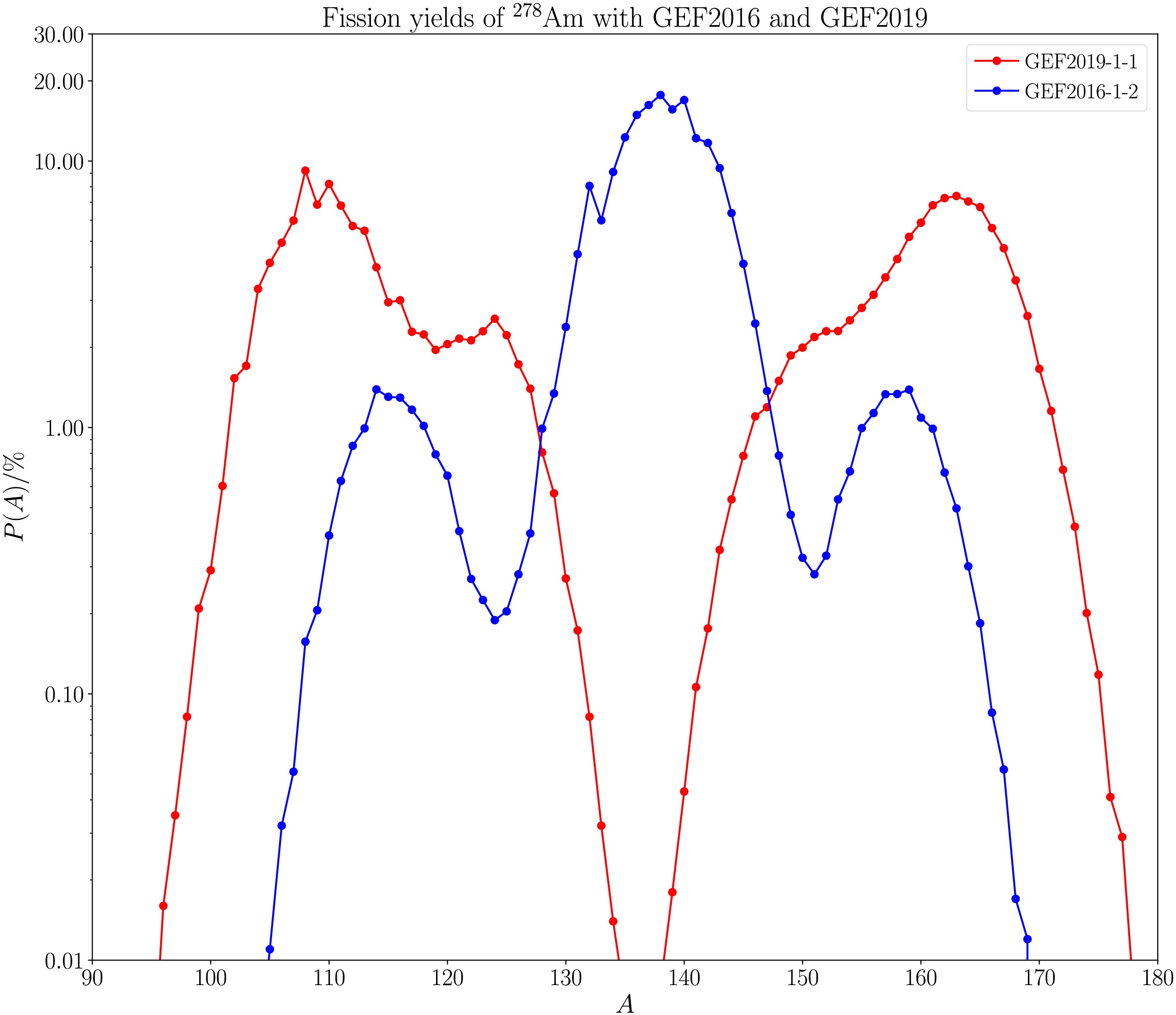 In order to show the difference in fission yields between GEF2016-1-2 and GEF2019-1-1, we take $ ^{278}{\rm {Am}} $ as an example. There was an improvement in the GEF code in 2017, which provided more reasonable fission barriers $ E_b $; this resulted in a variation of $ P_i $ configurations.