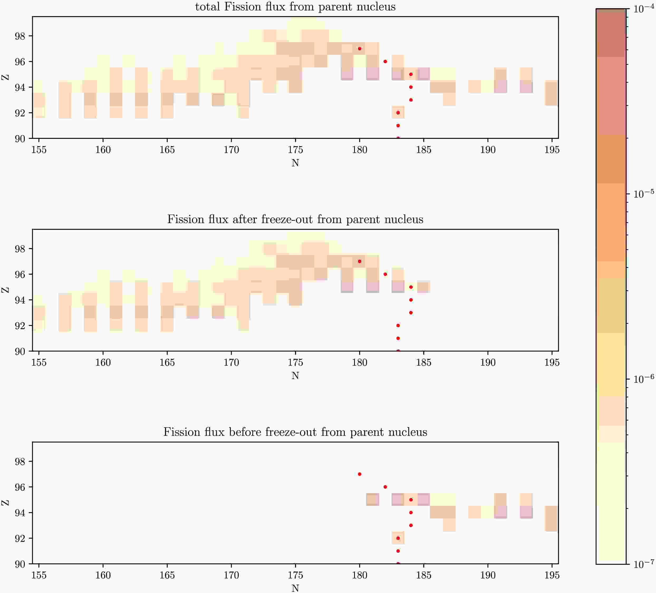 Figure 4.  (color online) Fission flow pattern. Color scale: fission flow. Panels from top to bottom: total fission flow pattern; fission flow after the freeze-out; fission flow before freeze-out. Red dots represent the most abundant nuclei in each isotopic chain when the freeze-out occurs. Most of the red dots are also the r-process "waiting points".