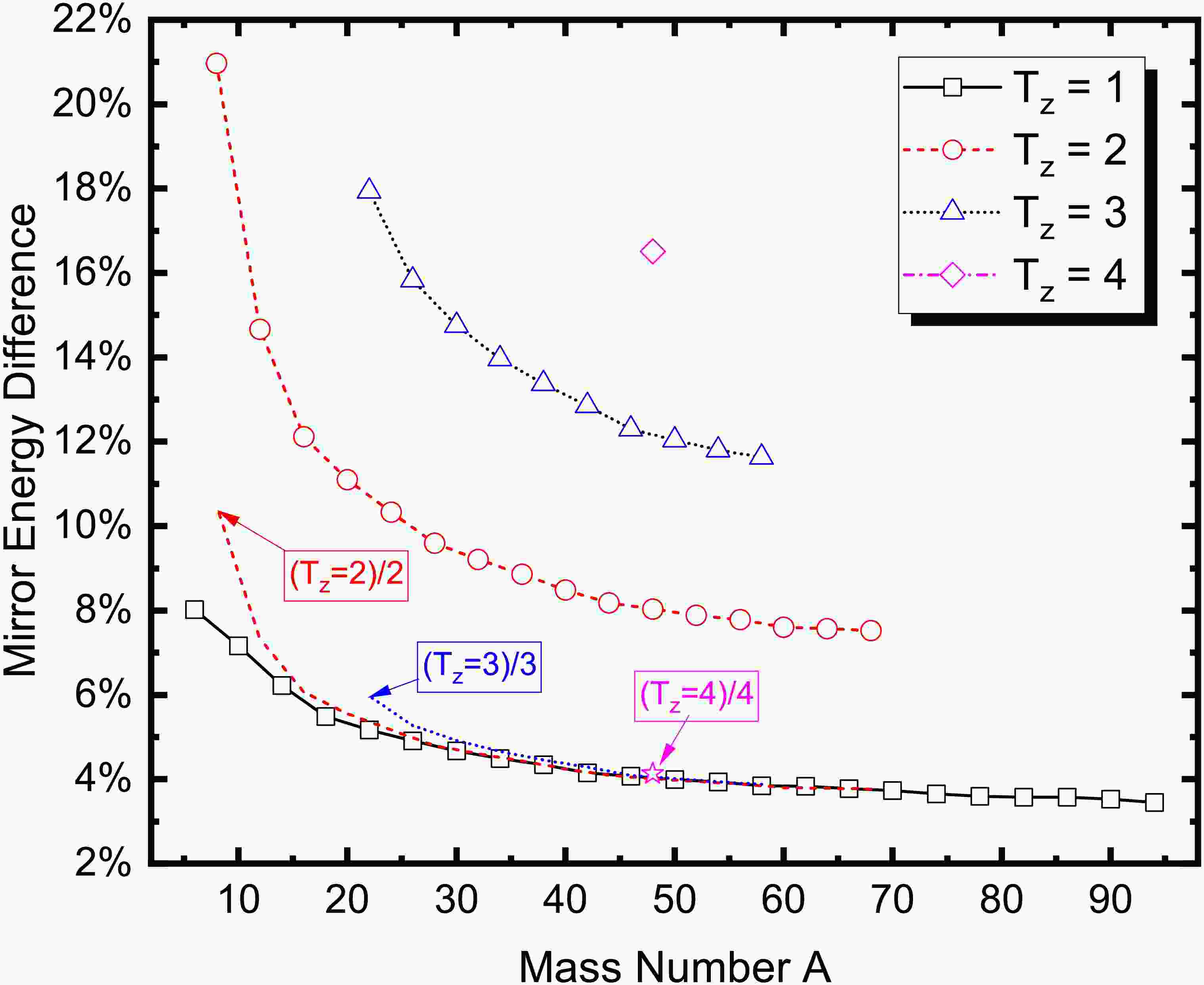 $ T_z $ represents the third component of isospin ($ \ T_z = \dfrac{N - Z}{2} $ , where the$ T_z $ of the proton is$ -1/2 $ , and that of the neutron is$ 1/2 $ [1]). Figure 1 shows the experiment mirror energy difference (MED) in the available 50 even-even nuclei [44], including four categories labelled$ T_z=1 $ ,$ T_z=2 $ ,$ T_z=3 $ , and$ T_z=4 $ . Indeed, the MED with ($ T_z $ =2)/2, ($ T_z $ =3)/3, and ($ T_z $ =4)/4 will nearly coincide with that of$ T_z=1 $ . As the mass number of mirror nuclei increases, the MED between the pairs tends to approach a constant value of approximately 3.6%. This finding is significant as it indicates a structural pattern closely linked to the intrinsic properties of protons and neutrons, rather than being a random or isolated phenomenon. Remarkably, this 3.6% difference closely matches the mass disparity between two protons and two neutrons, suggesting that the origin of the mass discrepancy lies fundamentally in the nucleons themselves. The mass difference in mirror nuclei primarily arises from the interplay between the masses of protons and neutrons and the electromagnetic interactions within the nucleus. Moreover, the Coulomb force plays a pivotal role in contributing to the MED between mirror nuclei. The$ ab $ $ initio $ calculations has investigated of isospin-symmetry breaking in MED, primarily arising from the dominate s-wave components. [45, 46] The observed 3.6% mass difference in Fig. 1 reflects this intrinsic nucleon mass difference magnified by the nuclear environment.