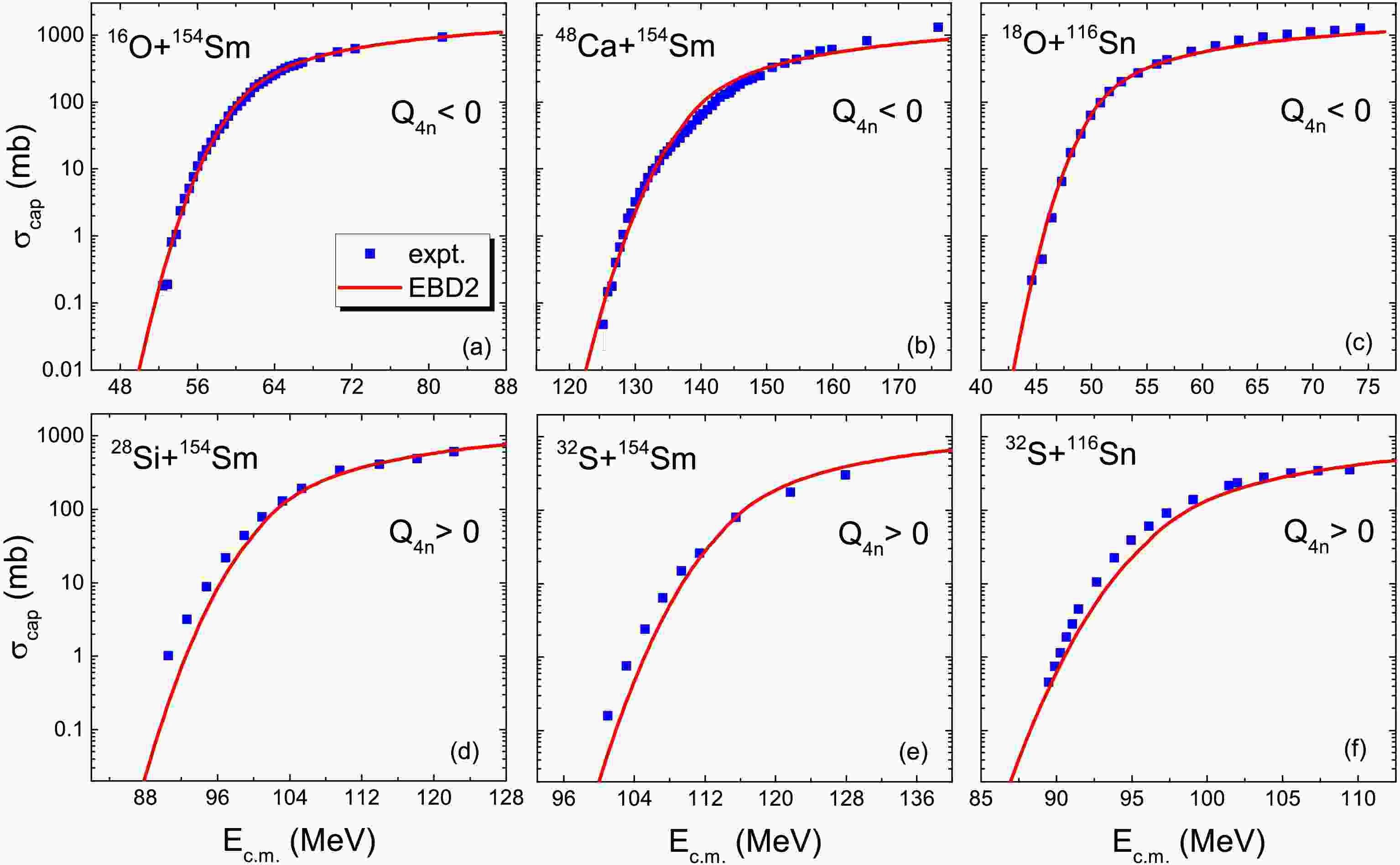 Figure 1.  (color online) Capture excitation functions for 16O+154Sm [6], 48Ca+154Sm [36], 18O+116Sn [26], 28Si+154Sm [37], 32S+154Sm [38], and32S+116Sn [39]. The squares and curves denote the experimental data and predictions of EBD2 [32], respectively.