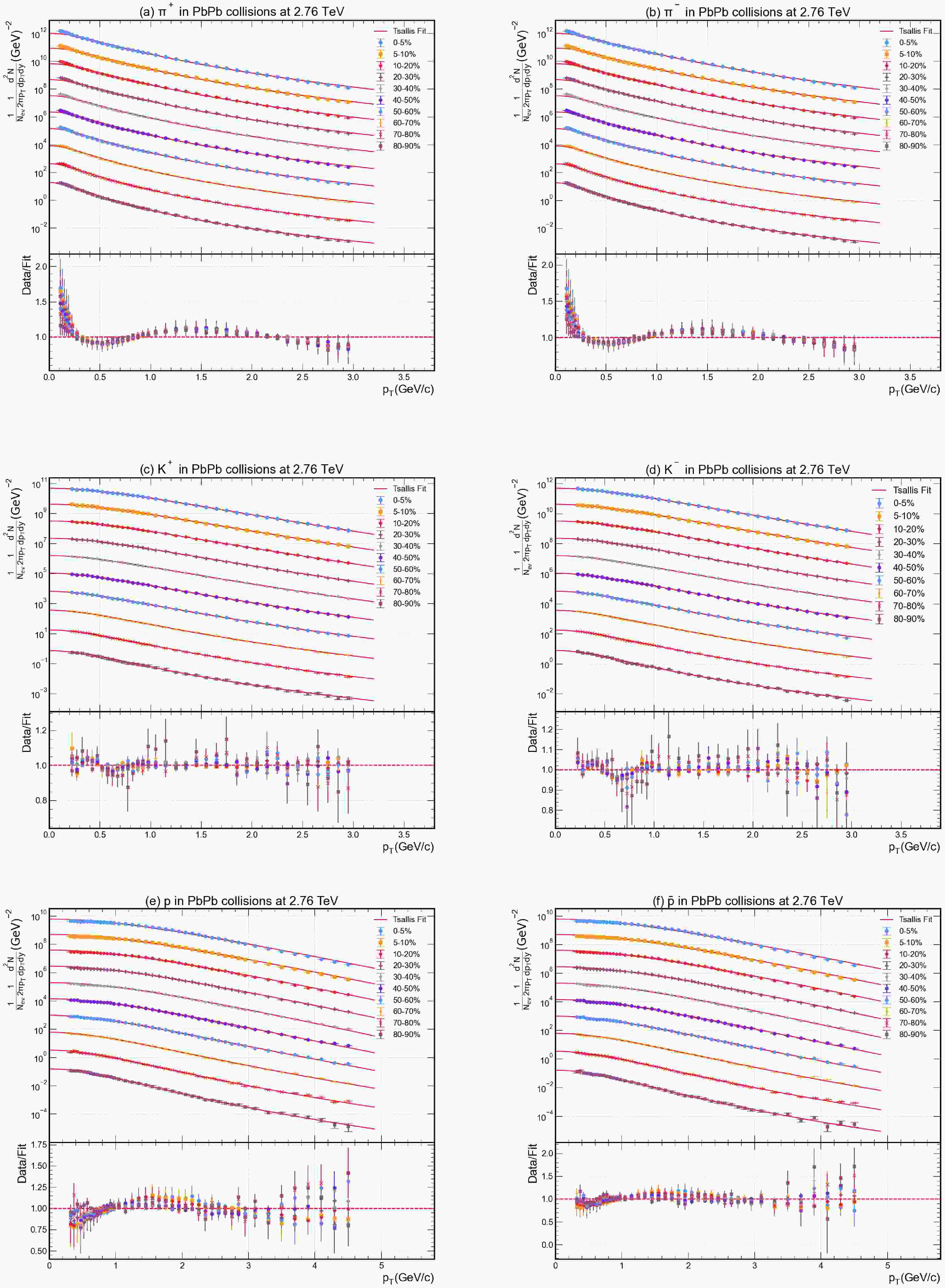 • The present analysis utilizes the $ p_T $ spectra of identified hadrons (pions, kaons, and anti-protons) measured by the ALICE Collaboration in heavy-ion collisions at the LHC. In particular, we consider the experimental data for Pb+Pb collisions at $ \sqrt{s_{\mathrm{NN}}} = 2.76 $ TeV across multiple centrality classes, as reported by ALICE [22, 23]. These mid-rapidity spectra ($ |y| \approx 0 $ within the ALICE central barrel acceptance) have been corrected for detector acceptance, efficiency, and feed-down contributions from weak decays. The analysis covers ten centrality intervals from central 0–5% to peripheral 80–90%, with each interval characterized by the average number of participant nucleons $ N_{\text{part}} $ and the charged-particle multiplicity density $ \langle dN_{\text{ch}}/d\eta \rangle $ as determined from a Glauber model simulation. The statistical and systematic uncertainties of the data points are combined in quadrature on the spectra plots.
