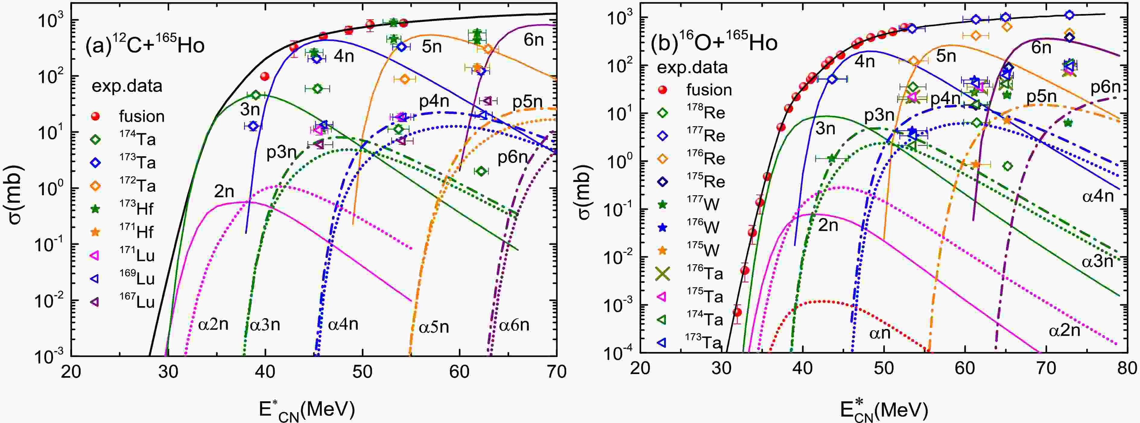 Figure 1.  (color online) Fusion and evaporation residue excitation functions in the reactions of (a) $ ^{12} $C + $ ^{165} $Ho and (b) $ ^{16} $O + $ ^{165} $Ho, respectively. The available experimental data are taken from Refs. [26, 27].