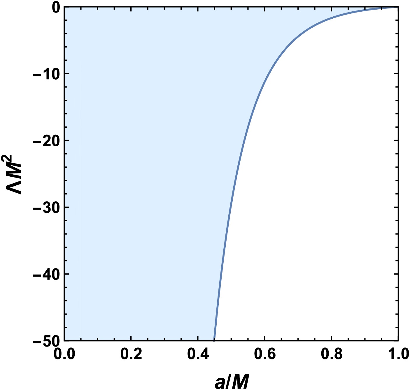 $ \Delta_r=0 $ . This is a quartic equation for r with two positive and two negative roots. The negative roots do not have physical significance, while the two positive roots represent the inner event horizon radius$ r_- $ and outer event horizon radius$ r_+ $ of the black hole, with$ r_+ \geq r_- $ . Both$ r_- $ and$ r_+ $ depend on the black hole mass M, spin parameter a, and cosmological constant Λ. Due to the complexity and length of their explicit analytical expressions, we resort to numerical methods for subsequent analysis. By solving the inequality$ r_+ \geq r_- $ , we determine the parameter space of$ \Lambda M^2-a/M $ that allows the existence of Kerr-AdS black holes, as illustrated in Fig. 1. In this figure, the region shaded in blue corresponds to parameter values for which Kerr-AdS black holes can exist. The solid blue curve indicates the condition$ r_+= r_- $ , at which the inner and outer event horizons coincide and the black holes become extremal. Moreover, we observe that as$ a/M\to 1 $ ,$ \Lambda M^2 $ approaches zero, whereas as$ a/M\to 1 $ ,$ \Lambda M^2 $ can decrease without bound, tending toward negative infinity. Figure 1 shows the part of the parameter space where$ \Lambda M^2 $ ranges from −50 to 0.
