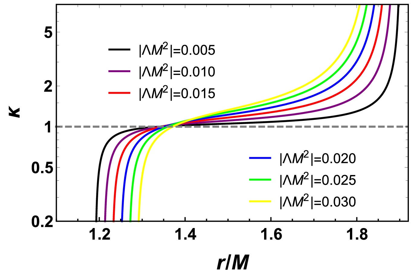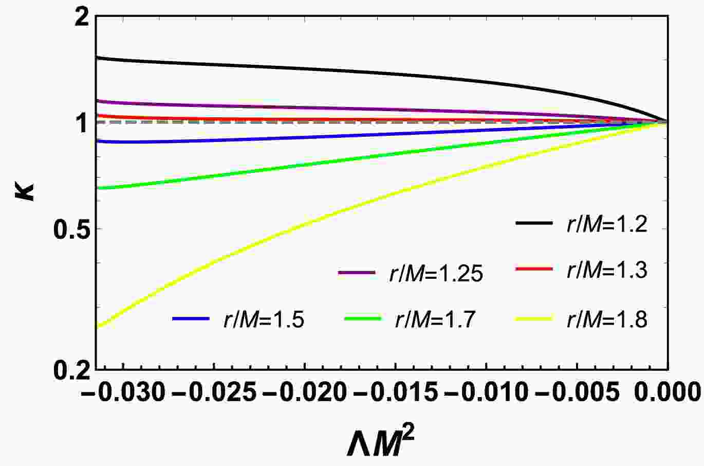 (12) Solving the above equation could yield the corotating orbital radius of the photon around the black hole, which we demonstrate to depend functionally on the mass M, spin a, and cosmological constant Λ. Because the analytical expression is more complex, we employ numerical methods to investigate the orbit characteristics.