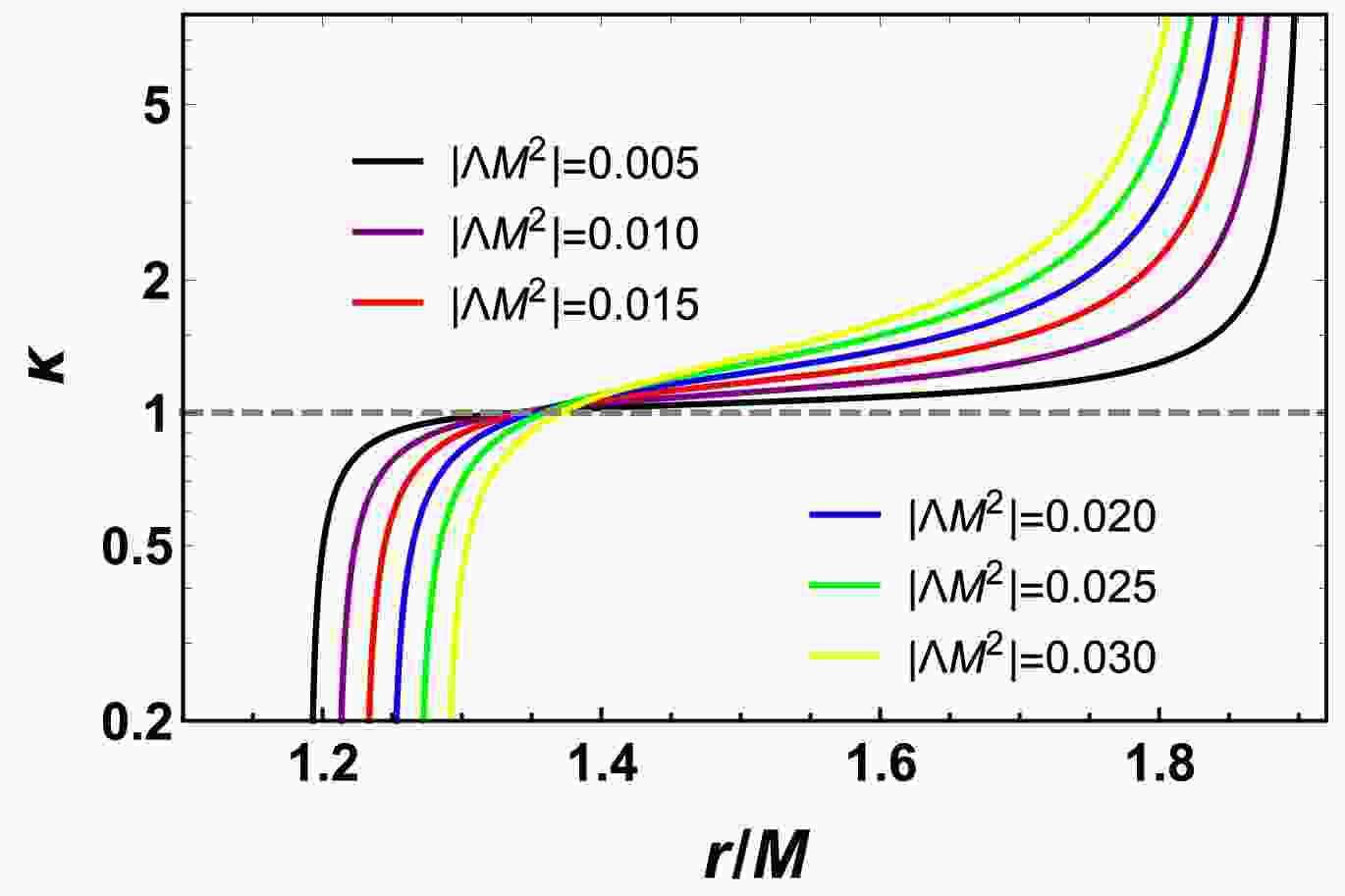 $ U(r) = [E(a^2\sin^2\theta + \rho^2) - aL\Sigma]^2 - \Delta_r[(L\Sigma - aE)^2 + K] $ and$ U(\theta)= \Delta_\theta[(L\Sigma-aE)^2+K]-(L\Sigma \csc\theta-aE\sin\theta)^2 $ are non-negative definite functions of r and θ, respectively. A photon along the circular orbit in the equatorial plane should satisfy the following conditions:$ \begin{aligned}[b] U(r_{{\rm{LR}}})=0,\qquad\dfrac{{\rm{d}} U(r_{LR})}{{\rm{d}} r}=0. \end{aligned} $