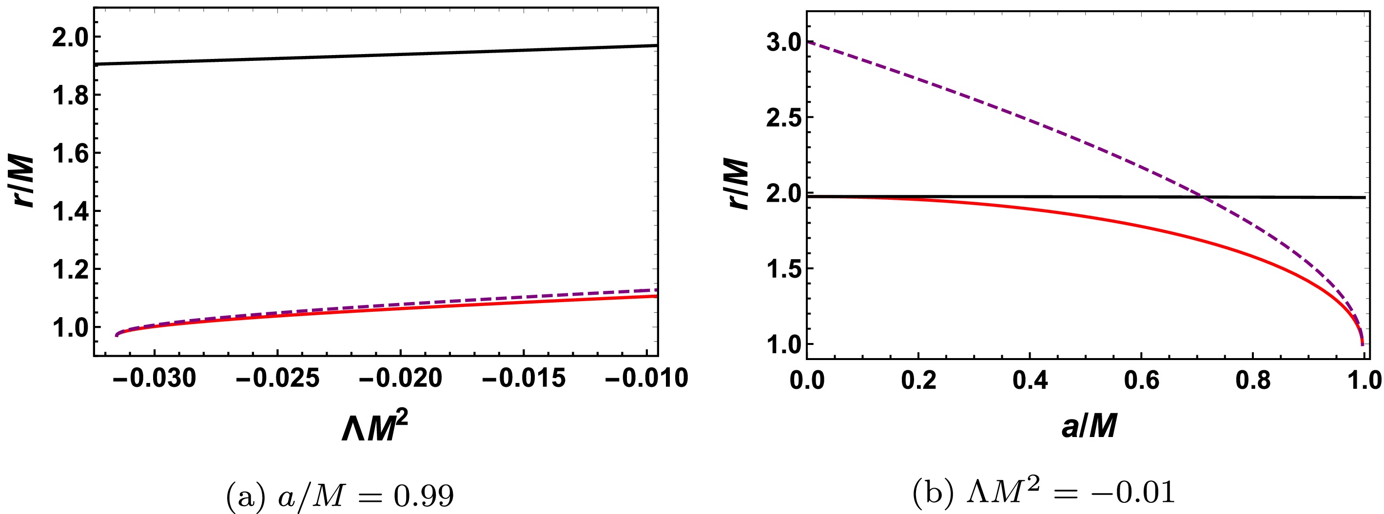 $ r_+ $ , outer ergosphere boundary$ r_{\rm{E}} $ , and circular corotating photon orbit$ r_{{\rm{LR}}} $ are described by the red solid curves, black solid curves, and purple dashed curves, respectively. (a)$ r/M $ vs.$ \Lambda M^2 $ . (b)$ r/M $ vs.$ a/M $ . -