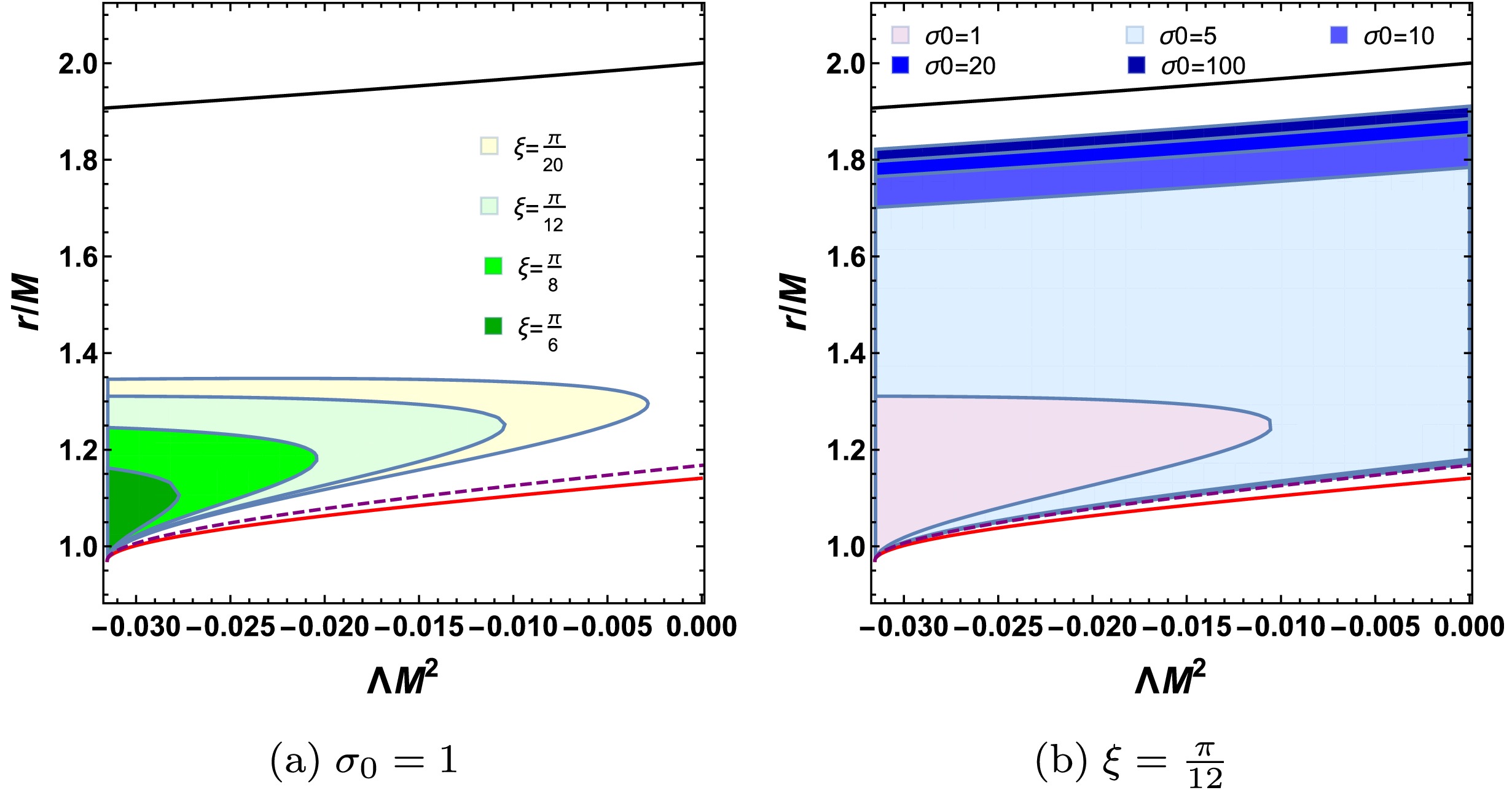 $ \Lambda M^2-r/M $ satisfying the energy extraction condition$ \epsilon^\infty_{-}<0 $ with$ a/M=0.99 $ . Red solid curves, black solid curves, and purple dashed curves represent the radii of the outer event horizon$ r_+ $ , outer ergosphere boundary$ r_{\rm{E}} $ , and circular corotating photon orbit$ r_{{\rm{LR}}} $ , respectively. (a)$ \sigma_0=1 $ with$ \xi=\dfrac{\pi}{6} $ ,$ \dfrac{\pi}{8} $ ,$ \dfrac{\pi}{12} $ ,$ \dfrac{\pi}{20} $ . (b)$ \xi=\dfrac{\pi}{12} $ with$ \sigma_0 $ =1, 5, 10, 20, 100.