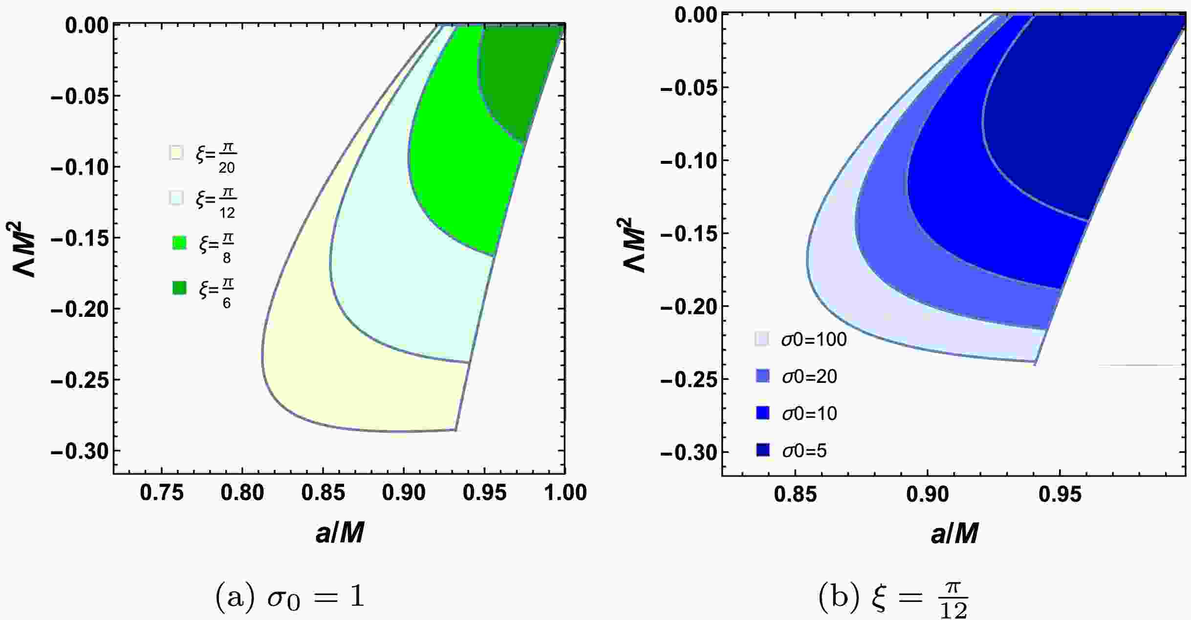 $ a/M-\Lambda M^2 $ satisfying the energy extraction condition$ \epsilon^\infty_{-}<0 $ with$ a/M=0.99 $ . The right boundaries of the shaded regions in both subplots correspond to the relationship curves between$ a/M $ and$ \Lambda M^2 $ when the Kerr-AdS black hole is an extremal black hole. (a)$ \sigma_0=1 $ with$ \xi=\dfrac{\pi}{6} $ ,$ \dfrac{\pi}{8} $ ,$ \dfrac{\pi}{12} $ ,$ \dfrac{\pi}{20} $ . (b)$ \xi=\dfrac{\pi}{12} $ with$ \sigma_0 $ =1, 5, 10, 20, 100.First, in Fig. 5, we delineate the regions in the parameter space of