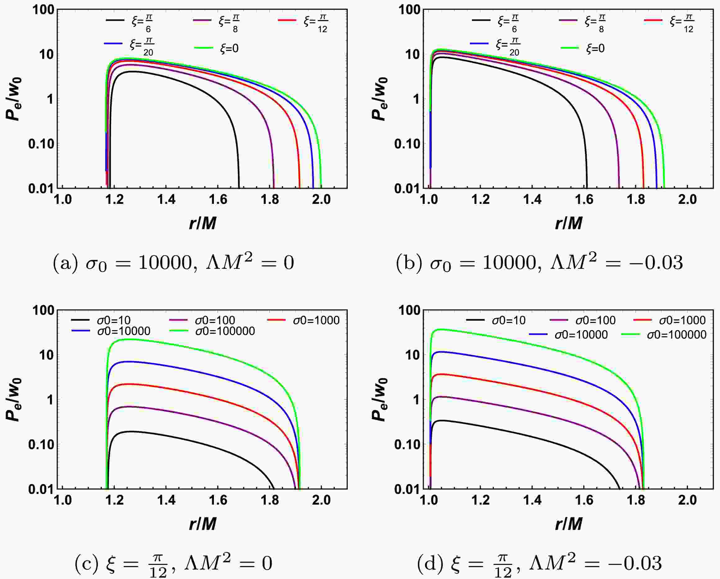 $ A_{{\rm{in}}} $ denotes the cross-sectional area of the inflowing plasma, which for rapidly spinning black holes is approximately$ A_{{\rm{in}}}\sim(r_{\rm{E}}^2-r_{{\rm{LR}}}^2) $ . The plasma inflow four-velocity is represented by$ U_{{\rm{in}}} $ , typically$ U_{{\rm{in}}}={\cal{O}}(10^{-1}) $ for the collisionless regime and$ U_{{\rm{in}}}={\cal{O}}(10^{-2}) $ for the collisional regime, as discussed in [76], with$ U_{{\rm{in}}} $ set at 0.1 for this analysis. Consequently, the power per unit enthalpy can be furhter expressed as$ \begin{aligned}[b] P_{{\rm{extr}}}/\omega_0=-0.1\epsilon^\infty_-(r_{\rm{E}}^2-r_{{\rm{LR}}}^2). \end{aligned} $