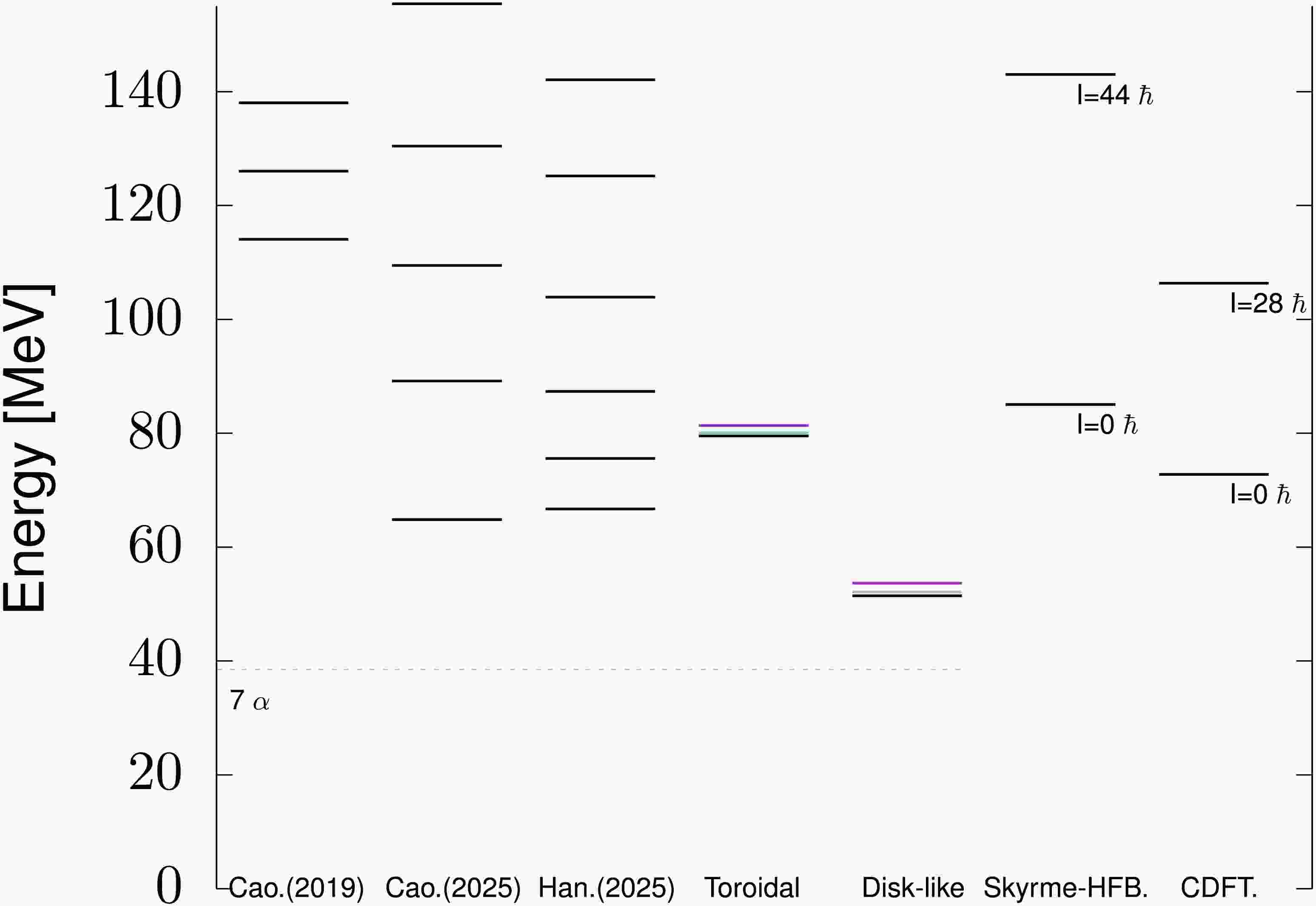 $ et ~~ al. $ [5] and Hannaman$ et ~~ al. $ [26, 27] faced limitations that prevented direct observation of the initial geometric configuration or determination of its angular momentum, and their identification of possible resonance peaks necessarily involved a degree of dependence on prior theoretical assumptions. Nevertheless, the energy intervals associated with the inferred toroidal configurations remain broadly consistent across various studies based on these two datasets [5, 28, 40]. Cao$ et ~~ al. $ [5] reported three resonance peaks extracted from their analysis; these values are listed in the first column. Hannaman$ et ~~ al. $ [26, 27] did not identify resonance peaks in their original analysis, yet subsequent studies suggested that several peaks may indeed be present in their dataset [40]. More recently, Depastas$ et ~~ al. $ [28] reanalyzed both experiments using an artificial-intelligence model trained on data from the rotating silicon HαC system, and extracted additional resonance peaks from each dataset. The peaks obtained by Depastas$ et ~~ al. $ from the dataset of Cao$ et ~~ al. $ are listed in the second column, while those from the dataset of Hannaman$ et ~~ al. $ are shown in the third column. The fourth and fifth columns present our theoretical predictions: the results for the toroidal configurations are listed in the fourth column, while those for the disk-like configurations are shown in the fifth column. Columns six through seven summarize some additional mean-field model theoretical calculations reported in the literature, including the result of the HFB calculations by Staszczak$ et ~~ al. $ [24] (sixth column) and the result of CDFT calculations by Ren$ et ~~ al. $ [29] (seventh column).We first examine the numerical stability of the resulting levels with respect to enlarging the basis set, and the spectra shown in Fig. 3 remain robust within the tested ranges. Since the present 7α model space is constructed under specific geometrical constraints rather than to reproduce the exact ground state of