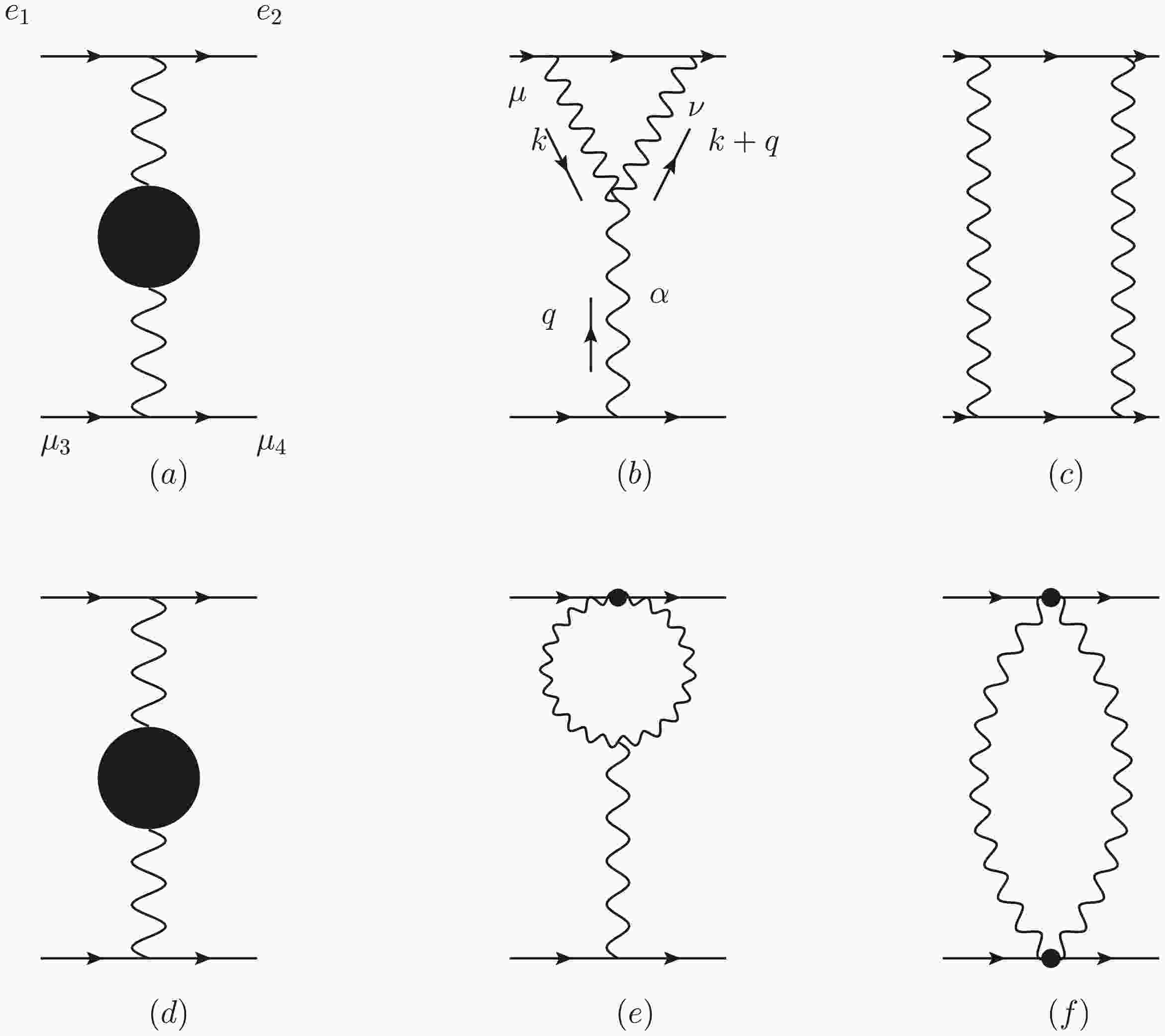 $ m_e $ ,$ m_{\mu} $ . In terms of self-energy, vertex, and box contributions,$ T_1 $ ,$ T_2 $ , and$ T_3 $ correspondingly contribute to the total expression:$ \begin{array}{l} T(s,t,m_e,m_{\mu})=T_1(t)+T_2(t,m_e,m_{\mu})+T_3(s,t,m_e,m_{\mu}) \end{array} $