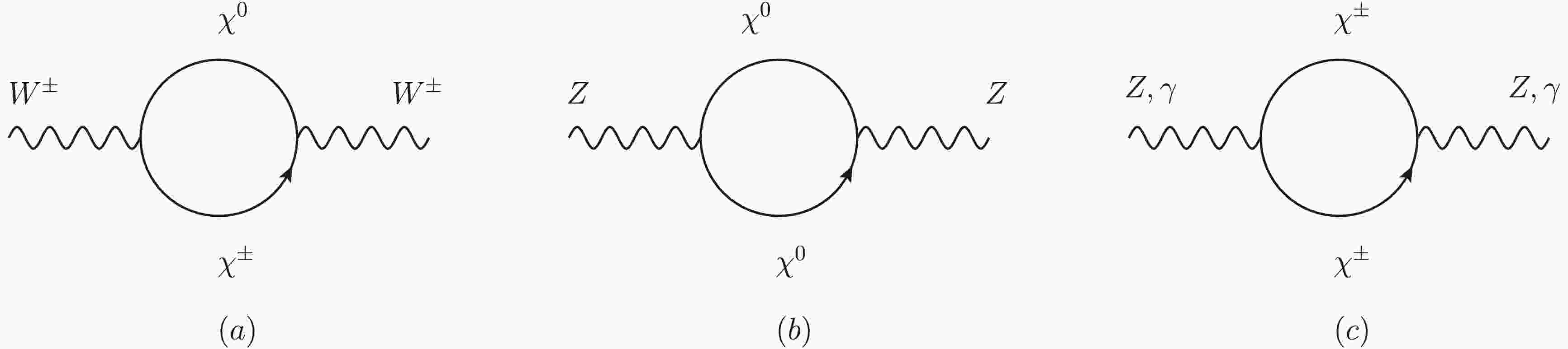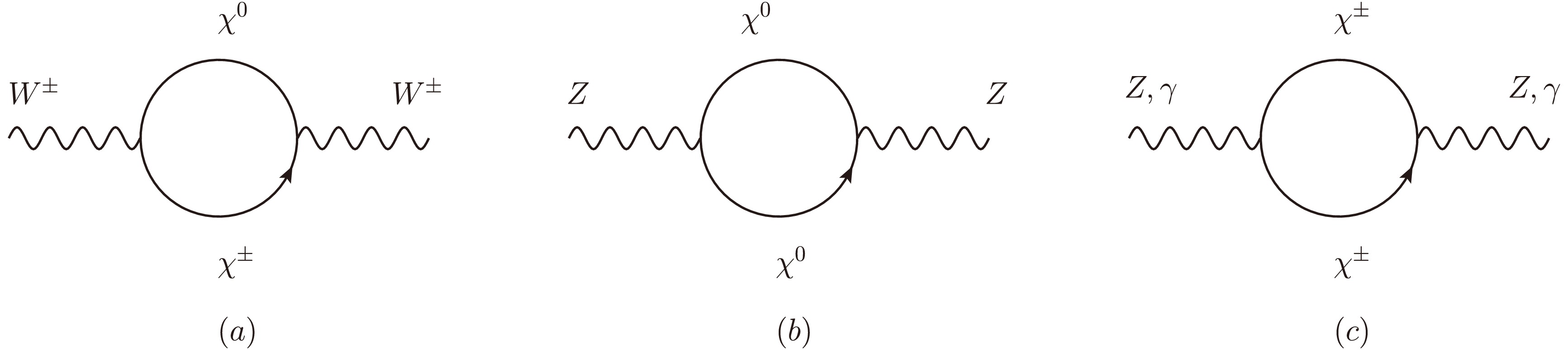 $ \begin{aligned}[b] \mathcal{C}_1^{WW}=\;&-\frac{c_W^2 G^2}{4}[4U^*_{j1}N_{i2}N^*_{i2}U_{j1}+2U^*_{j2}N_{i3}N^*_{i3}U_{j2}+2\sqrt{2}(U^*_{j1}N_{i2}N^*_{i3}U_{j1}+h.c.)\\ &+4V^*_{j1}N_{i2}N^*_{i2}V_{j1}+2V^*_{j2}N_{i4}N^*_{i4}V_{j2}-2\sqrt{2}(V^*_{j1}N_{i2}N^*_{i4}V_{j2}+h.c.)],\\ \mathcal{C}_2^{WW}=\;&-\frac{c_W^2 G^2}{4}[4U^*_{j1}N_{i2}V^*_{j1}N_{i2}-2U^*_{j2}N_{i3}V^*_{j2}N_{i4}-2\sqrt{2}U^*_{j1}N_{i2}V^*_{j2}N^*_{j4}+2\sqrt{2}U^*_{j2}N_{i3}V_{i1}N^*_{j2}\\ &+4N^*_{j2}U_{1}N^*_{j2}V_{i1}+2N^*_{j3}U_{i2}N^*_{j4}V_{i2}-2\sqrt{2}N^*_{j2}U_{i1}N^*_{j4}V_{i2}+2\sqrt{2}N^*_{j3}U_{i2}N^*_{j2}V_{i1}],\\ \mathcal{C}_1^{\gamma\gamma}=\;&-\frac{e^2}{4}[4U^*_{j1}U_{i1}U^*_{i1}U_{j1}+4U^*_{j2}U_{i2}U^*_{i2}U_{j2}+4(U^*_{j1}U_{i1}U^*_{i2}U_{j2}+h.c.)\\ &+4V^*_{j1}V_{i1}V^*_{i1}V_{j1}+4V^*_{j2}V_{i2}V^*_{i2}V_{j2}+4(V^*_{j1}V_{i1}V^*_{i2}V_{j2}+h.c.)],\\ \mathcal{C}_2^{\gamma\gamma}=\;&-\frac{e^2}{4}[4U^*_{j1}U_{i1}V_{j1}V^*_{i1}+4U^*_{j2}U_{i2}V_{j2}V^*_{i2}+4U^*_{j1}U_{i1}V_{j2}V^*_{i2}+4U^*_{j2}U_{i2}V_{j1}V^*_{i1}\\ &+4V^*_{j1}V_{i1}U_{j1}U^*_{i1}+4V^*_{j2}V_{i2}U_{j2}U^*_{i2}+4V^*_{j1}V_{i1}U_{j2}U^*_{i2}+4V^*_{j2}V_{i2}U_{j1}U^*_{i1}],\\ \widetilde{\mathcal{C}}_{1\chi^{\pm}}^{ZZ}=\;&-\frac{G^2}{4}[4c_W^4U^*_{j1}U_{i1}U^*_{i1}U_{j1}+c_{2W}^2U^*_{j2}U_{i2}U^*_{i2}U_{j2}+2c_W^2c_{2W}(U^*_{j1}U_{i1}U^*_{i2}U_{j2}+h.c.)\\ &+4c_W^4V^*_{j1}V_{i1}V^*_{i1}V_{j1}+c_{2W}^22V^*_{j2}V_{i2}V^*_{i2}V_{j2}+2c_W^2c_{2W}(V^*_{j1}V_{i1}V^*_{i2}V_{j2}+h.c.)],\\ \widetilde{\mathcal{C}}_{2\chi^{\pm}}^{ZZ}=\;&-\frac{G^2}{4}[4c_W^4U^*_{j1}U_{i1}V_{j1}V^*_{i1}+c_{2W}^2U^*_{j2}U_{i2}V_{j2}V^*_{i2}+2c_W^2c_{2W}(U^*_{j1}U_{i1}V_{j2}V^*_{i2}+h.c.)\\ &+4c_W^4V^*_{j1}V_{i1}U_{j1}U^*_{i2}+c_{2W}^2V^*_{j2}V_{i2}U_{j2}U^*_{i2}+2c_W^2c_{2W}(V^*_{j1}V_{i1}U_{j2}U^*_{i2}+h.c.)],\\ \widetilde{\mathcal{C}}_{1\chi^0}^{ZZ}=\;&-2\frac{G^2}{4}(N^*_{j3}N_{i3}-N^*_{j4}N_{i4})^2,\\ \widetilde{\mathcal{C}}_{2\chi^0}^{ZZ}=\;&2\frac{G^2}{4}(N^*_{j3}N_{i3}-N^*_{j4}N_{i4})^2,\\ \widetilde{\mathcal{C}}_1^{Z\gamma}=\;&-\frac{eG}{4}[4c_W^2U^*_{j1}U_{i1}U^*_{i1}U_{j1}+2c_{2W}U^*_{j2}U_{i2}U^*_{i2}U_{j2}+2c_{2W}U^*_{j1}U_{i1}U^*_{i2}U_{j2}+4c_W^2U^*_{j2}U_{i2}U^*_{i1}U_{j1}+4c_W^2V^*_{j1}V_{i1}V^*_{i1}V_{j1}\\ &+2c_{2W}V^*_{j2}V_{i2}V^*_{i2}V_{j2}+2c_{2W}V^*_{j1}V_{i1}V^*_{i2}V_{j2}+4c_W^2V^*_{j2}V_{i2}V^*_{i1}V_{j1}],\\ \widetilde{\mathcal{C}}_2^{Z\gamma}=\;&-\frac{eG}{4}[4c_W^2U^*_{j1}U_{i1}V_{j1}V^*_{i1}+2c_{2W}U^*_{j2}U_{i2}V_{i2}V^*_{j2}+2c_{2W}U^*_{j1}U_{i1}V_{j2}V^*_{i2}+4c_W^2U^*_{j2}U_{i2}V_{j1}V^*_{i1}+4c_W^2V^*_{j1}V_{i1}U_{j1}U^*_{i1}\\ &+2c_{2W}V^*_{j2}V_{i2}U_{j2}U^*_{i2}+2c_{2W}V^*_{j1}V_{i1}U_{j2}U^*_{i2}+4c_W^2V^*_{j2}V_{i2}U_{j1}U^*_{i1}]. \label{cf} \end{aligned} $