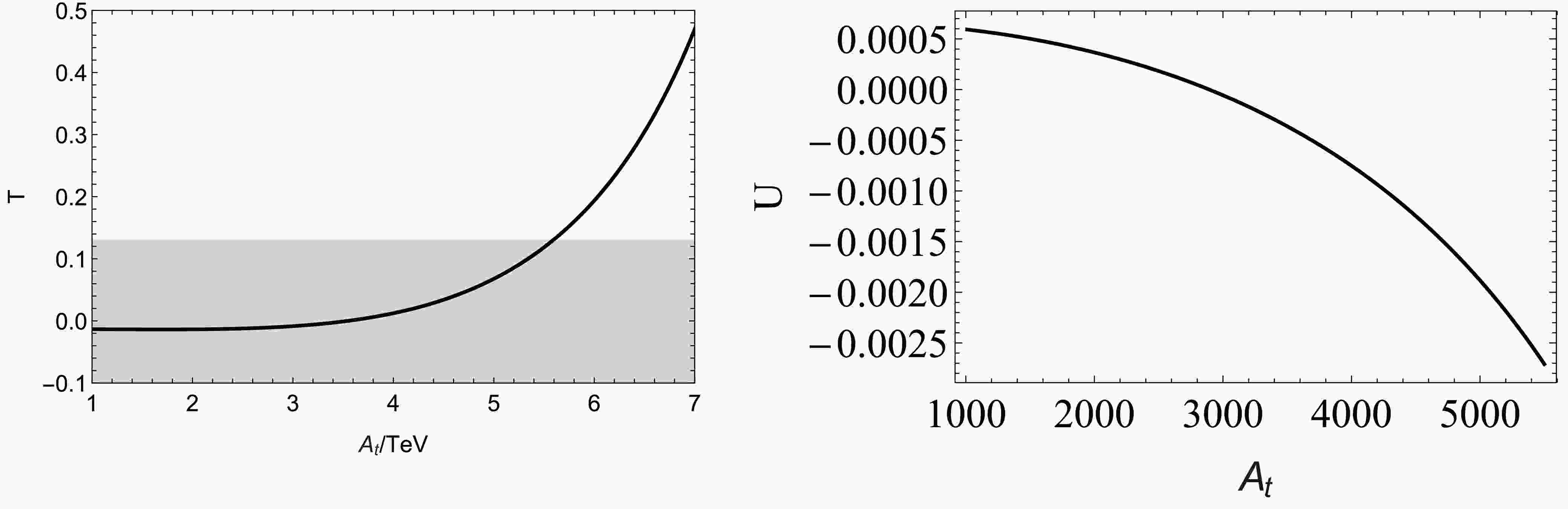 $ A_t $ parameter varies from$ 1000\; \rm GeV $ to$ 7000\; \rm GeV $ . The gray area indicates one standard deviation of the experimental observations. As shown, the T parameter increases with the rise in$ A_t $ , while the U parameter exhibits the opposite trend. The observed changes in the T and U parameters in Fig. 4 are primarily due to the contributions from the Feynman diagrams involving squark fields as loop particles. The$ A_t $ parameter, originating from the off-diagonal elements of the squark mass matrix, influences the mixing between the left-handed and right-handed$ \widetilde{u} $ squarks ($ \widetilde{u}_L $ and$ \widetilde{u}_R $ ), which in turn drives the squark sector's contributions to the oblique parameters.To genuinely highlight the distinctive features of the B-LSSM as opposed to the MSSM, it is essential to illustrate how the extended gauge sector parameters influence the electroweak precision observables. In Fig. 5, we present the dependence of the S, T, and U parameters on the unique B-LSSM parameters: the gauge kinetic mixing coupling
