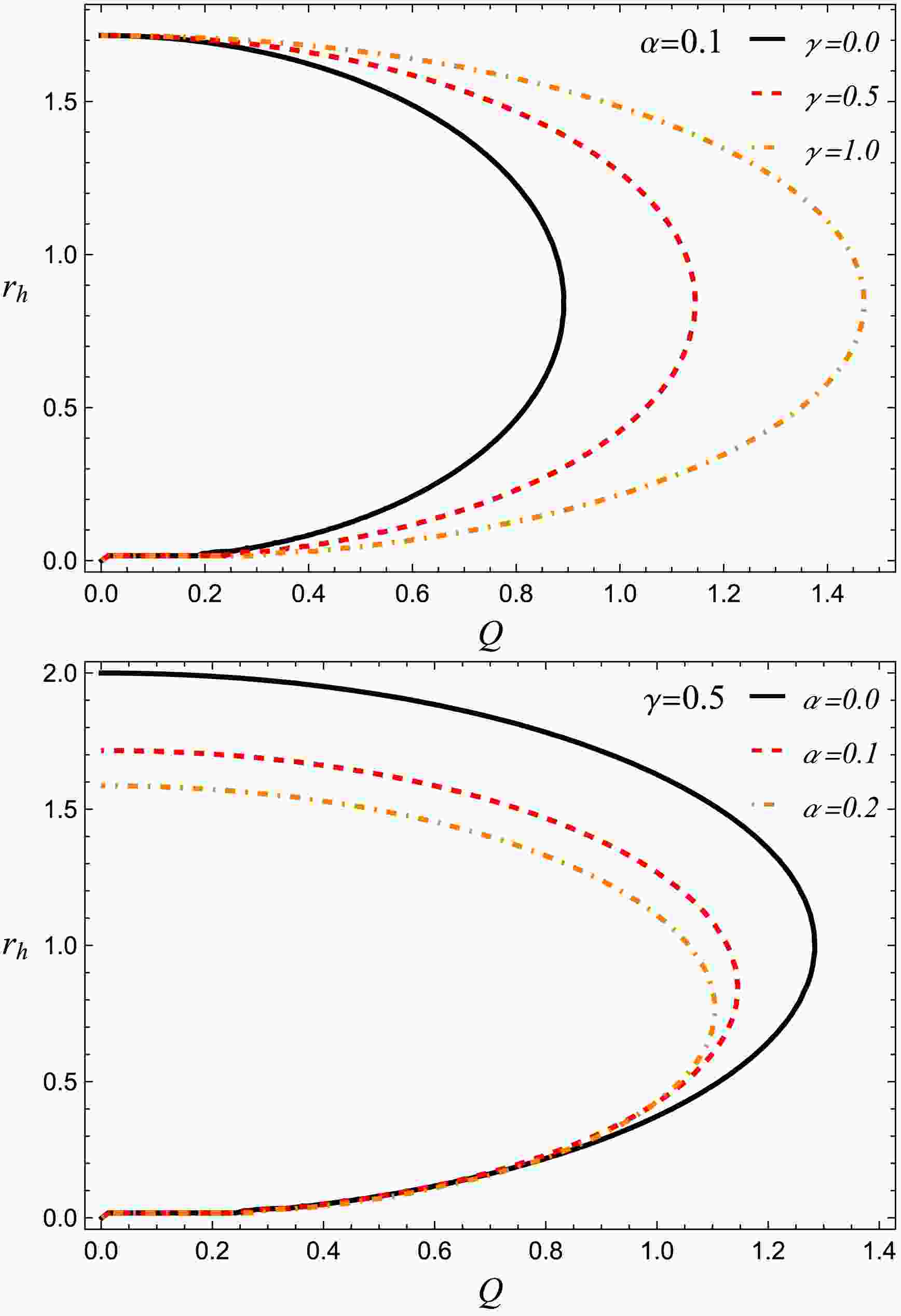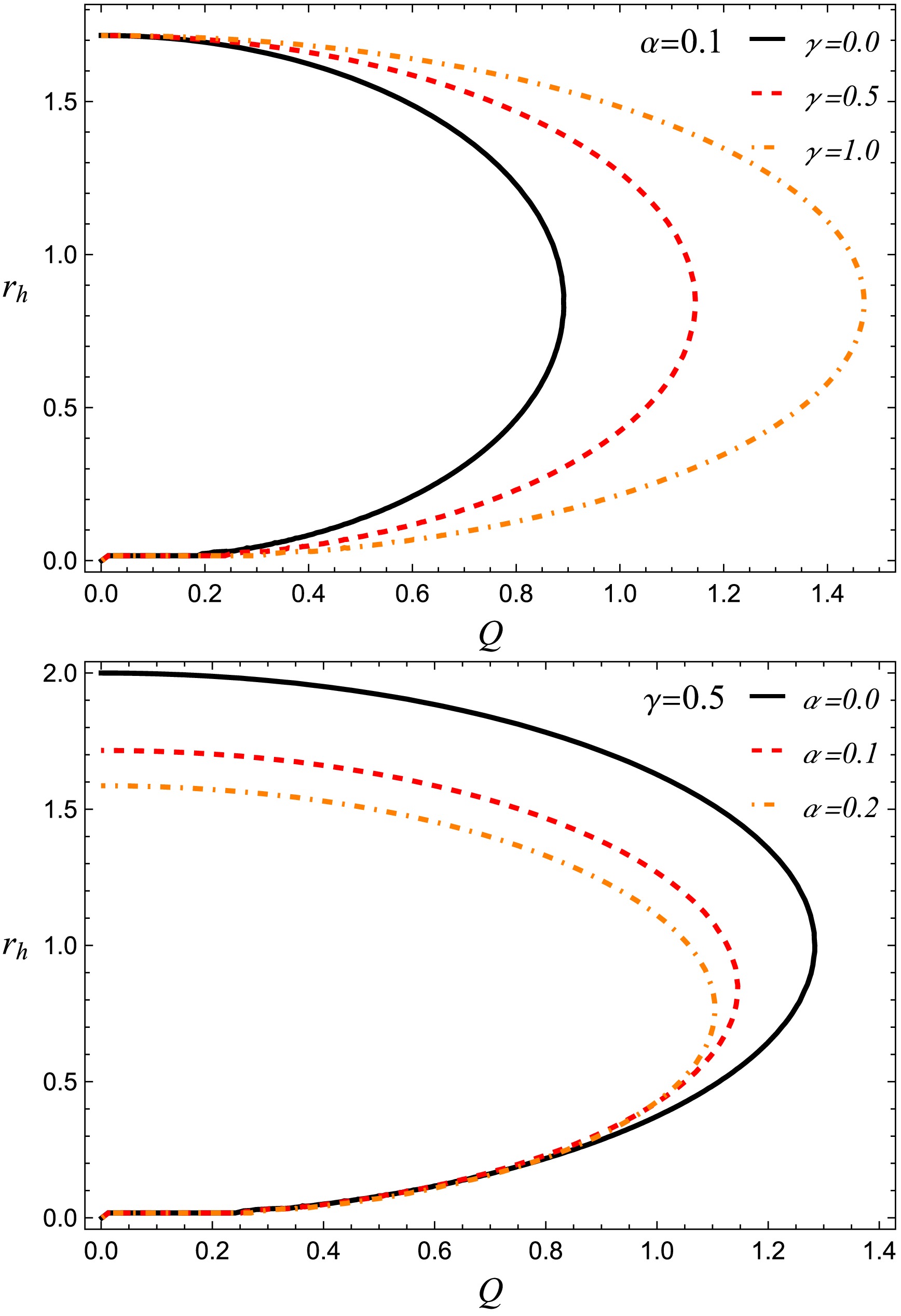 $ r_h $ of ModMax charged black holes in PFDM on the electric charge Q. In the top panel, with fixed α,$ r_h $ gradually decreases as Q increases; however, the rate of this decrease slows with growing γ. At small γ,$ r_h $ drops rapidly, whereas at large γ it falls slowly, reflecting the weakening of the effective charge contribution to the metric ($ \sim e^{-\gamma} Q^2/r^2 $ ) due to ModMax nonlinearity. Thus, at the same Q, higher γ increases$ r_h $ , allowing the black hole to sustain a larger charge before reaching the extremal limit. In the bottom panel, with fixed γ,$ r_h $ also decreases with charge, but the rate of decline accelerates with increasing α. For small α, the drop is slow; for larger α, it is faster due to the enhanced PFDM contribution via the term$ \sim \frac{\alpha}{r} \ln \frac{r}{|\alpha|} $ , which increases the effective mass and compresses the horizon, resulting in a smaller$ r_h $ at the same Q and pushing the system toward extremality at lower charges.