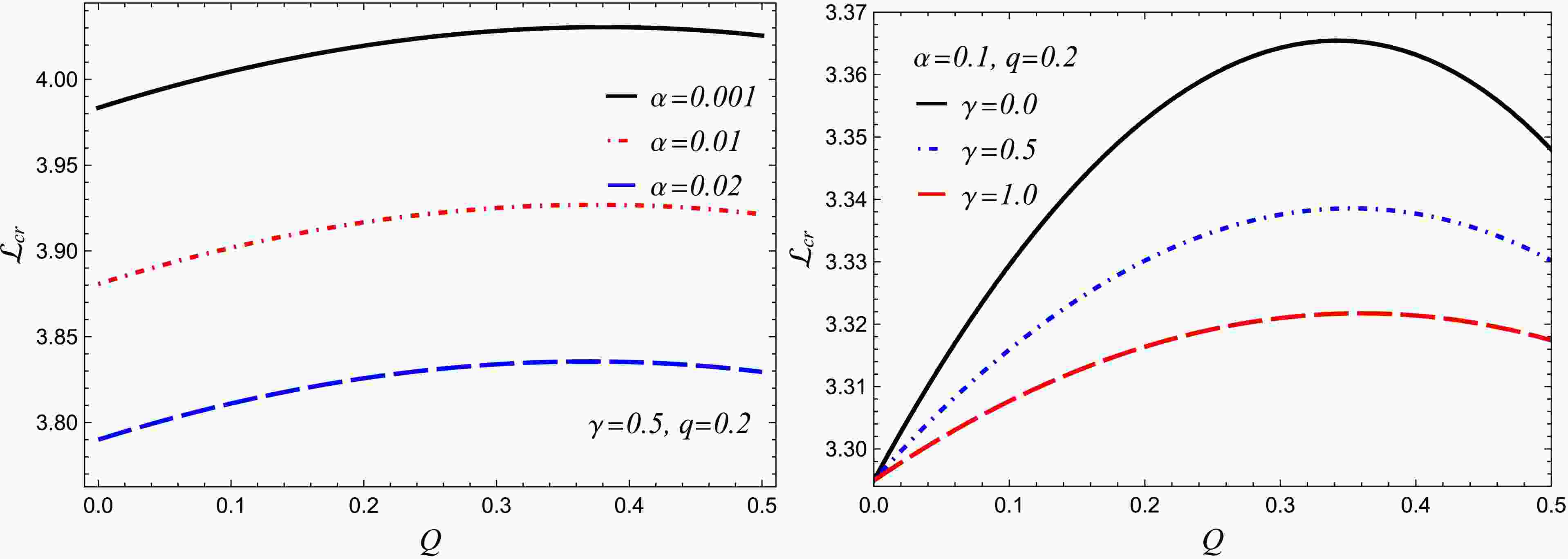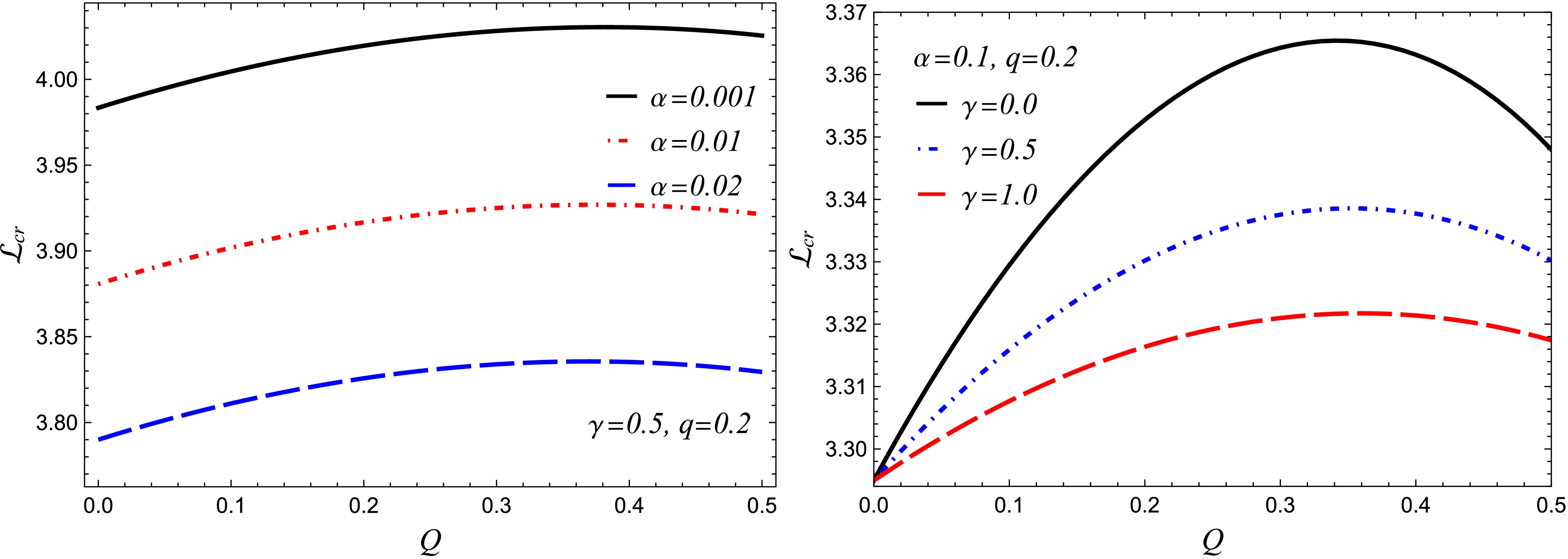 $ {\cal{L}}_{cr} $ varies with the PFDM parameter α (left panel) and the ModMax parameter γ (right panel) in the context of charged particle collisions near a ModMax BH in PFDM. The left panel shows that as the BH charge Q increases, the critical angular momentum$ {\cal{L}}_{cr} $ either slightly increases or remains nearly constant, indicating that more highly charged BHs require a slightly larger critical angular momentum. As the PFDM parameter α increases, the curve shifts downward, i.e.,$ {\cal{L}}_{cr} $ decreases, implying that PFDM exerts a weakening influence. The right panel shows that the dependence of$ {\cal{L}}_{cr} $ on BH charge Q is non-monotonic: as Q increases, the critical angular momentum first increases, reaches a maximum, and then decreases with further growth of Q. At$ Q = 0 $ , all curves coincide. Regarding the ModMax parameter γ, as γ increases, the curve shifts downward, implying that a larger γ reduces the critical angular momentum.