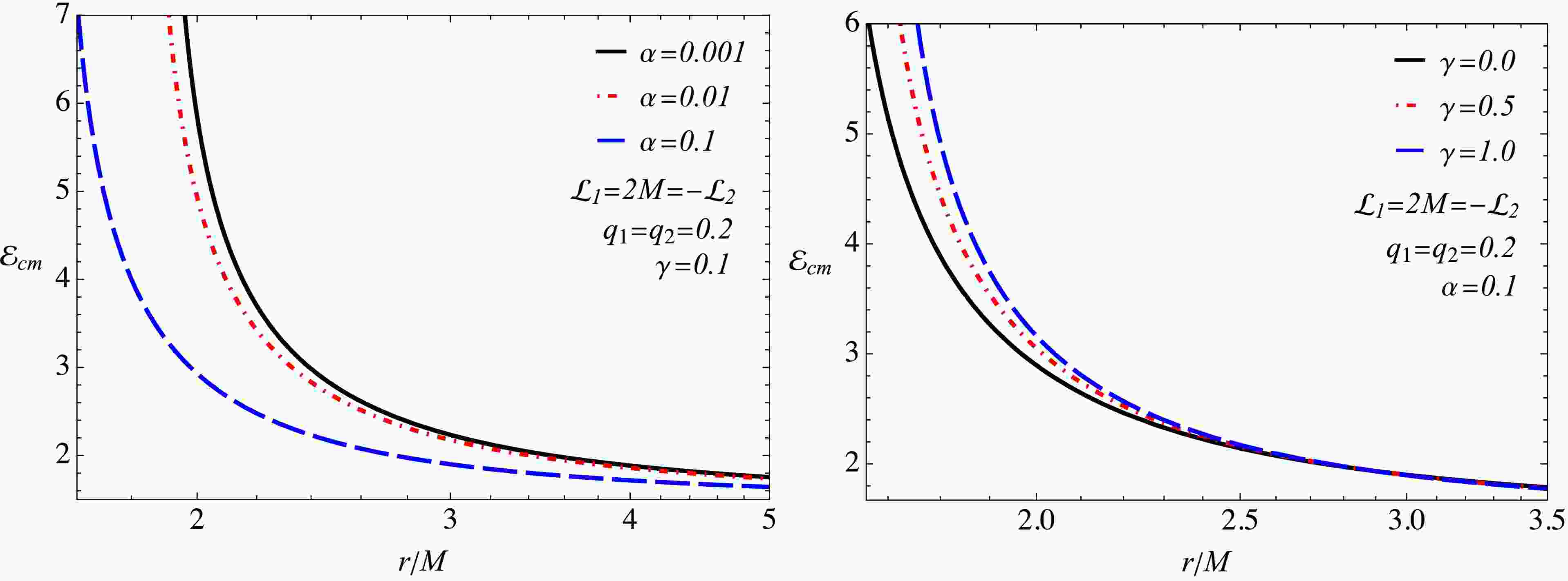 $ {\cal{L}}_{cr} $ on α (left panel) and on γ (right panel) for various values of the black-hole and particle parameters.The center-of-mass energy for such collisions is given by [52, 58]: