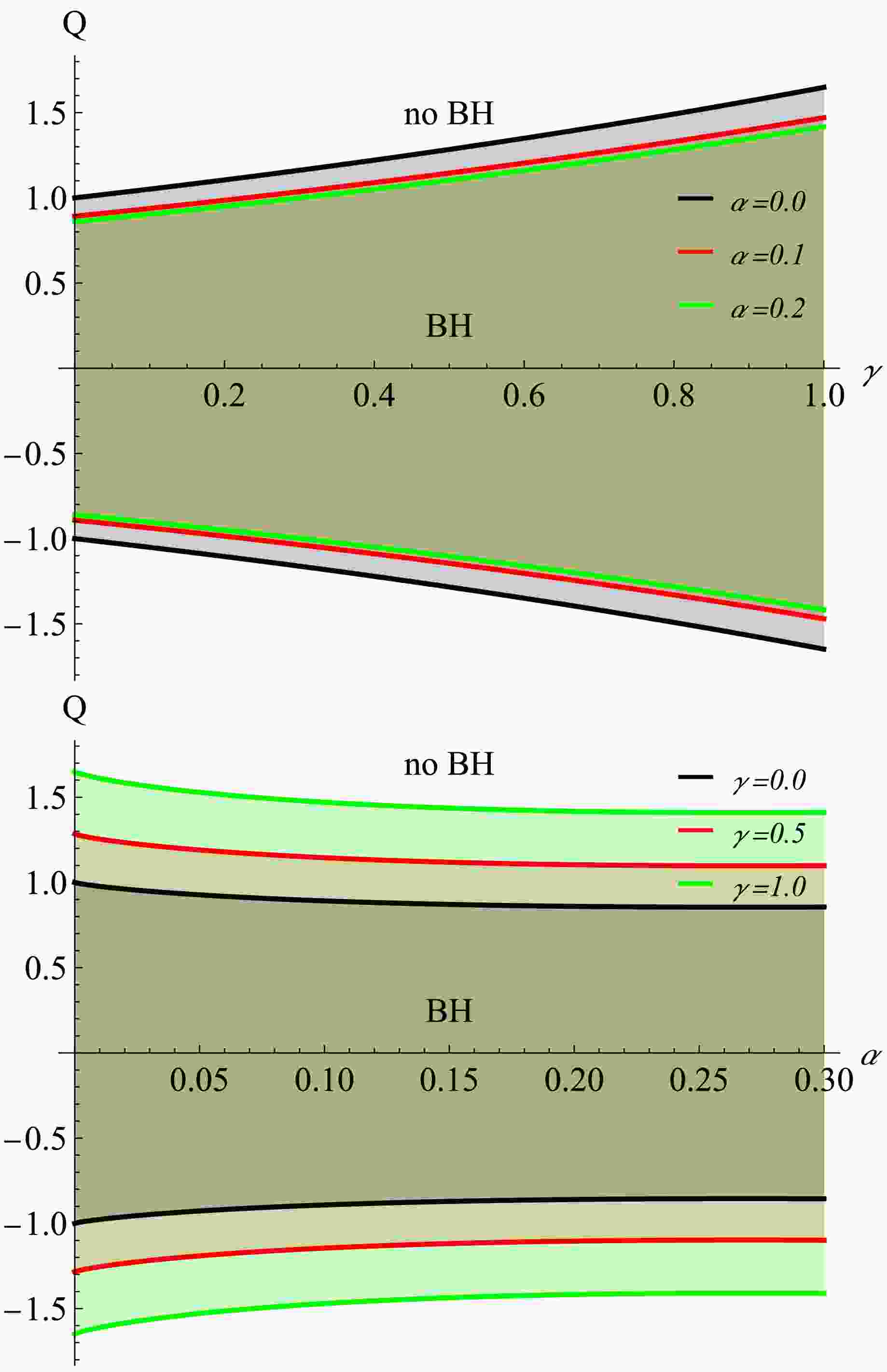 $ Q_{\mathrm{ext}} $ , allowing the BH to accumulate larger charge before reaching the extremal limit. This stems from the$ e^{-\gamma} $ screening factor in ModMax theory, which exponentially weakens the effective electromagnetic repulsion near the horizon. Consequently, a positive γ is necessary for the existence of superextremal configurations. In contrast, the bottom panel shows that increasing α slightly lowers$ Q_{\mathrm{ext}} $ , reflecting the attractive gravitational pull of the PFDM, which counteracts charge repulsion and favors extremality at smaller$ |Q| $ . Thus, γ and α have opposite effects on the horizon structure, i.e., increasing γ increases the extremal charge$ Q_{\rm{ext}} $ and thereby enlarges the region of parameter space admitting an event horizon, whereas increasing α slightly decreases$ Q_{\rm{ext}} $ and reduces the range of Q for which a black hole (rather than a naked singularity) solution exists. -