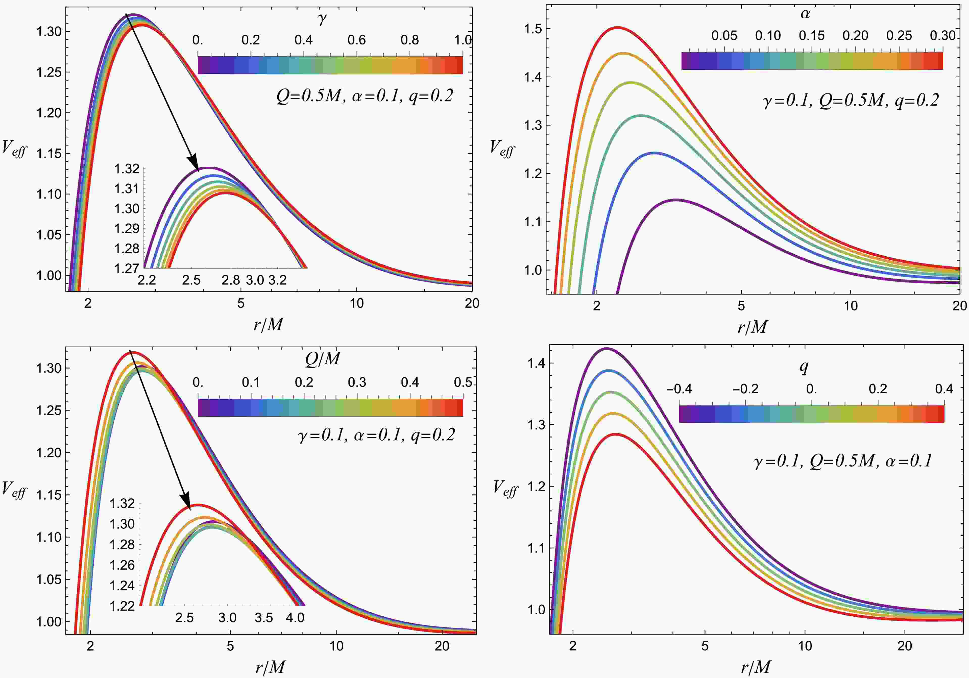 $ V_{\mathrm{eff}}(r; {\cal{L}}, q) $ governs radial motion and includes contributions from both the ModMax charge term and the PFDM logarithmic correction.Figure 3 shows the radial dependence of the effective potential for various parameters of charged ModMax BHs in PFDM. The top-left panel illustrates the effect of the ModMax parameter γ: as γ increases, the peak height decreases and its position shifts to larger radii, indicating a weakening of the potential barrier and a reduction in the effective gravitational attraction near the horizon. The top-right panel shows the dependence on the PFDM parameter α; increasing α yields a higher potential peak and shifts it toward smaller values of