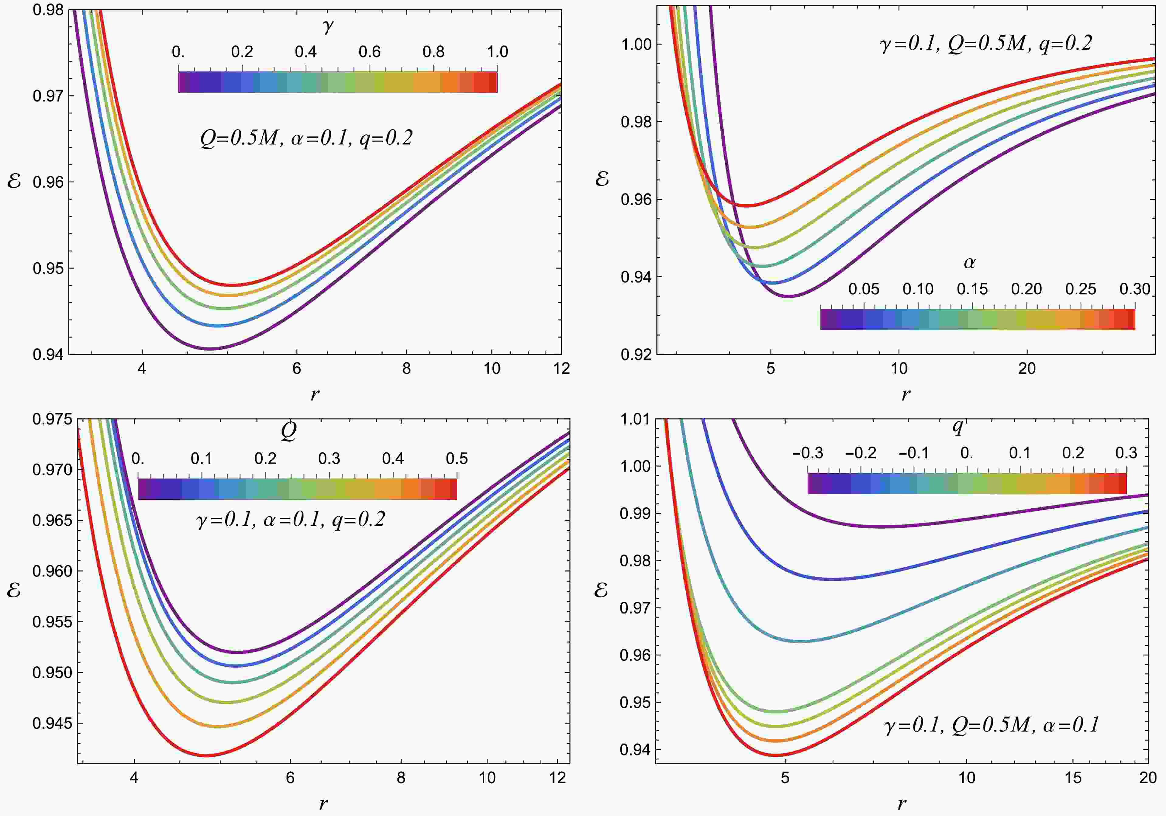 $ {\cal{E}} $ of charged particles on the radial coordinate for circular orbits around charged ModMax BHs embedded in a PFDM environment, for different model parameters. The top-left panel shows the effect of the ModMax parameter γ: as γ increases, the energy curves shift upward and their minima become shallower, indicating a weakening of the binding potential and a decrease in orbital stability. The top-right panel illustrates the effect of the PFDM parameter α; increasing α produces similar behavior—higher values of$ {\cal{E}} $ and a smoother minimum—reflecting the DM-screening effect that weakens gravitational attraction. In contrast, the bottom-left and bottom-right panels, corresponding to the parameters Q and q, exhibit the opposite trend. Increasing the BH charge Q lowers the orbital energy$ {\cal{E}} $ due to the strengthening of the electromagnetic interaction, thereby deepening the potential well; likewise, increasing the test-particle charge q (for charges of the same sign as Q) also leads to a reduction in$ {\cal{E}} $ owing to electrostatic repulsion that counteracts gravitational attraction. Taken together, these results reveal opposite influences of$ (\gamma, \alpha) $ and$ (Q, q) $ on the energetics of circular orbits: the former tend to weaken the binding field, raise energy levels, and reduce orbital stability, whereas the latter enhance the electromagnetic contribution, deepen the potential, and promote more energetically bound and potentially more stable configurations.
