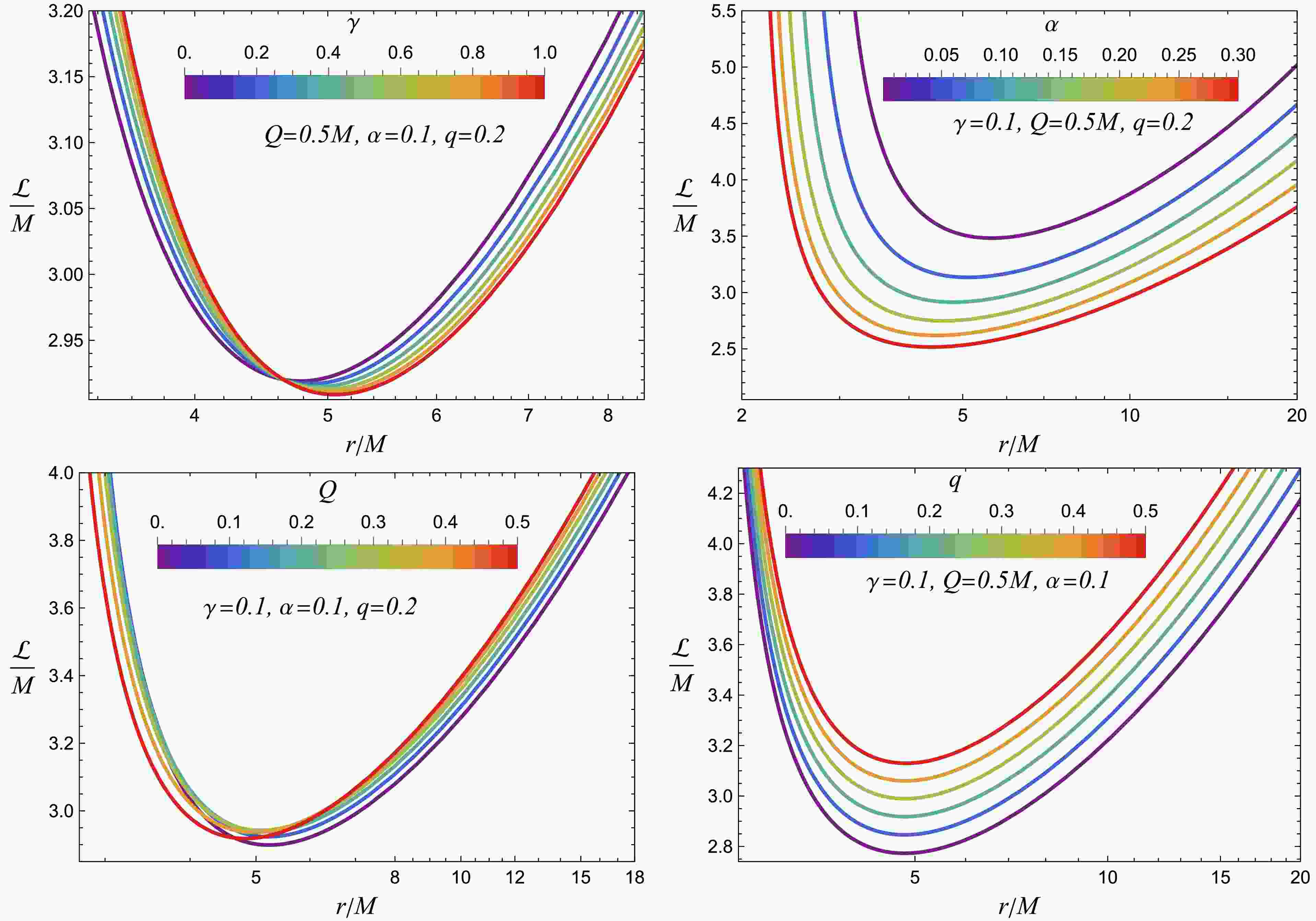 $ {\cal{L}} $ of charged particles moving in circular orbits around charged ModMax BHs embedded in a PFDM environment, for various choices of model parameters. The top-left panel illustrates the effect of the ModMax parameter γ: as γ increases, the values of$ {\cal{L}} $ decrease and the minimum becomes less pronounced, indicating a reduced contribution from nonlinear electrodynamics and a lower angular momentum required to maintain circular orbits. The top-right panel shows the influence of the PFDM parameter α. Increasing α likewise reduces$ {\cal{L}} $ and shifts the minimum toward smaller radii$ r/M $ , reflecting the weakening of the effective gravitational attraction due to the presence of PFDM. The bottom-left panel displays the effect of the BH charge Q, for which the behavior of$ {\cal{L}}(r) $ is slightly non-monotonic: at smaller Q the angular momentum increases, whereas at larger Q it decreases slightly, reflecting competition between gravitational and electromagnetic effects. Finally, the bottom-right panel illustrates the dependence on the test particle charge q; increasing q yields higher$ {\cal{L}} $ values, as electrostatic repulsion requires a larger angular momentum to maintain stable orbits.