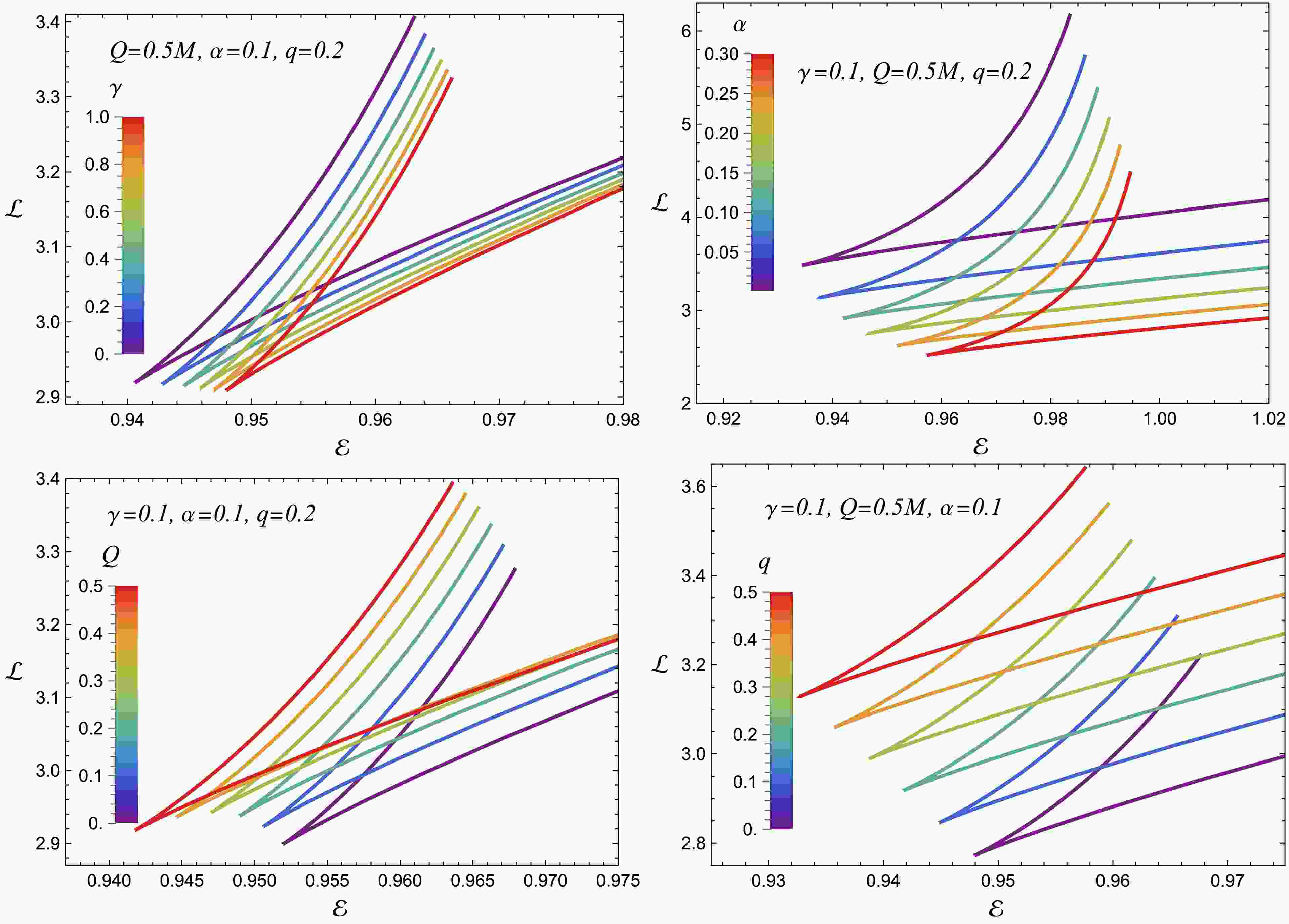 $ (\gamma, \alpha) $ tend to reduce$ {\cal{L}} $ and weaken the effective binding. By contrast, the parameters$ (Q, q) $ have the opposite effect, enhancing electromagnetic interactions and increasing the angular momentum required for stable circular motion. This contrast highlights the competing roles of nonlinear ModMax electrodynamics and charge effects in shaping particle dynamics in the ModMax–PFDM spacetime.Figure 6 shows the relationship between the energy
