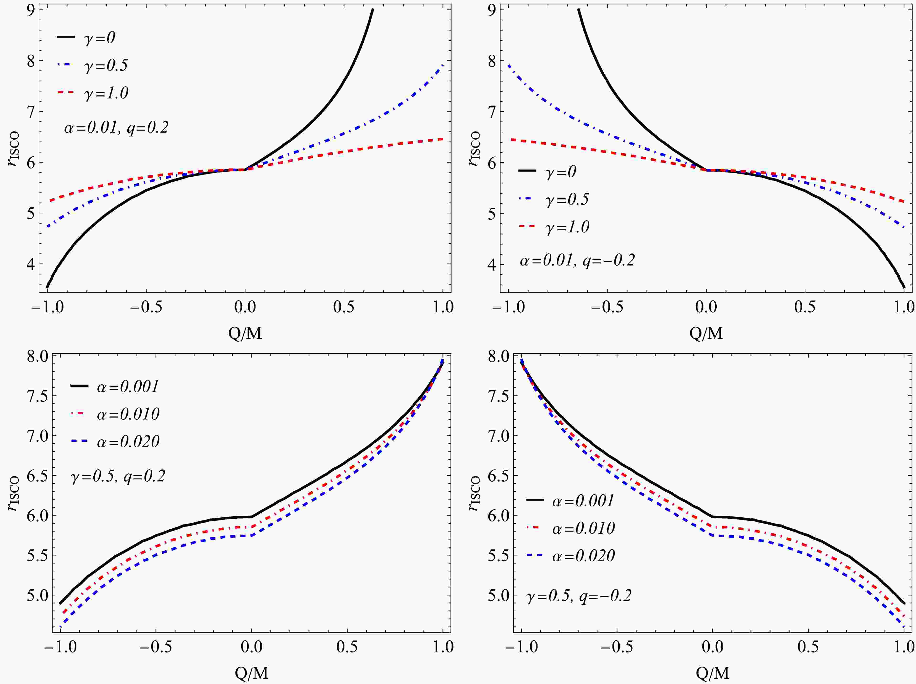$ q = -0.2 $ ). Here, the trends are reversed:$ r_{ISCO} $ decreases with increasing γ for$ Q \lt 0 $ (like-charged configuration) and increases for$ Q \gt 0 $ (oppositely charged configuration). All curves intersect near$ Q = 0 $ , where the effect of γ vanishes and$ r_{ISCO} $ coincides with the nearly-Schwarzschild value, slightly reduced by the PFDM contribution.The bottom-left panel illustrates the effect of the PFDM parameter α for a positively charged particle. The ISCO radius grows with Q due to Coulomb repulsion, while increasing α reduces