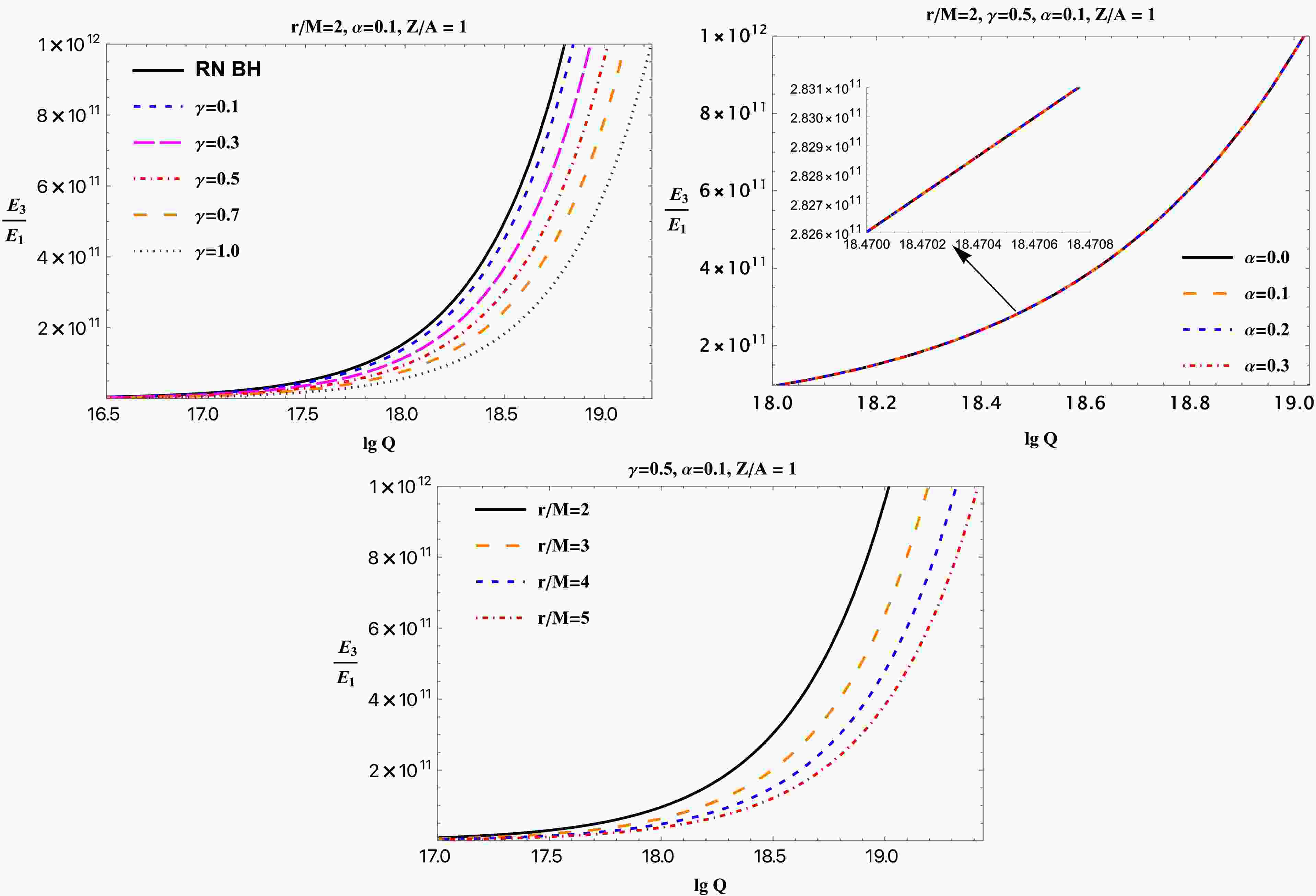 $ E_3/E_1 $ as a function of the BH electric charge for several values of the ModMax parameter γ. The solid black curve represents the RN BH, the reference case. As γ increases, the curves shift downward, indicating that a larger γ weakens the efficiency of particle energy extraction (acceleration). For the same Q, BHs with higher γ yield smaller$ E_3/E_1 $ , showing that the electromagnetic nonlinearity suppresses the Coulomb-driven energy gain. The top-right panel displays the effect of the PFDM parameter α on the efficiency. For all values of α, the curves are nearly identical because α does not contribute to the Coulomb interaction (20), which provides the dominant contribution to the efficiency (41). The bottom panel shows the dependence on the ionization point: the farther the ionization occurs, the less efficient the electric Penrose process becomes, owing to the weakening of the Coulomb interaction.Although the electric Penrose process considered here is formulated at the level of test-particle dynamics, it is instructive to place the extracted energies in a broader astrophysical context. In the stellar-mass and supermassive black hole cases, the characteristic energies released by the process are comparable, on a per-particle basis, to those associated with ultra-high-energy cosmic-ray protons and with relativistic jets in active galactic nuclei. However, the present analysis does not provide a realistic model of such complex astrophysical phenomena. Instead, the electric Penrose process serves as an idealized mechanism for quantifying the maximum energy extraction in near-horizon black-hole geometries and electromagnetic field configurations. In this sense, the results provide theoretical upper bounds on the energies of accelerated charged particles and qualitative insights into how ModMax electrodynamics and dark matter may influence energetic processes in strong-gravity regimes.