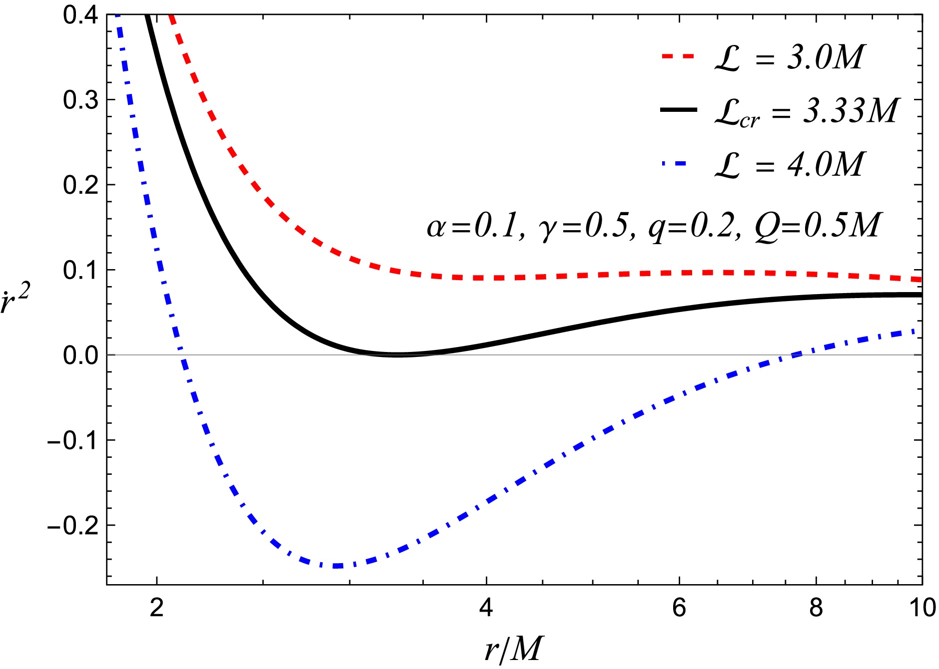 $ \sigma = 1 $ . Introducing the specific energy$ {\cal{E}} = E/m $ and setting$ m = 1 $ for simplicity (as is common in such analyses), the radial equation becomes:$ \begin{aligned}[b] \dot{r}^{2} =\;& \left( {\cal{E}} - \frac{q e^{-\gamma} Q}{r} \right)^{2} - f(r) \left( 1 + \frac{{\cal{L}}^{2}}{r^{2}} \right) \\ \equiv\;& {\cal{E}}^{2} - V_{\mathrm{eff}}(r; {\cal{L}}, q). \end{aligned} $