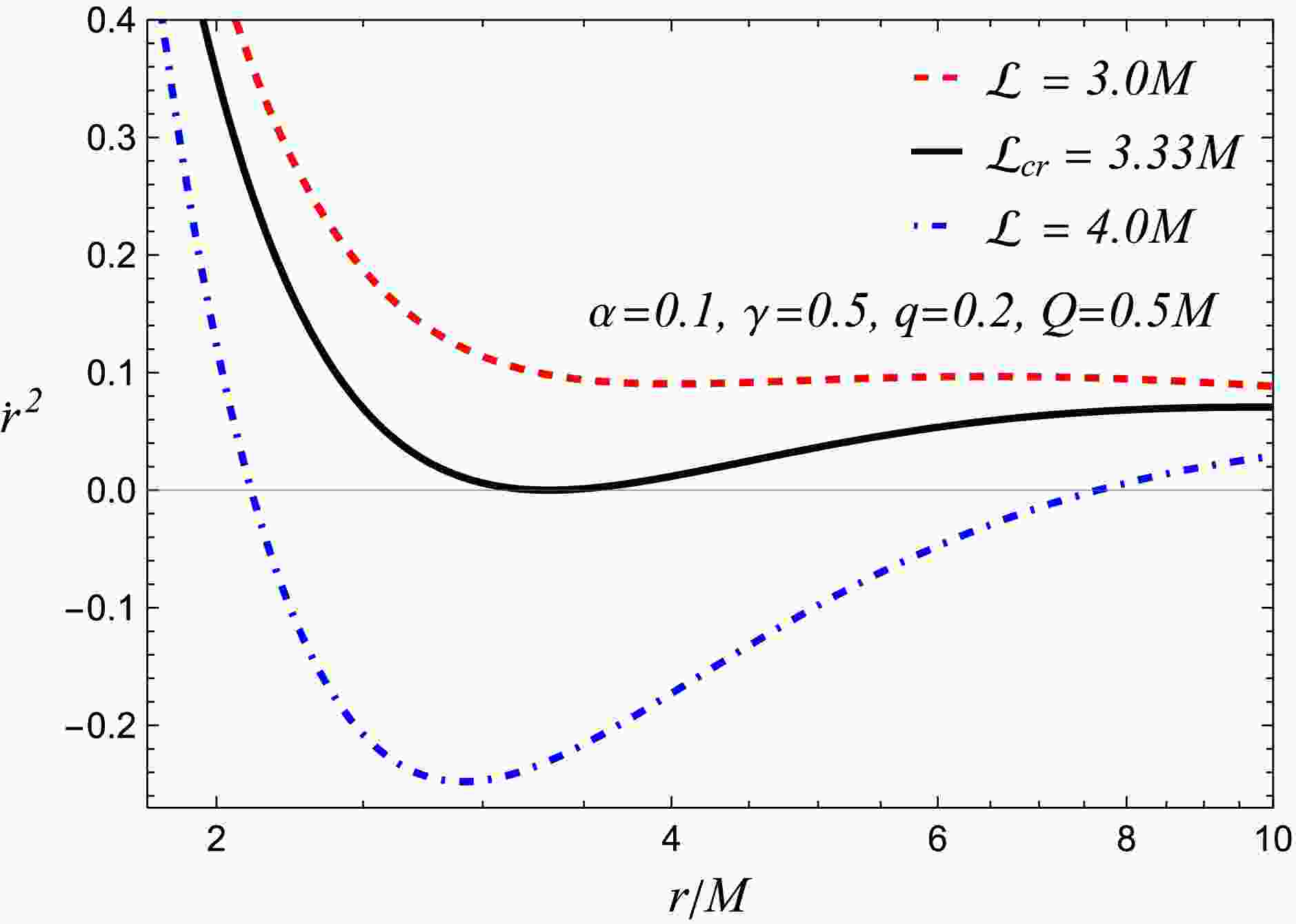 $ \theta = \pi/2 $ , with$ \dot{\theta} = 0 $ . Then$ \begin{aligned}[b]& \dot{t} = \frac{{\cal{E}}}{f(r)}-\frac{q e^{-\gamma} Q}{m r f(r)},\\ &\dot{\phi} = \frac{{\cal{L}}}{ r^{2}}, \end{aligned} $
