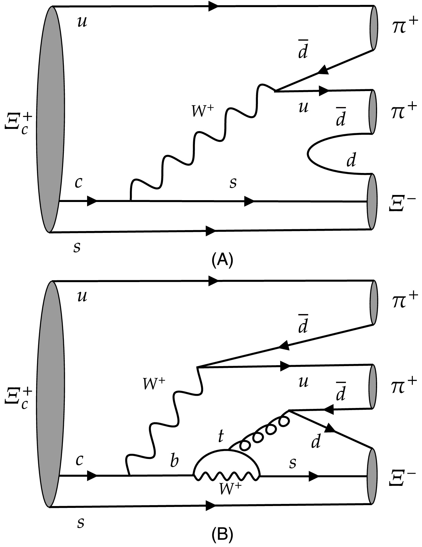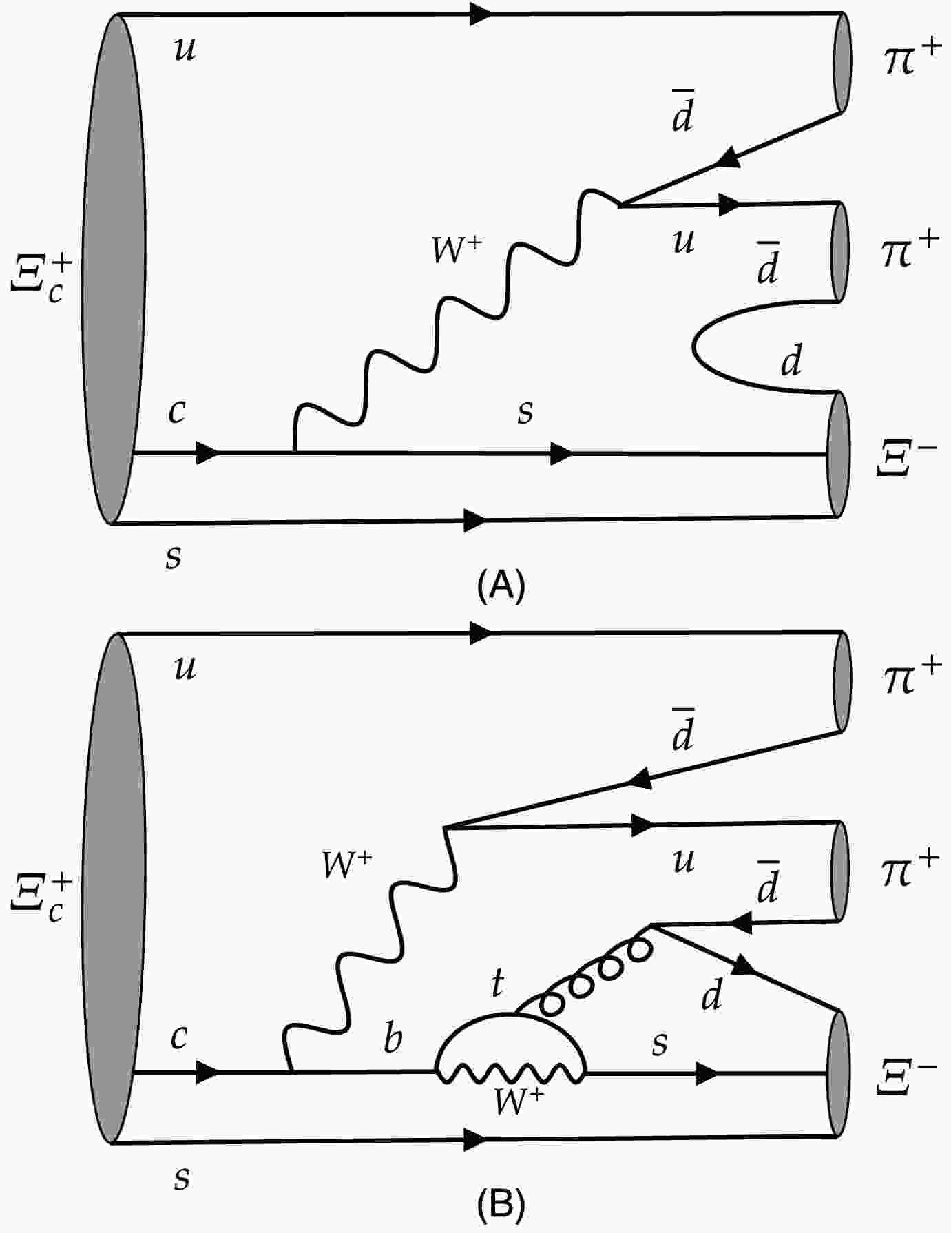 $ \Xi^+_c(\lambda_1) \rightarrow \Xi^-(\lambda_2) \pi^+\pi^+ $ would indicate all information about spin and helicity of the particles. In helicity formalism, the amplitude is model-independent and expressed by$ B^J_\mu(\lambda_2,0,0) $ which has the sum of resonances in Eq. (2). Here$ J=\frac12 $ is the spin of mother particle, μ is its eigenvalue in the body-fixed z-axis that can be$ \frac12 $ or$ -\frac12 $ , and$ \lambda_2=\pm\frac12 $ is the helicity of$ \Xi^- $ . Then there are four degrees of freedom$ B^{\frac12}_{\frac12}(\frac12,0,0), B^{\frac12}_{-\frac12}(\frac12,0,0), B^{\frac12}_{\frac12}(-\frac12,0,0) $ , and$ B^{\frac12}_{-\frac12}(-\frac12,0,0) $ , which are denoted by$ B^{\mu}_{\lambda_2} $ for simplification.Similarly, the production of