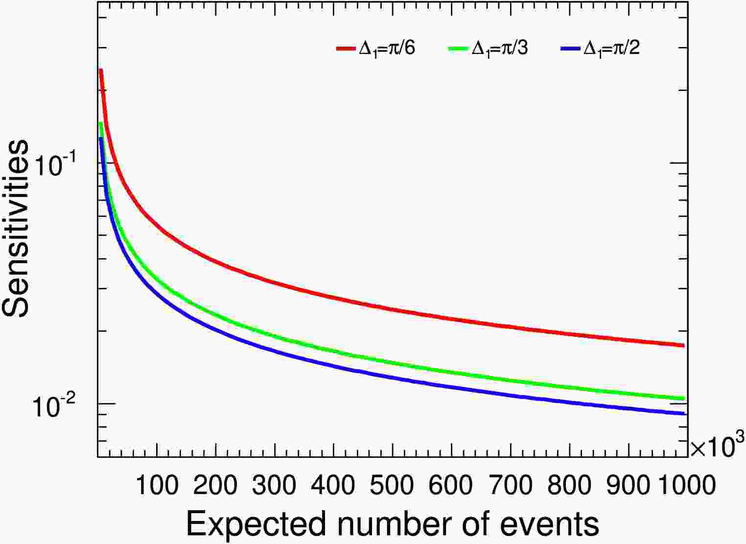$ \gamma_{\Xi_c^+} $ sensitivity distributions relative to signal yields assuming$ \gamma_{\Xi^+_c}=0.5 $ . The$ \Delta_{1} $ values of$ \pi/6 $ ,$ \pi/3 $ , and$ \pi/2 $ correspond to the red, green, and blue lines, respectively.Next we consider the sensitivity estimation on