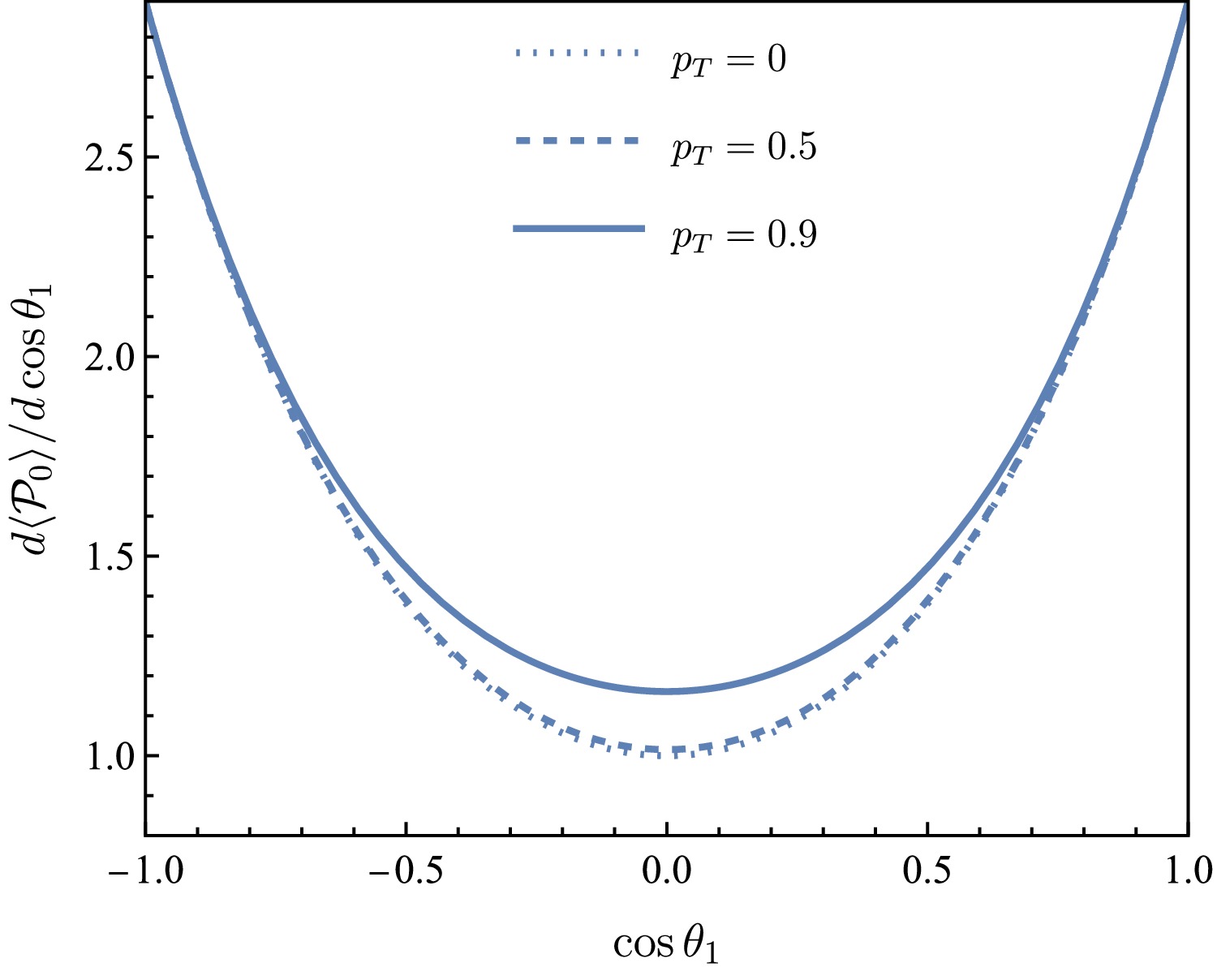 $ {{\cal{P}}}_0 $ as a function of$ \cos\theta_1 $ for$ p_T=0 $ ,$ 0.5 $ ,$ 0.9 $ (dotted, dashed and solid lines, respectively).