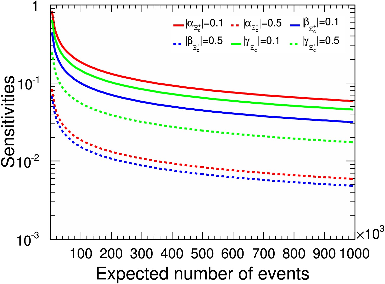 $ \alpha_{\Xi_c^+} $ ,$ \beta_{\Xi_c^+} $ , and$ \gamma_{\Xi_c^+} $ sensitivity distributions relative to signal yields in terms of different parameters. The red solid and dashed lines represent the$ \alpha_{\Xi_c^+} $ values of 0.1 and 0.5, respectively. The blue solid and dashed lines represent the$ \beta_{\Xi_c^+} $ values of 0.1 and 0.5, respectively. The green solid and dashed lines represent the$ \gamma_{\Xi_c^+} $ values of 0.1 and 0.5, respectively.In Fig. 9, The statistical significance of