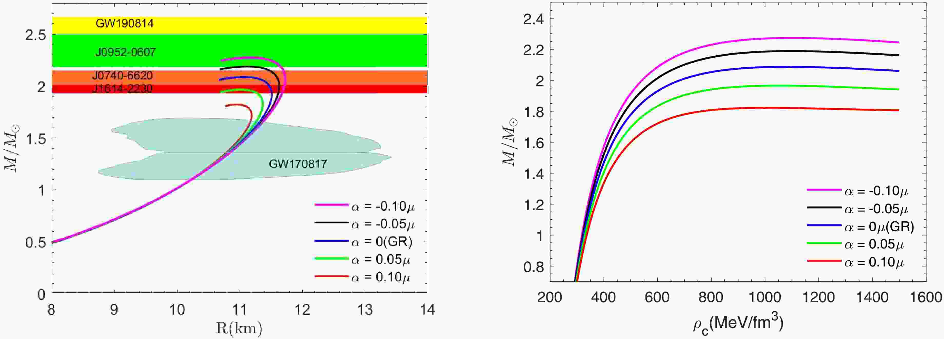 • The structure of quark stars is unique compared to other compact objects such as white dwarfs and neutron stars. Fig. 2-5 illustrate the mass-energy density and mass-radius relations for quark stars under $ f(R,L_{m},T) $ gravity model. These figures also show the mass constraints of massive compact objects based on recent experimental observations. The red region, with a mass of $ M = 1.97 \pm 0.04M_{\odot} $, represents the mass range constraint from PSR J1614-2230 [33]. The orange region, with a mass range of $ M = 2.08 \pm 0.07M_{\odot} $, corresponds to the data from PSR J0740+6620 [84]. The green region, with $ M = 2.35 \pm 0.17M_{\odot} $, is based on the data from PSR J0952-0607 [85]. The yellow region represents the mass range of the companion object in the gravitational wave event GW190814, with a mass range of $ 2.50-2.67M_{\odot} $ [34]. In Fig. 2, the mass-radius curves of quark stars are shown on the left for different values of the gravitational parameter α, with the parameters set as $ B = 70 $ MeV/fm3, $ m_{s} = $ 100MeV, and Δ =100MeV. The solid blue curve denotes the result from GR, while the other curves correspond to the case of the $ f(R,L_{m},T) $ gravity model, the relevant data are given in Table 1. We find that, compared to neutron stars [32], the structure of CFL quark stars is more sensitive to changes in the parameter α; even small variations in α can lead to significant changes in the mass and radius of quark stars. In the GR case, the quark star has a maximum mass of $ M = 2.09M_{\odot} $ and a radius of $ R = 11.05 $ km, and the mass-radius curve coincides with the data region of the pulsar PSR J0740+6620, which provides a theoretical explanation for the observations. As the value of α increases, both the maximum mass and its corresponding radius decrease. When α = 0.1 μ, a two solar mass compact star cannot be predicted; while when α = -0.1 μ, the quark star reaches a maximum mass of 2.27 $ M_{\odot} $ with a corresponding radius of 11.19 km, which reasonably explains the observations of the pulsar PSR J0952-0607. In addition, the predicted radii corresponding to the observed masses of the four strange star candidates are presented in Table 2.