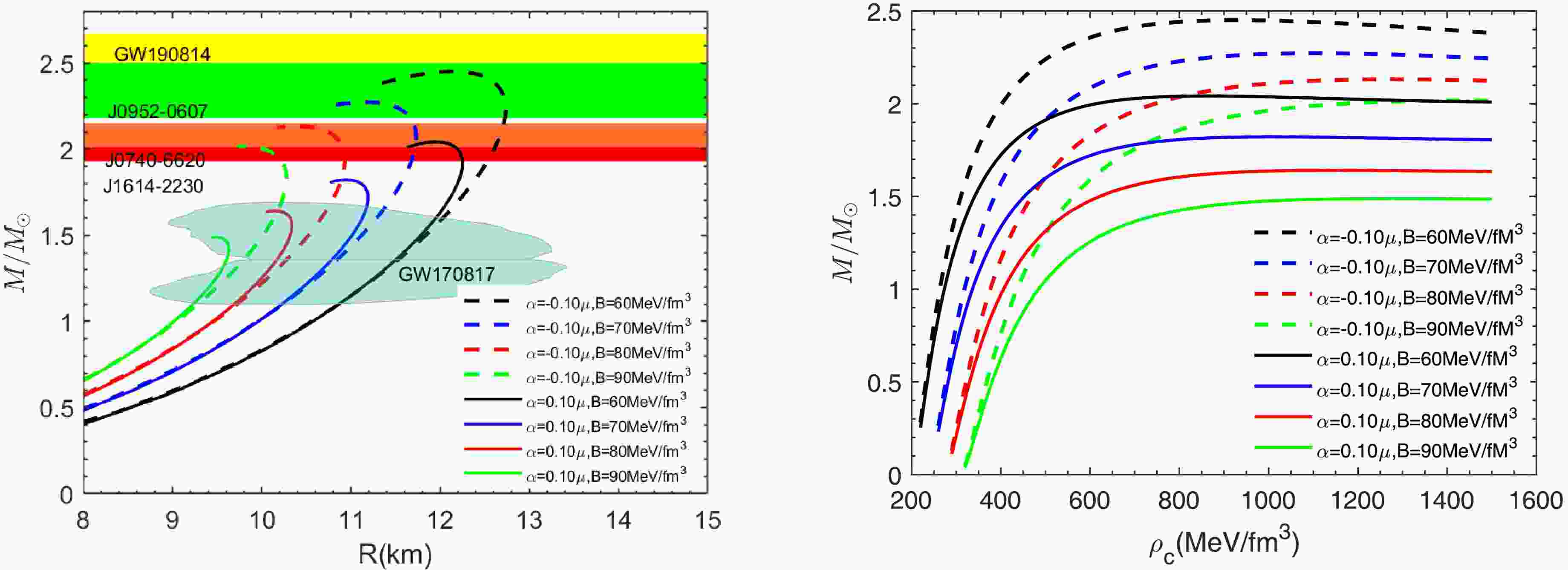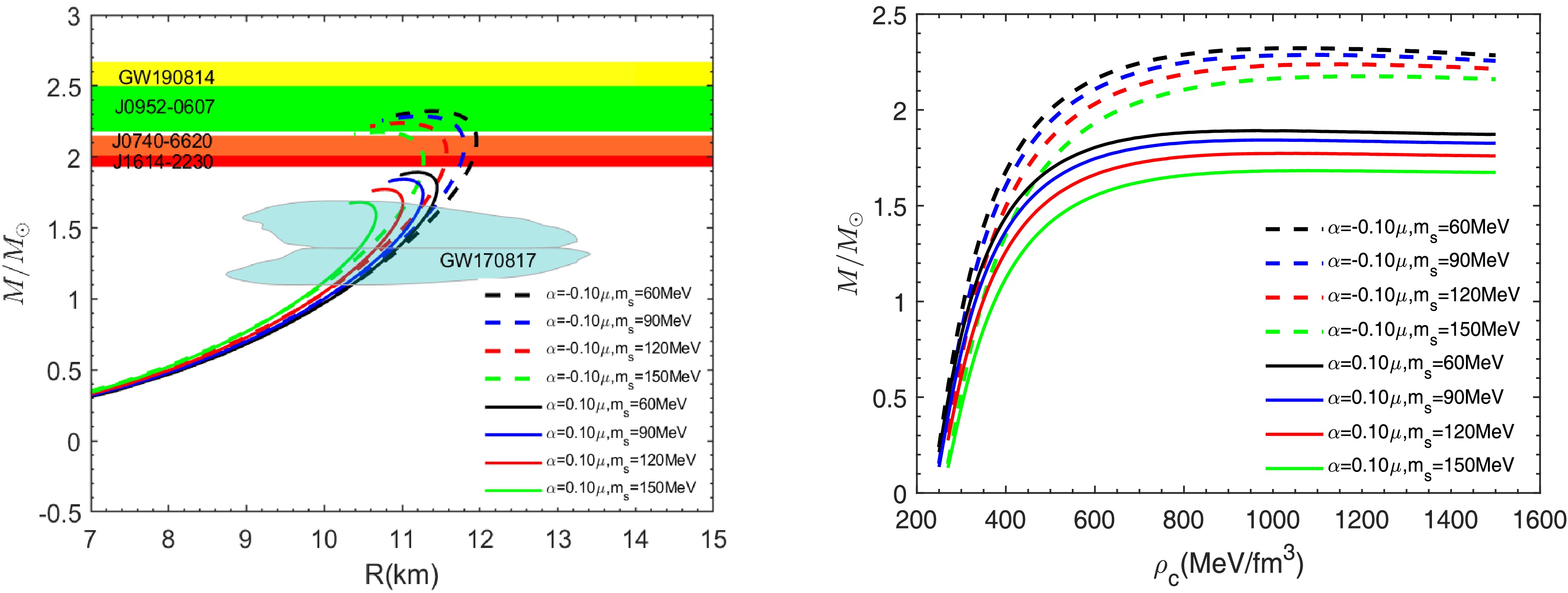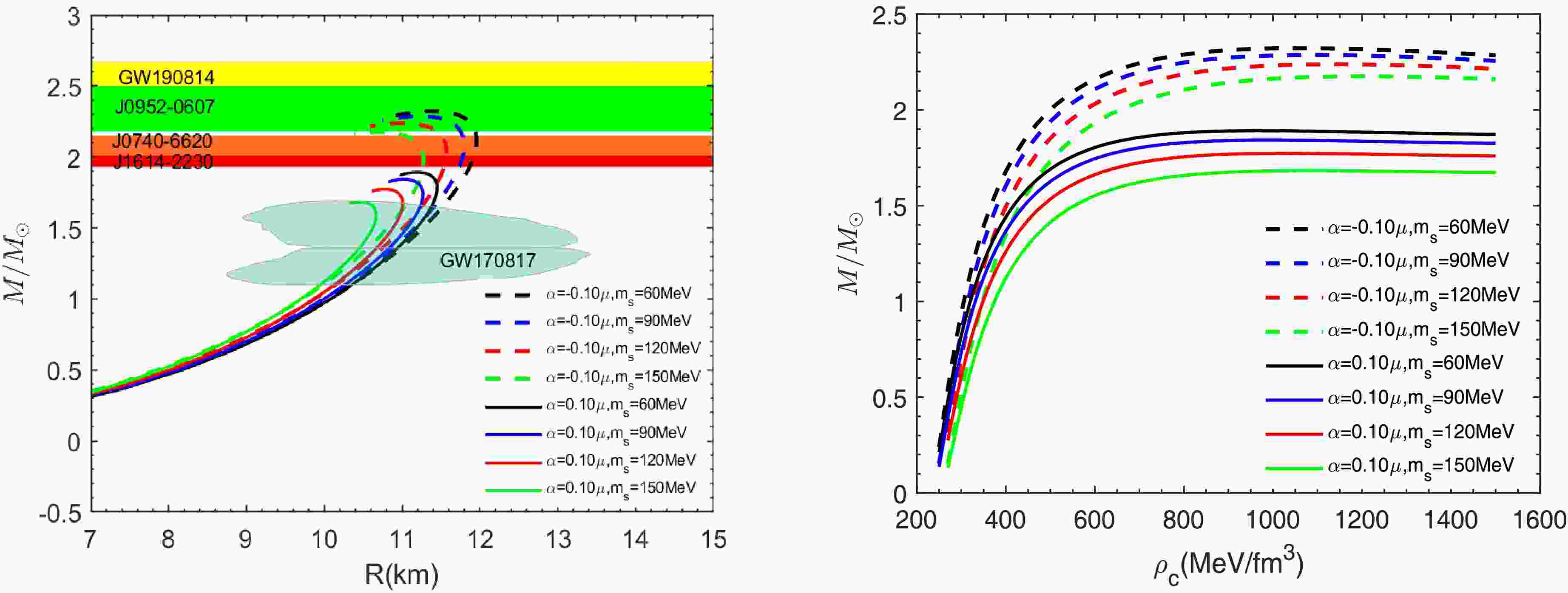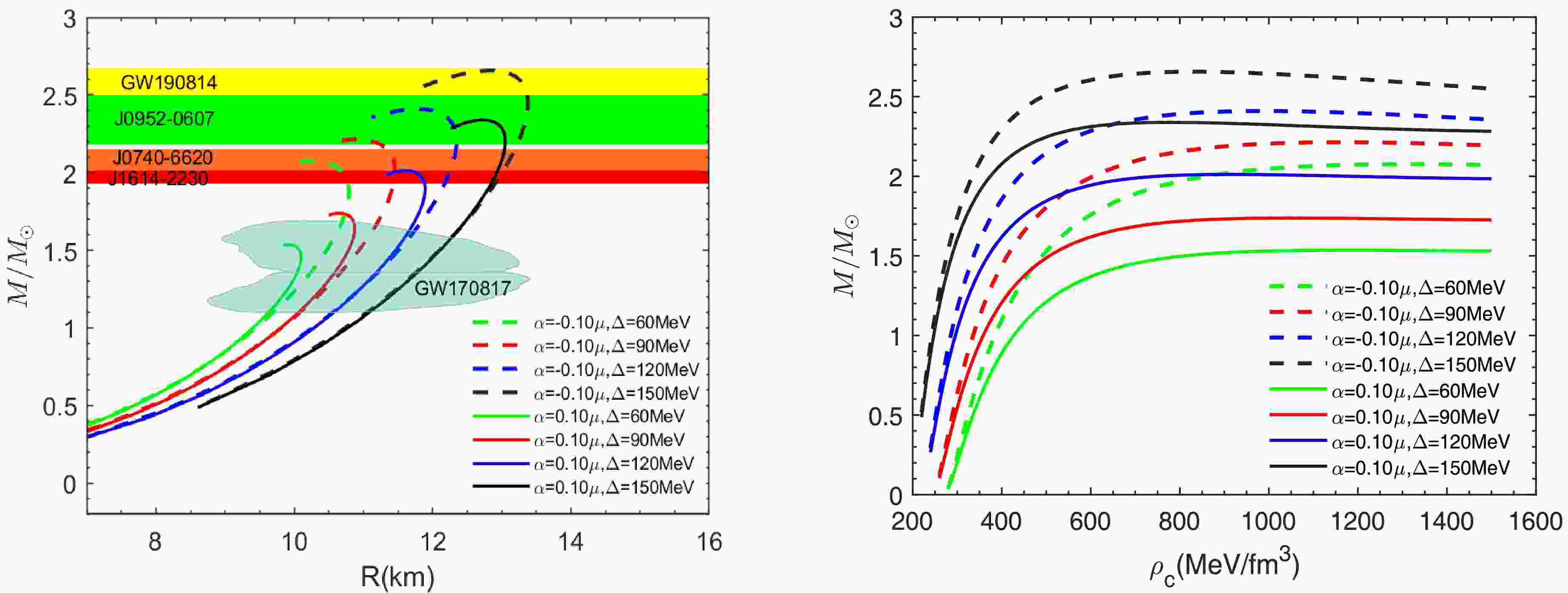 Next, we investigate the effect of Δ on the structure of quark stars. In Fig. 3, we analyze the $ M-R $ and $ M-\rho_{c} $ relations of quark stars as Δ varies. The dashed and solid lines correspond to the cases of $ \alpha = -0.1 $ μ and $ \alpha = 0.1 $ μ, respectively, and the other parameters are set to B = 70MeV/fm3 and $ m_{s} $ = 100MeV. Table 2 shows some quantities related to the properties of quark stars. As Δ increases from 60MeV to 120MeV, the maximum mass increases gradually. This is because the decrease in Δ leads to a softening of the equation of state, which reduces the star's ability to support its own gravity. For the case $ \alpha = 0.1 $ μ, the maximum mass ranges from 1.54 to 2.34 $ M_{\odot} $. Remarkably, when $ \alpha = -0.1 $ μ and Δ = 120MeV, the maximum mass increases to 2.65 $ M_{\odot} $, which corresponds to a radius of 12.85km. At this point, the mass-radius curve passes exactly through the contour of GW190814. Therefore, it can also be inferred from the figure that the stiffer equation of state is able to fit the observations of GW190814 after the Δ exceeds 120MeV. We then proceed to study the impact of $ m_{s} $ on the structure of quark stars. Fig. 4 presents the results for α varying within the range $ [-0.8, 1.0] $, while other parameters are held constant at Δ = 100 MeV and $ B = 70 $ MeV/fm3. From the figure, it is evident that as $ m_{s} $ increases from 100 to 150 MeV, the equation of state softens, leading to a slight decrease in the maximum mass of the quark star. For the case of $ \alpha = 0.1 $ μ, the maximum mass of the quark star is 1.89 $ M_{\odot} $, which is not consistent with observations of massive pulsars. When $ \alpha = -0.1 $ μ, the maximum mass ranges from 2.18 to 2.32 $ M_{\odot} $, with the corresponding radius ranging from 9.82 to 12.21 km, as shown in Table 3.