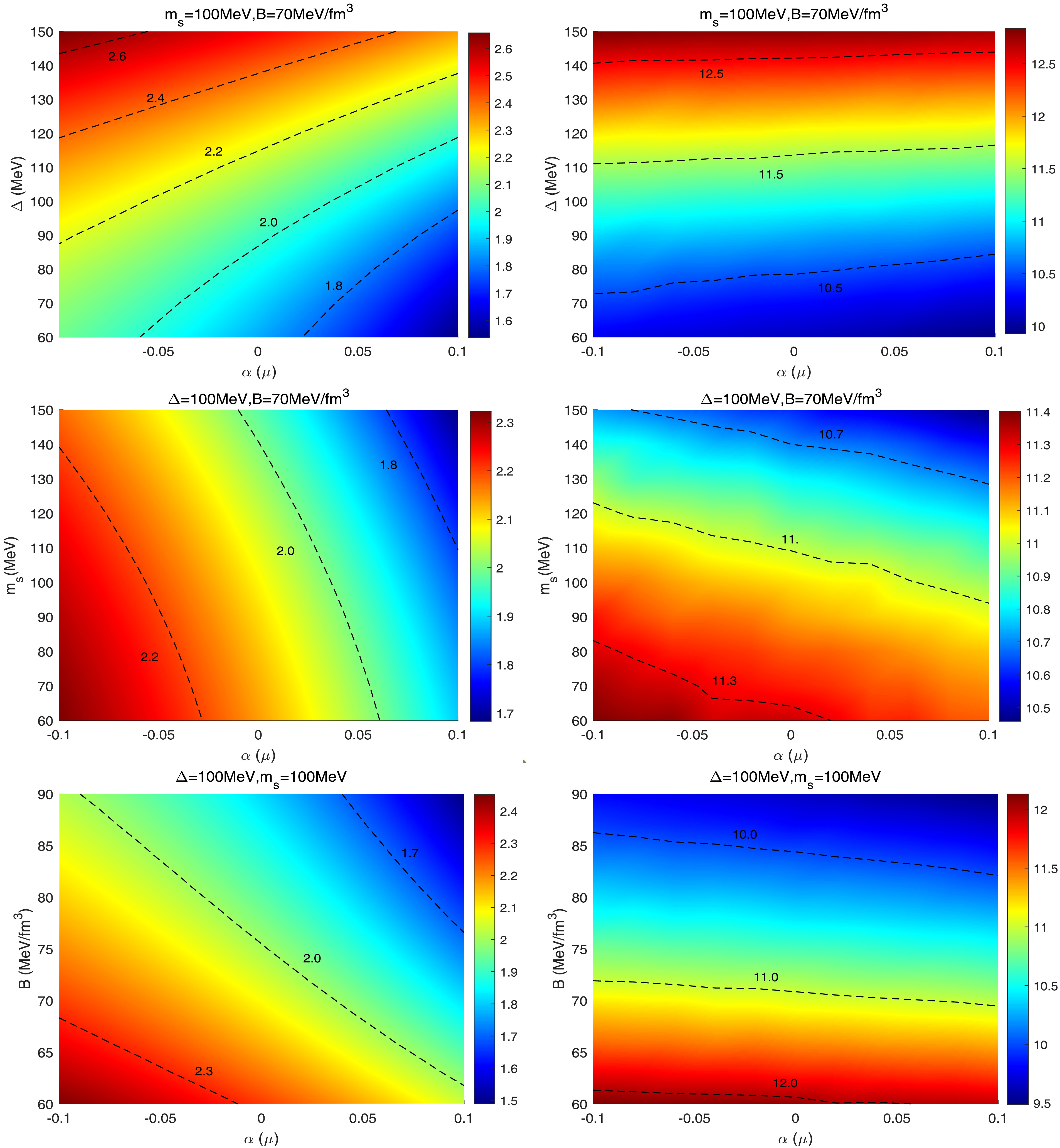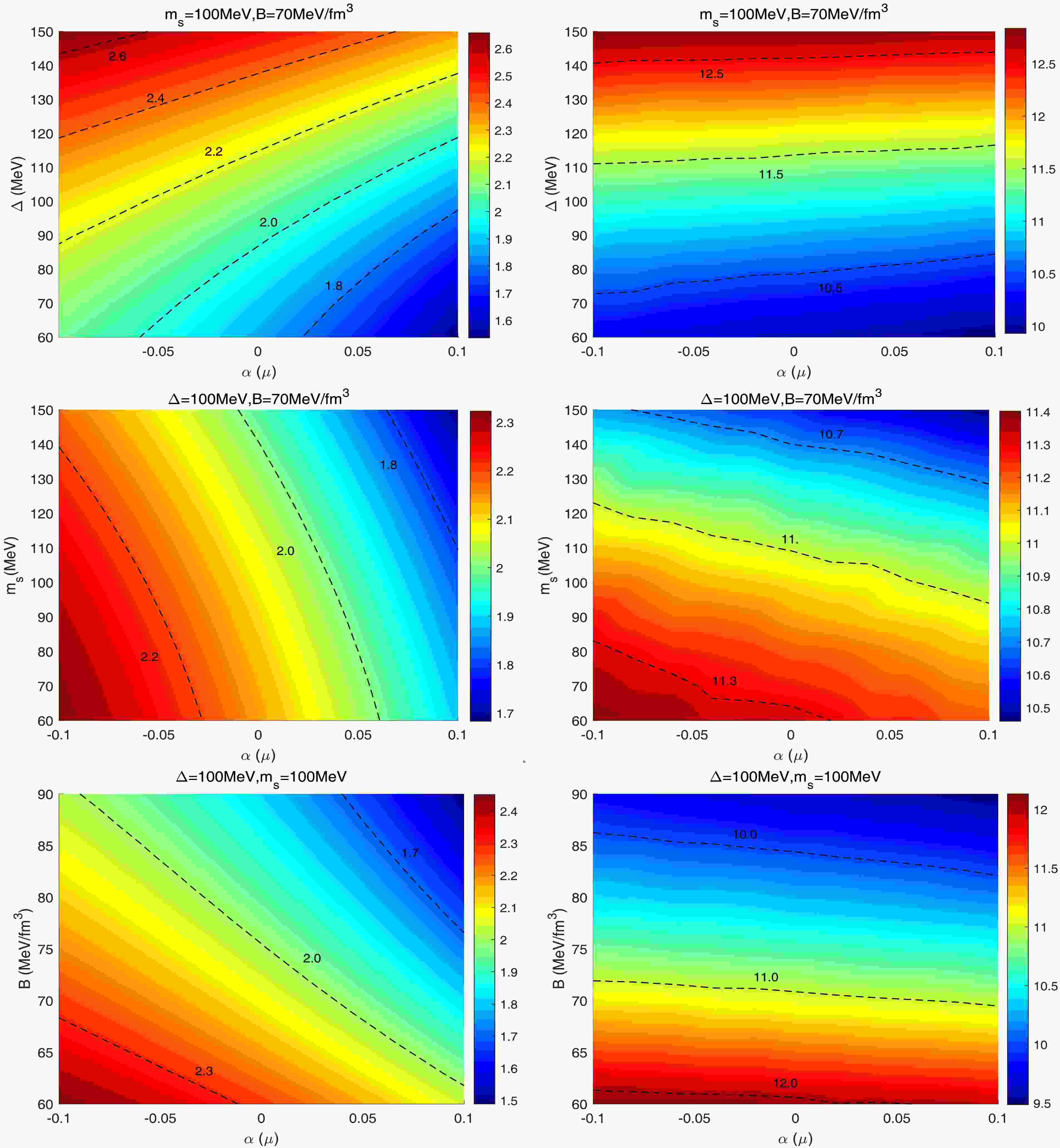 Finally, on the left side of Fig. 5, we investigate the effect of the B, which varies in the range of $ 60-90 $ MeV/fm3, on the mass-radius relation of quark stars. The other parameters are set as $ m_{s} $ = 150MeV and Δ = 100MeV. The results show that as the value of B decreases, both the maximum mass and radius of the quark star increase significantly. For the case of $ \alpha = 0.1 $ μ, the maximum mass ranges from 1.49 to 2.04 $ M_{\odot} $, with the corresponding radius ranging from 9.48 to 11.96, as shown in Table 4. When $ \alpha = -0.1 $ μ, the mass-radius curve passes exactly through the contour lines of the data except for GW190814. The shaded regions in Figs. 2-5 represent the mass-radius constraints from the gravitational wave event GW170817, indicating that the compact star models generated by the above parameters all satisfy these constraints. Furthermore, Fig. 6 shows contour plots of the maximum mass and the corresponding radius across the entire range of parameter values, with the 2.00 $ M_{\odot} $ contour explicitly marked. Parameter combinations above this contour are compatible with both the observed massive pulsars and the mass-radius constraints inferred from gravitational wave events GW170817.