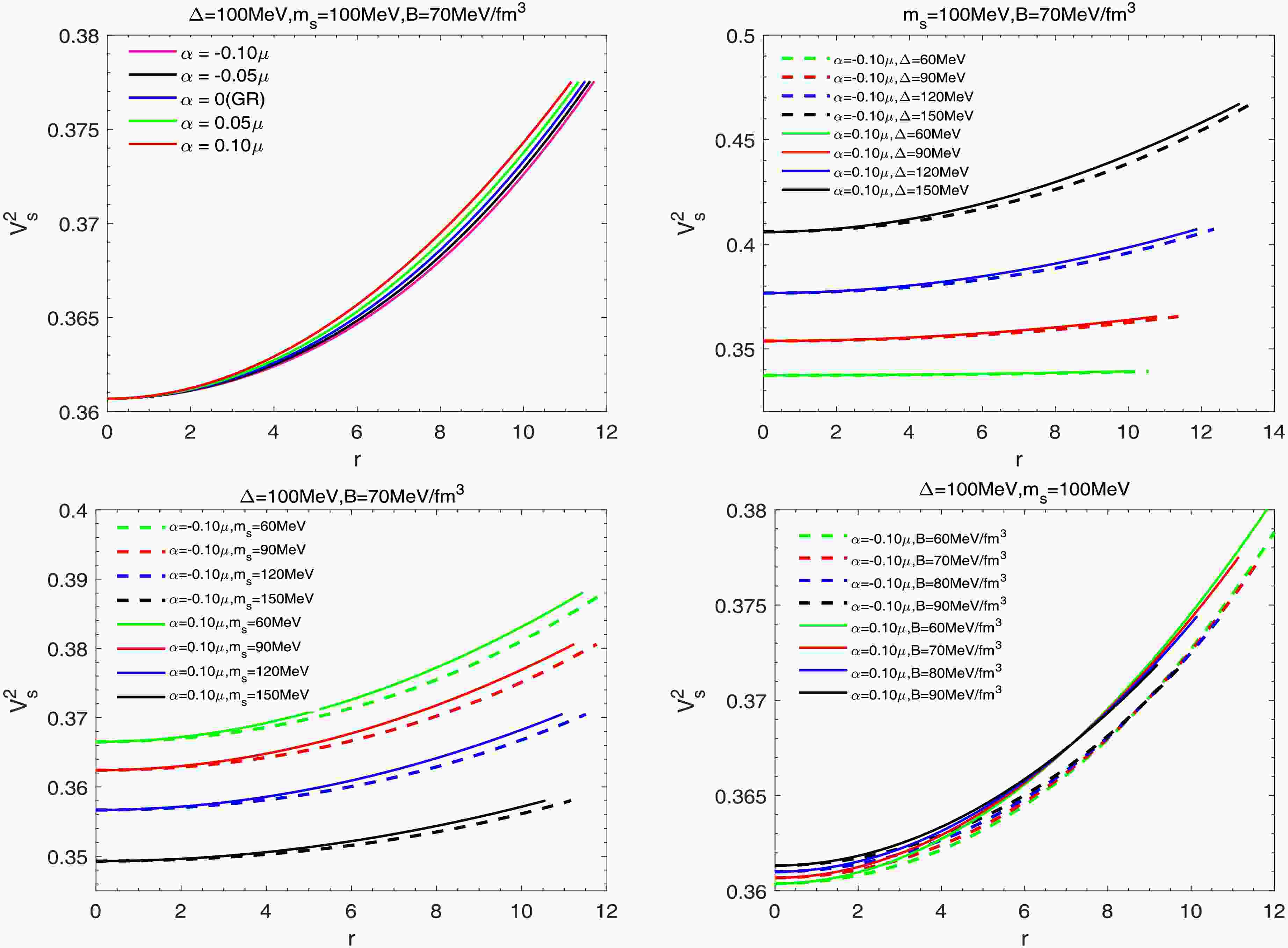 Table 1.  Properties of quark stars in $ f(R,L_{m},T) $ gravity corresponding to various selected values of α. Here, $ B=70 $ MeV/fm3, $ \Delta=100 $ MeV and $ m_{s}=100 $ MeV.
