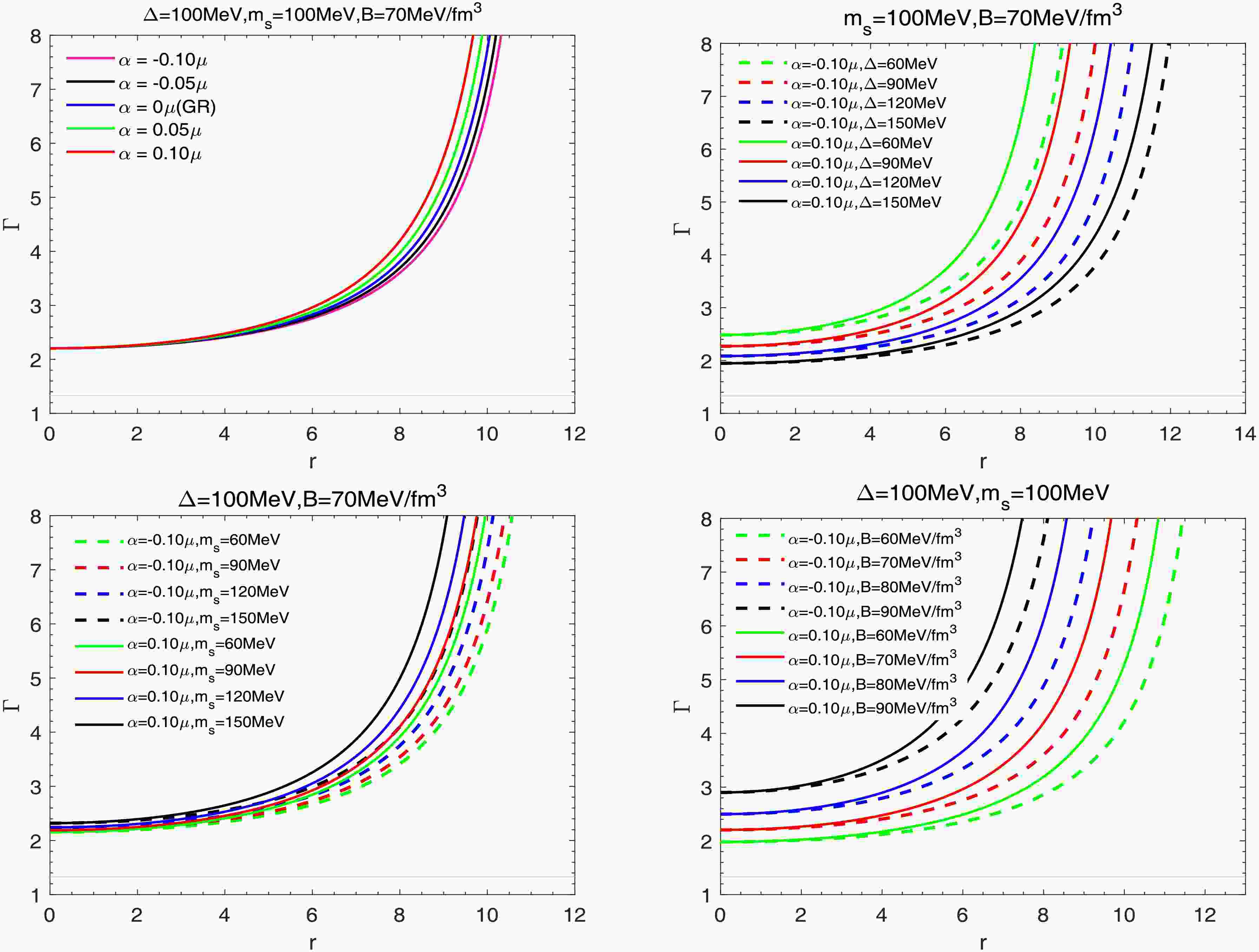 According to the study by Heintzmann and Hillebrandt [87], due to relativistic effects, the instability of the system leads to a critical adiabatic index Γ higher than the Newtonian value $ \Gamma=4/3 $. The behavior of the adiabatic index as a function of radius is discussed, and as shown in Fig. 8, the adiabatic index satisfies $ \Gamma > 4/3 $ for different values of the parameters. This indicates that the model constructed under $ f(R,L_{m},T) $ gravity framework is stable against radial adiabatic infinitesimal perturbations.