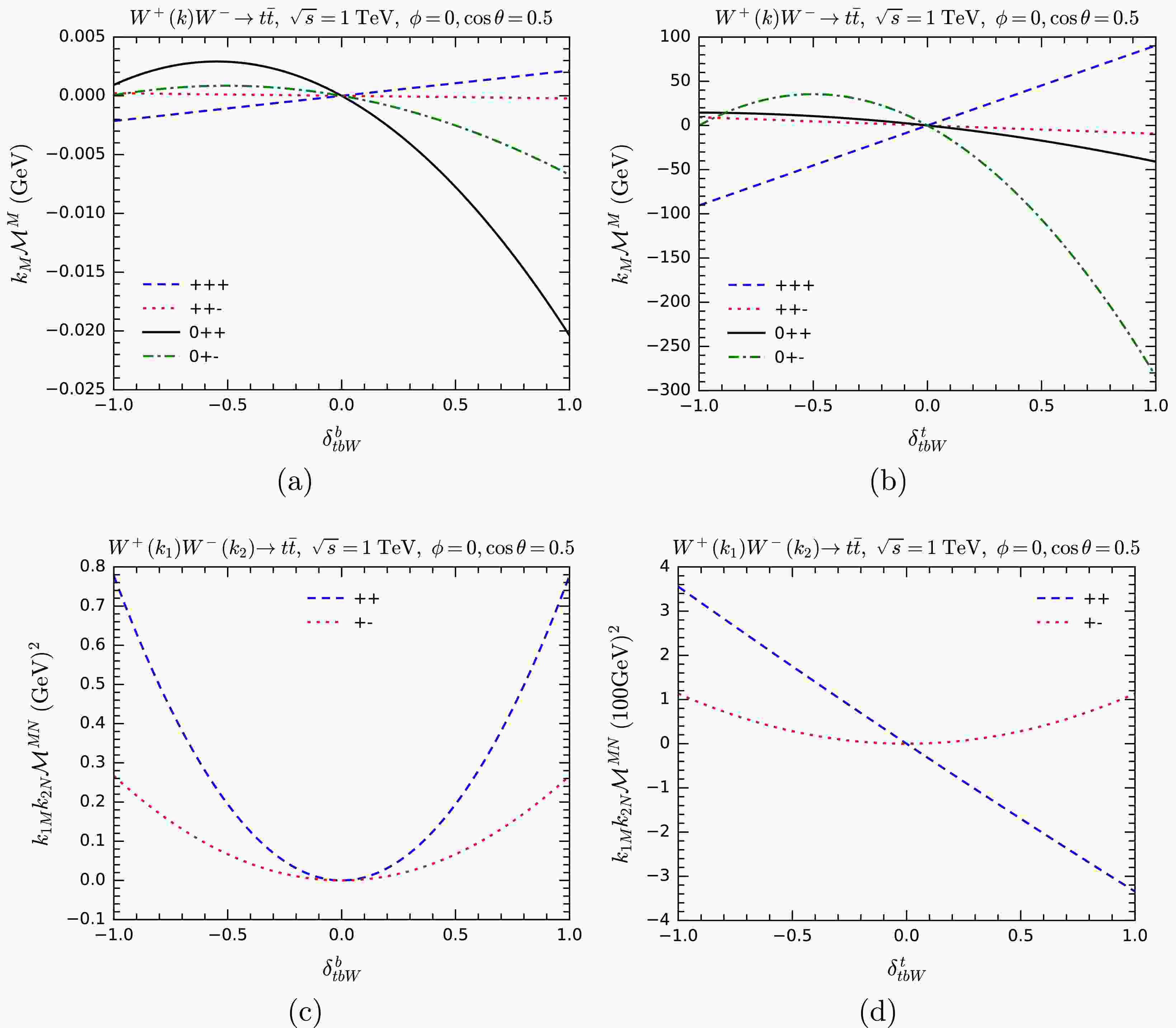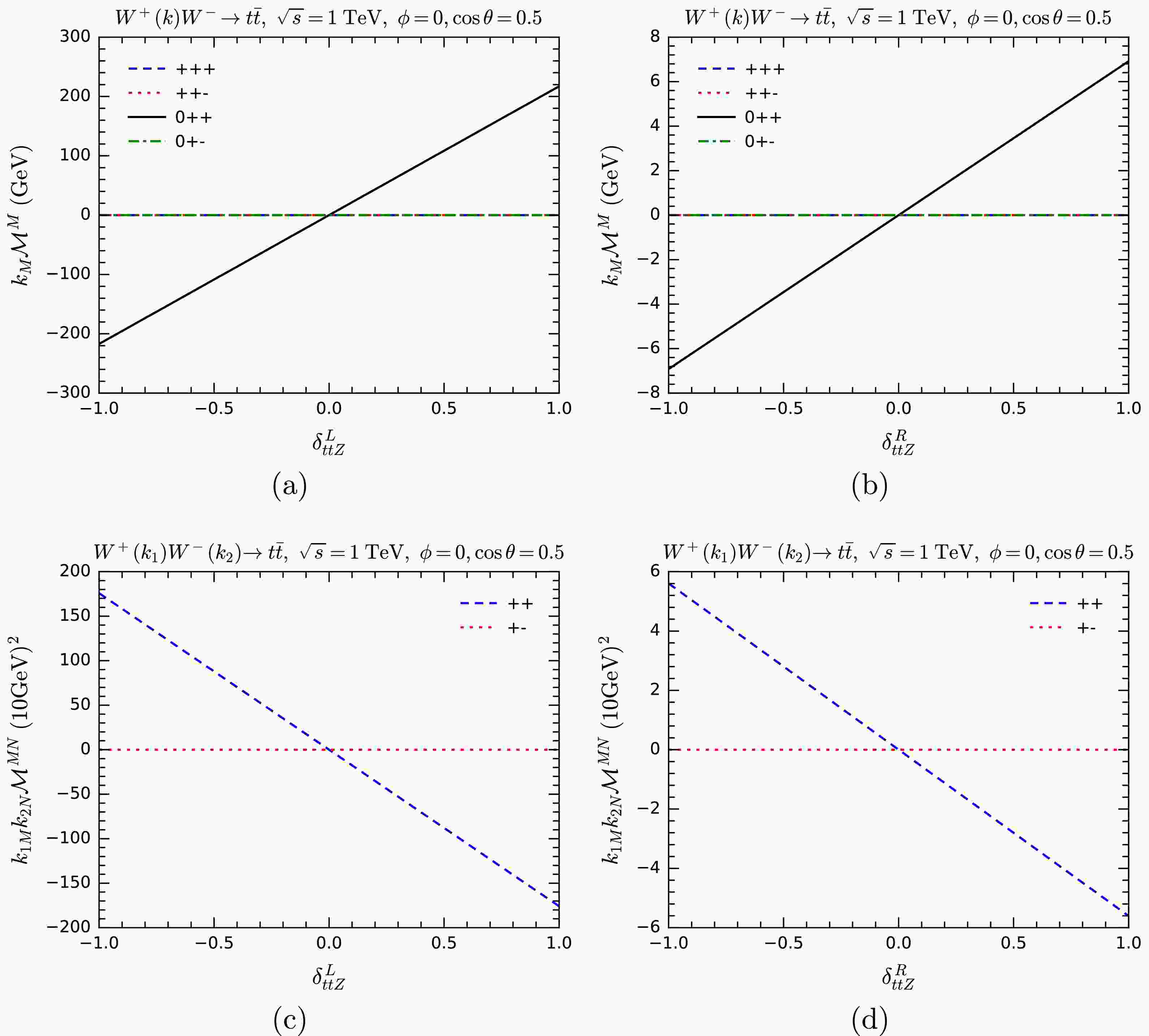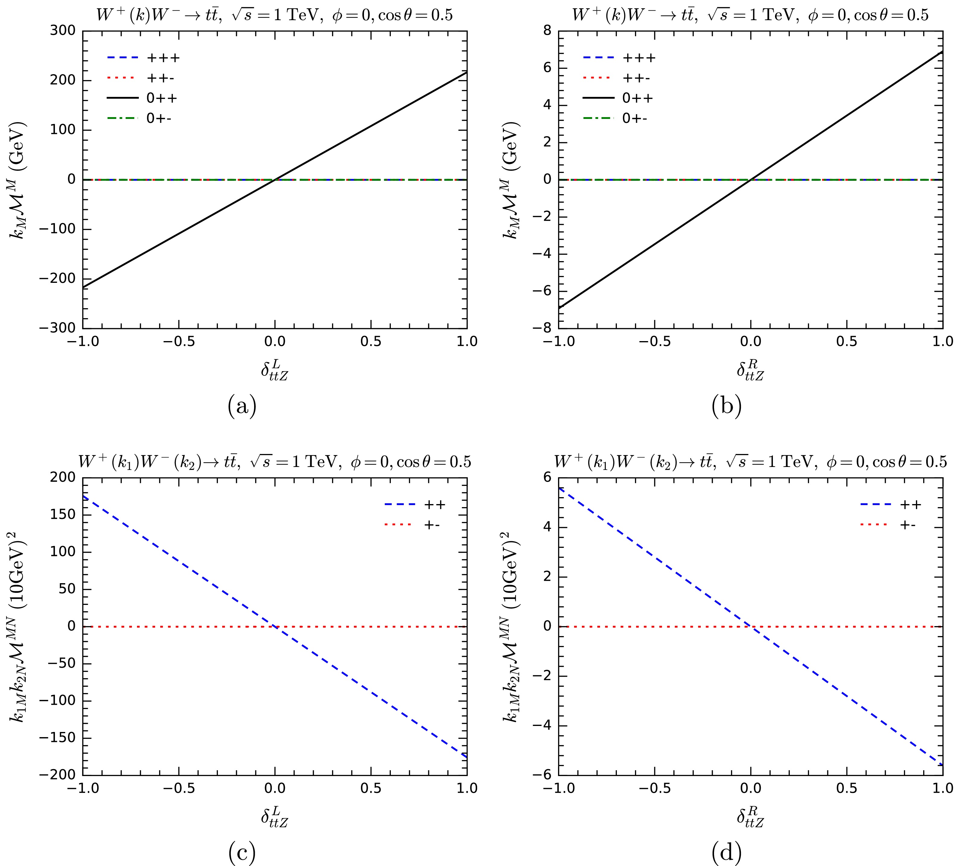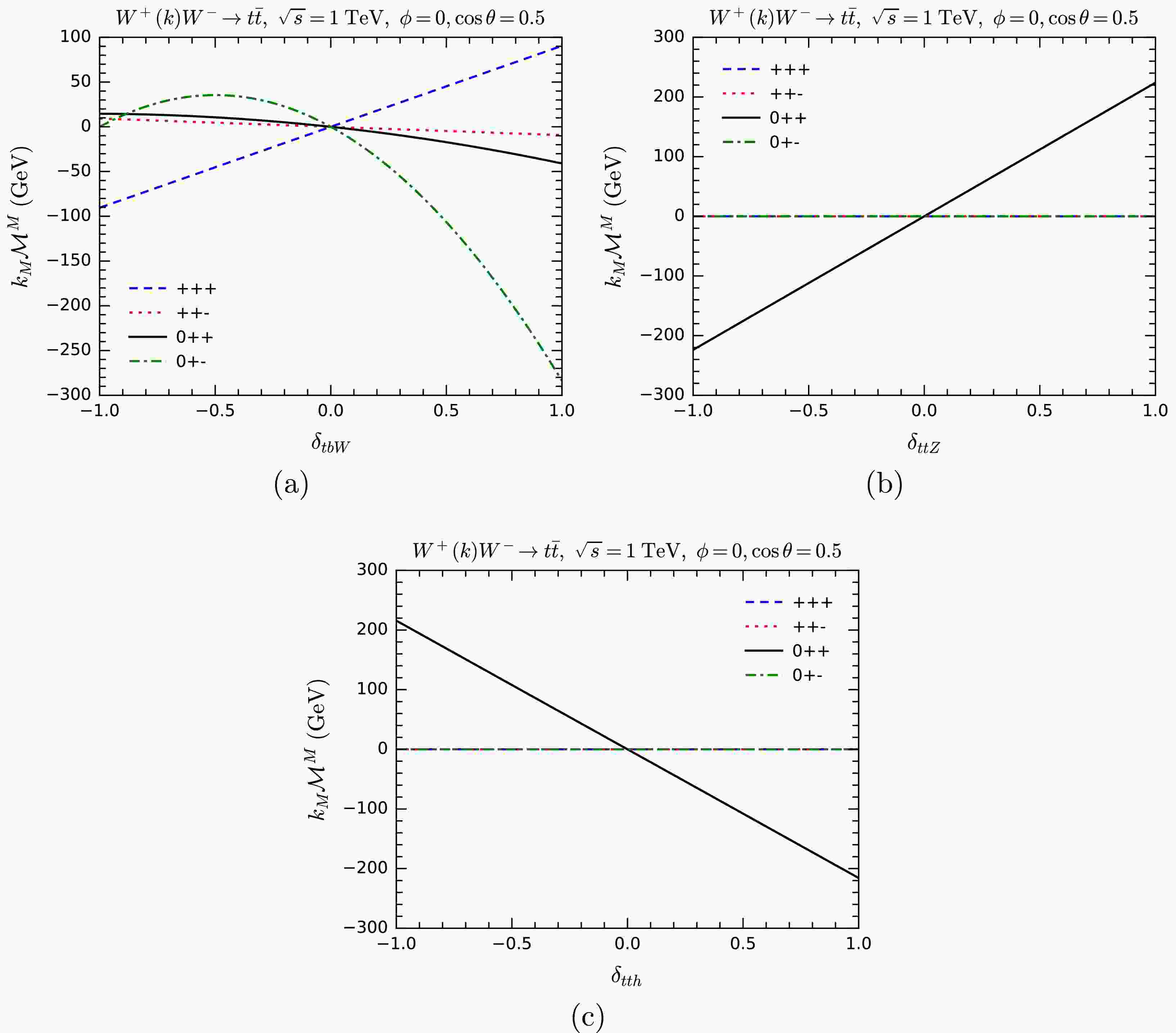 $ k_M{\cal{M}}^M $ for$ WW\rightarrow t\bar t $ as a function of anomalous overall couplings$ \delta_{tbW} $ (a),$ \delta_{ttZ} $ (b), and$ \delta_{tth} $ (c). Various helicity combinations are shown.The overall pattern is similar for all three processes. Angular conservation forbids some helicity combinations, giving
