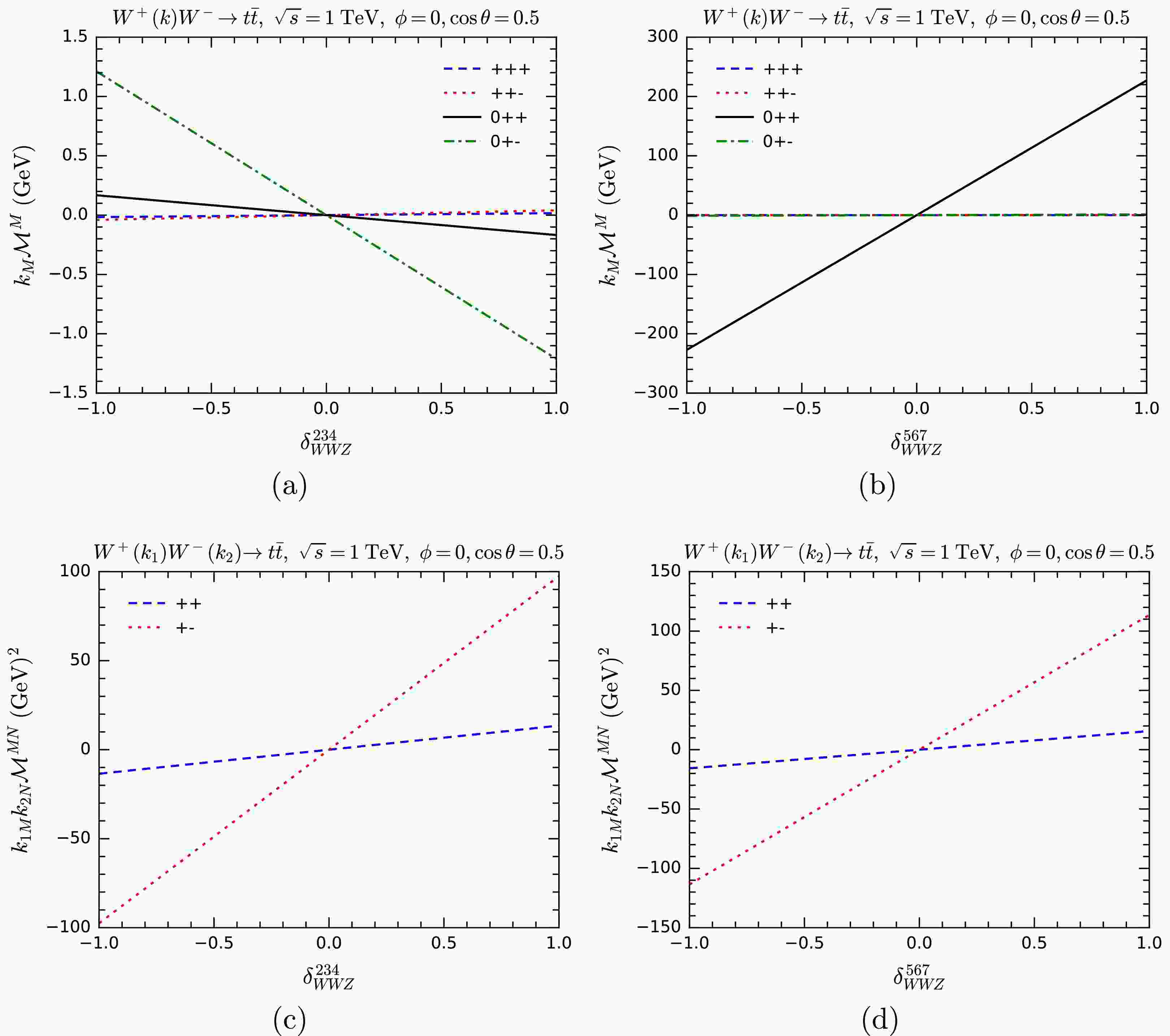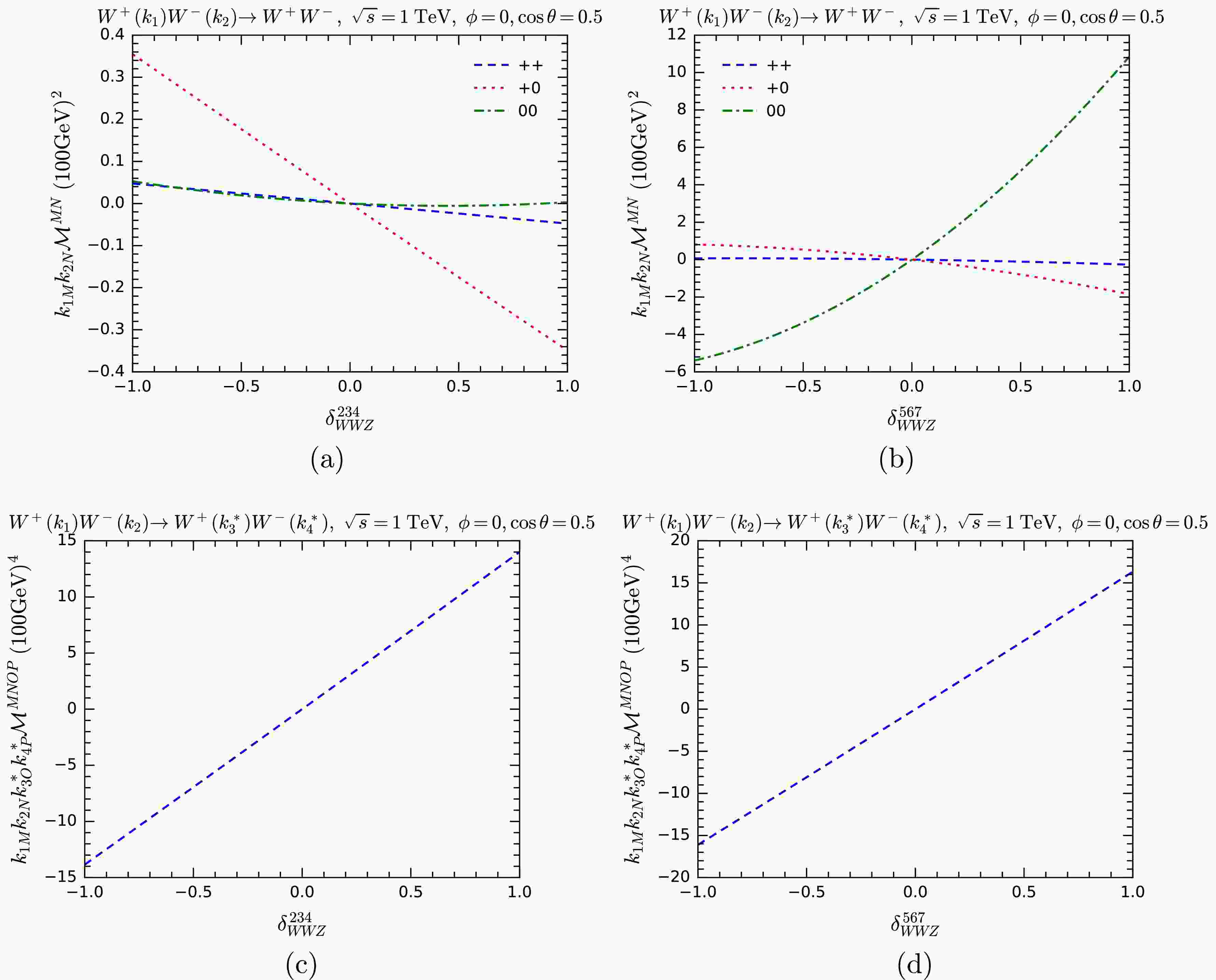 $ W^+ W^-\rightarrow W^+ W^- $ , we separately vary the overall couplings of the$ WWh $ ,$ WWZ $ , and$ WWWW $ vertices and compute$ k_M {\cal{M}}^M $ . In Fig. 13, we show the results, listing different helicity combinations in the process. As expected, we can see the violation of the MWI when the anomalous couplings are nonzero. This violation is most sensitive to$ \delta_{WWZ} $ and$ \delta_{WWWW} $ .