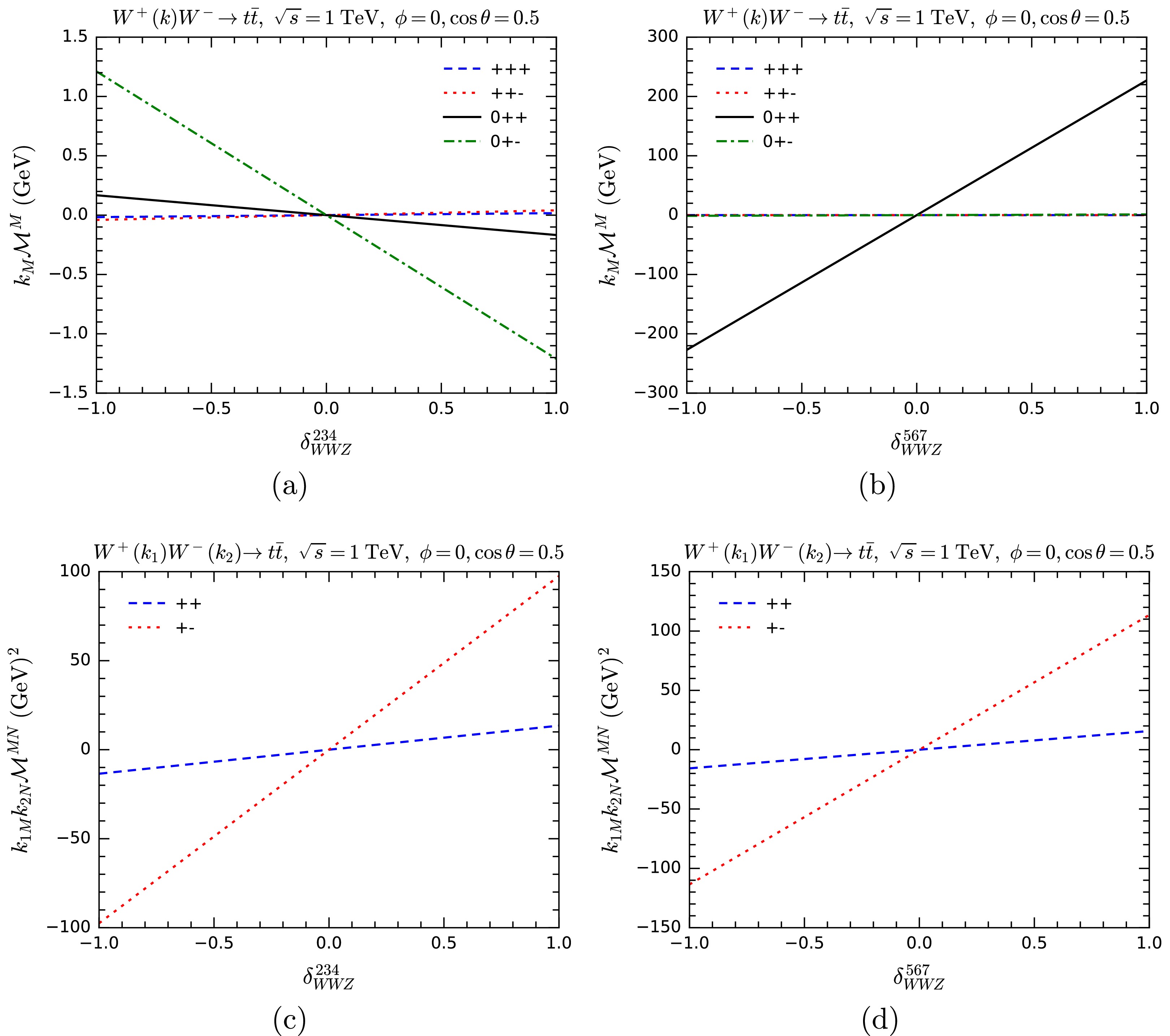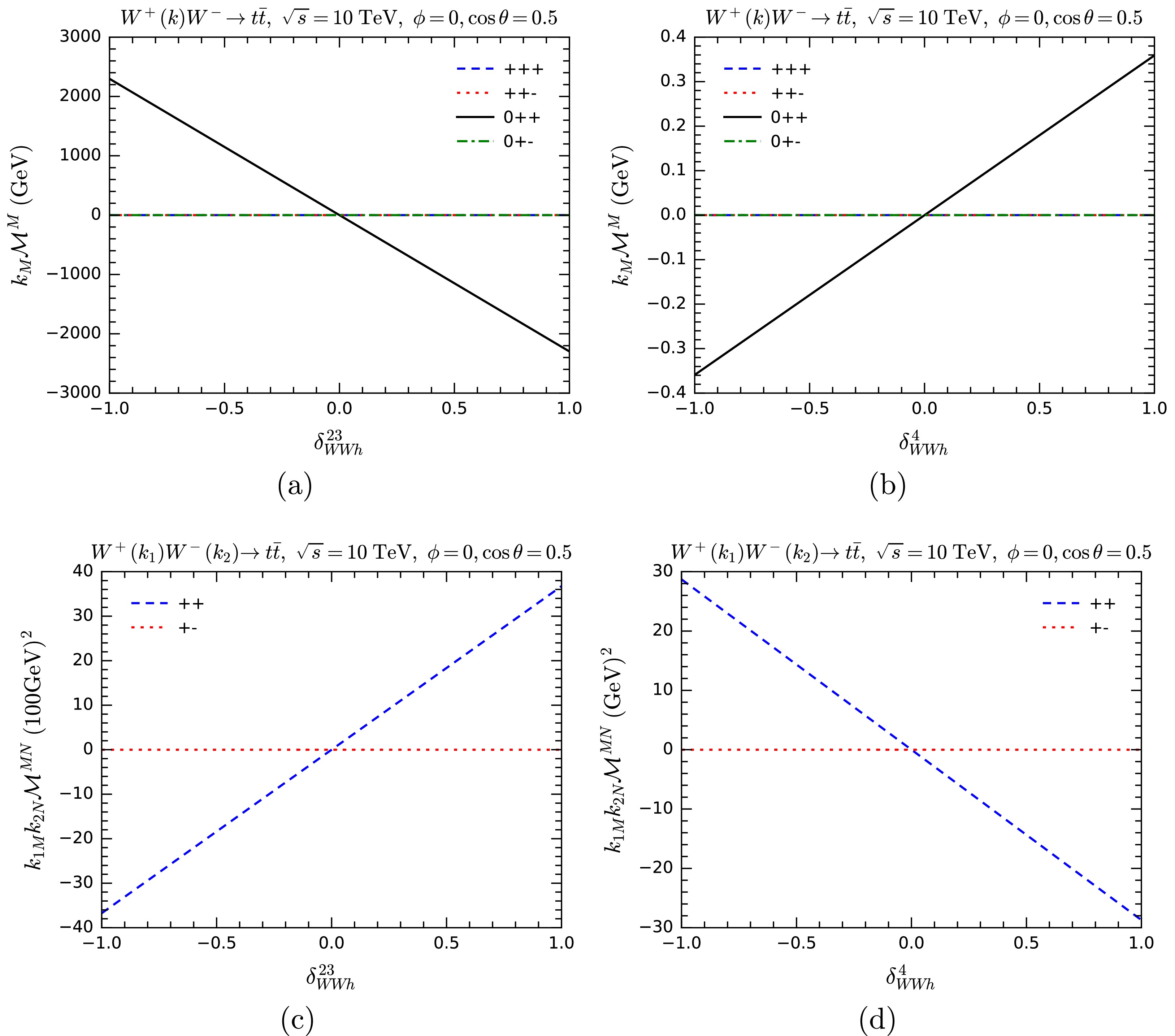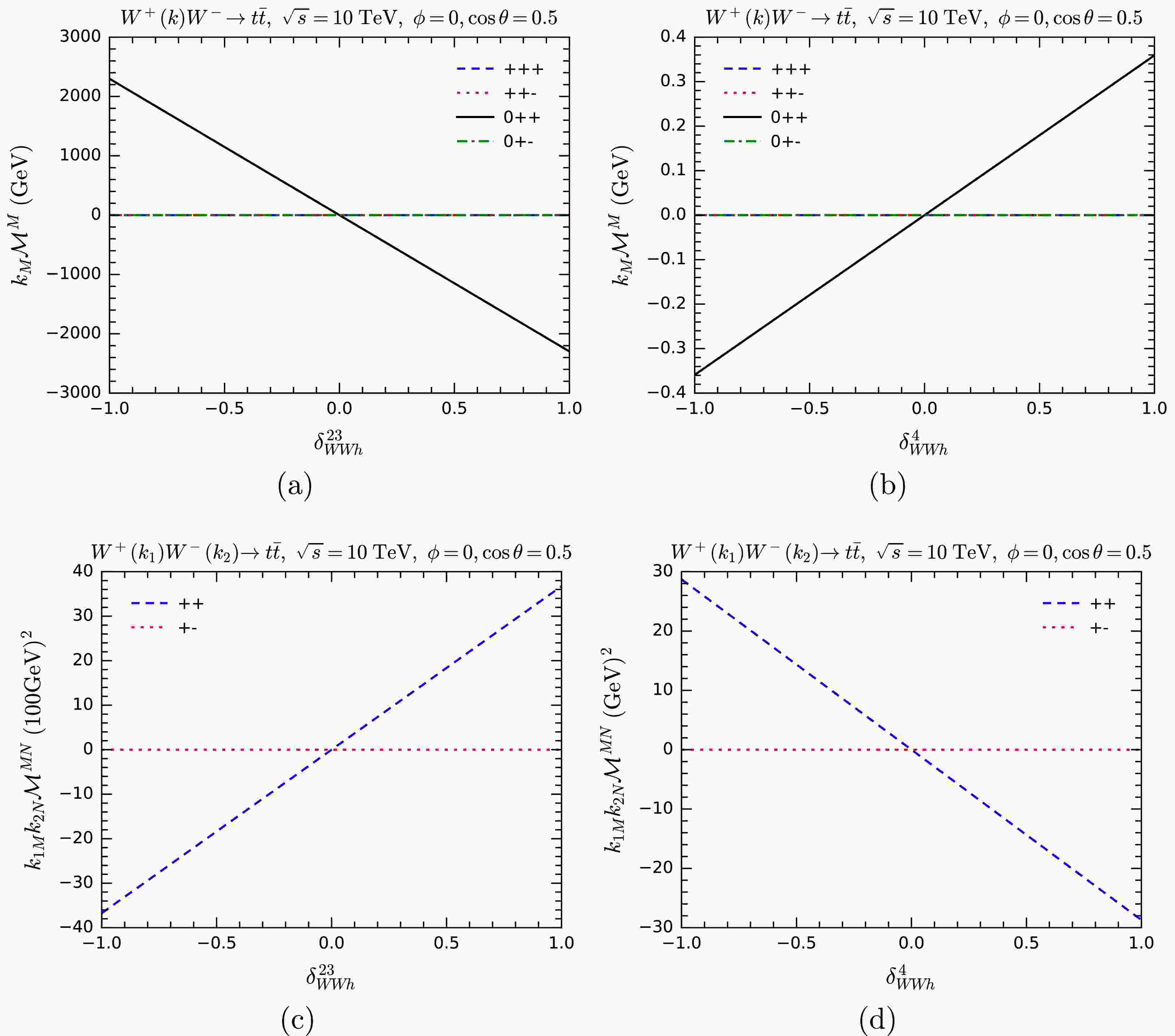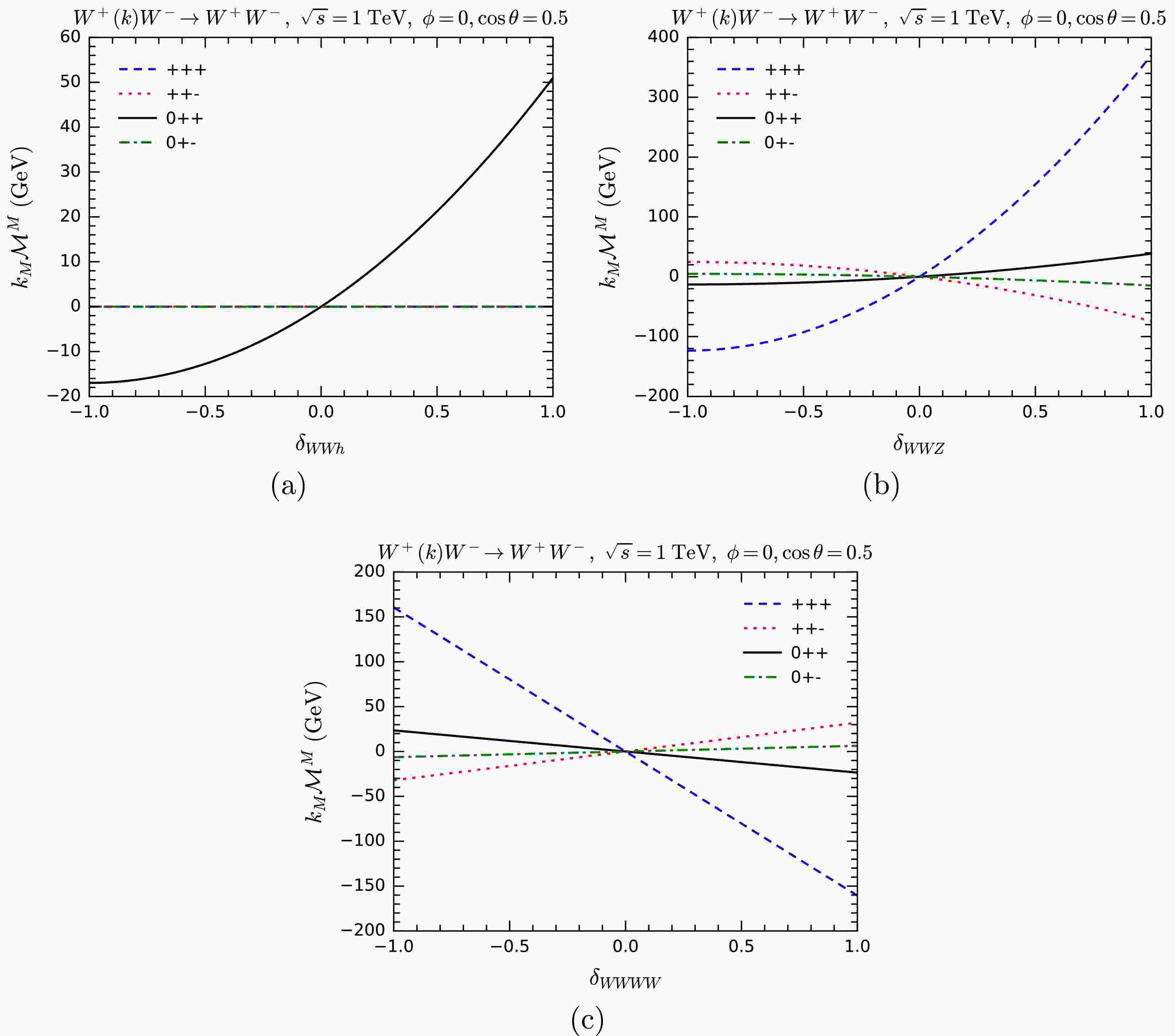$ k_M{\cal{M}}^M $ for$ W^+ W^-\rightarrow W^+ W^- $ as functions of anomalous overall couplings$ \delta_{WWh} $ (a),$ \delta_{WWZ} $ (b), and$ \delta_{WWWW} $ (c). Various helicity combinations are shown.One interesting observation is that, in most helicity combinations,