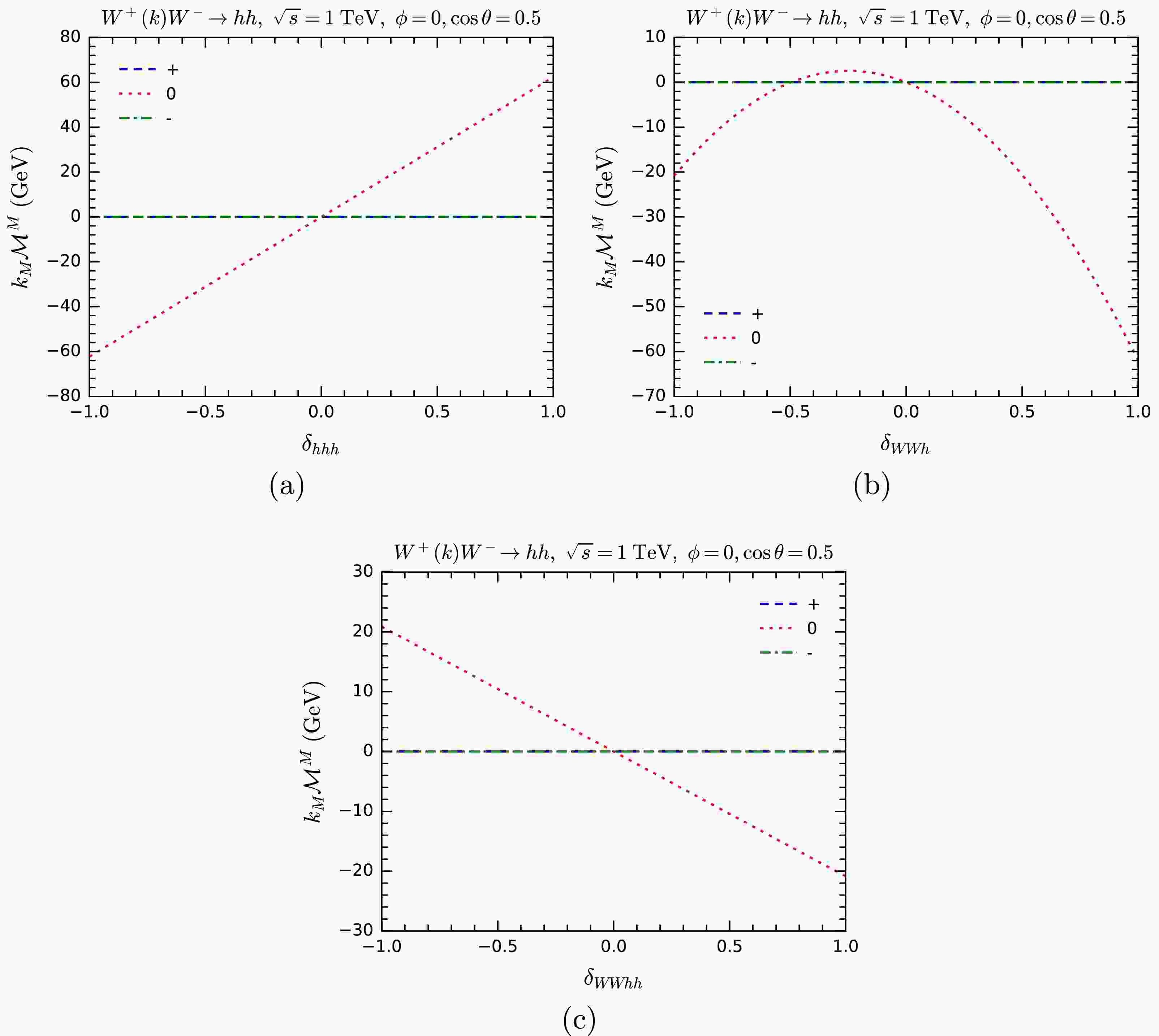 $ k_M{\cal{M}}^M $ for$ WW\rightarrow hh $ as a function of anomalous overall couplings$ \delta_{hhh} $ (a),$ \delta_{WWh} $ (b), and$ \delta_{WWhh} $ (c). Various helicity configurations are shown.For