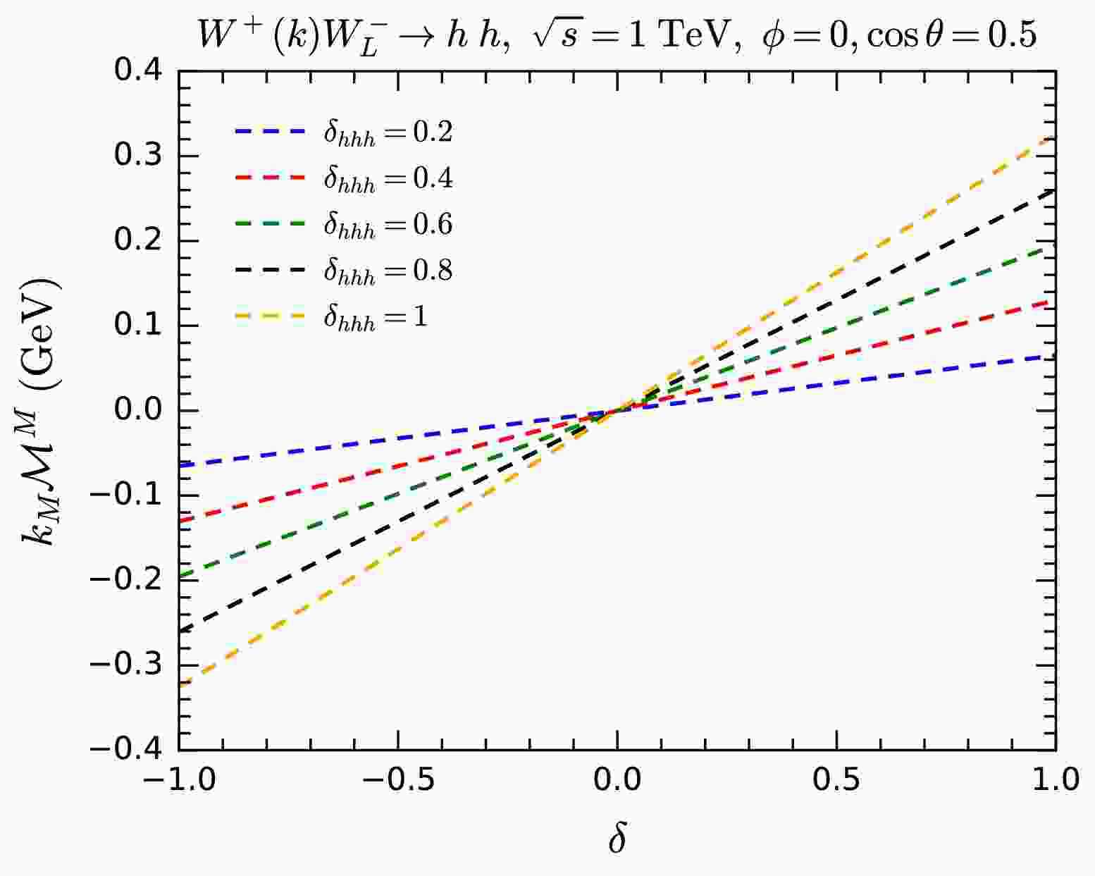 $ \delta = 0 $ corresponds to the relation (20) that respects gauge symmetry. We take$ \delta_{hhh} $ to be$ 0.2 $ ,$ 0.4 $ ,$ 0.8 $ , and$ 1 $ . For every$ \delta_{hhh} $ value, we compute$ k_M{\cal{M}}^M $ as a function of δ for the$ WW\rightarrow h h $ process with one W polarization vector replaced by the 5-component momentum. The results are summarized in Fig. 16. As can be seen in the figure,$ k_M{\cal{M}}^M = 0 $ only appears when$ \delta =0 $ , i.e., when the relation (20) holds. This confirms our argument that, with an anomalous coupling of$ \lambda_{hhh} $ , gauge symmetry can be restored by adding an proper anomalous coupling of$ \lambda_{hh\varphi\varphi} $ .