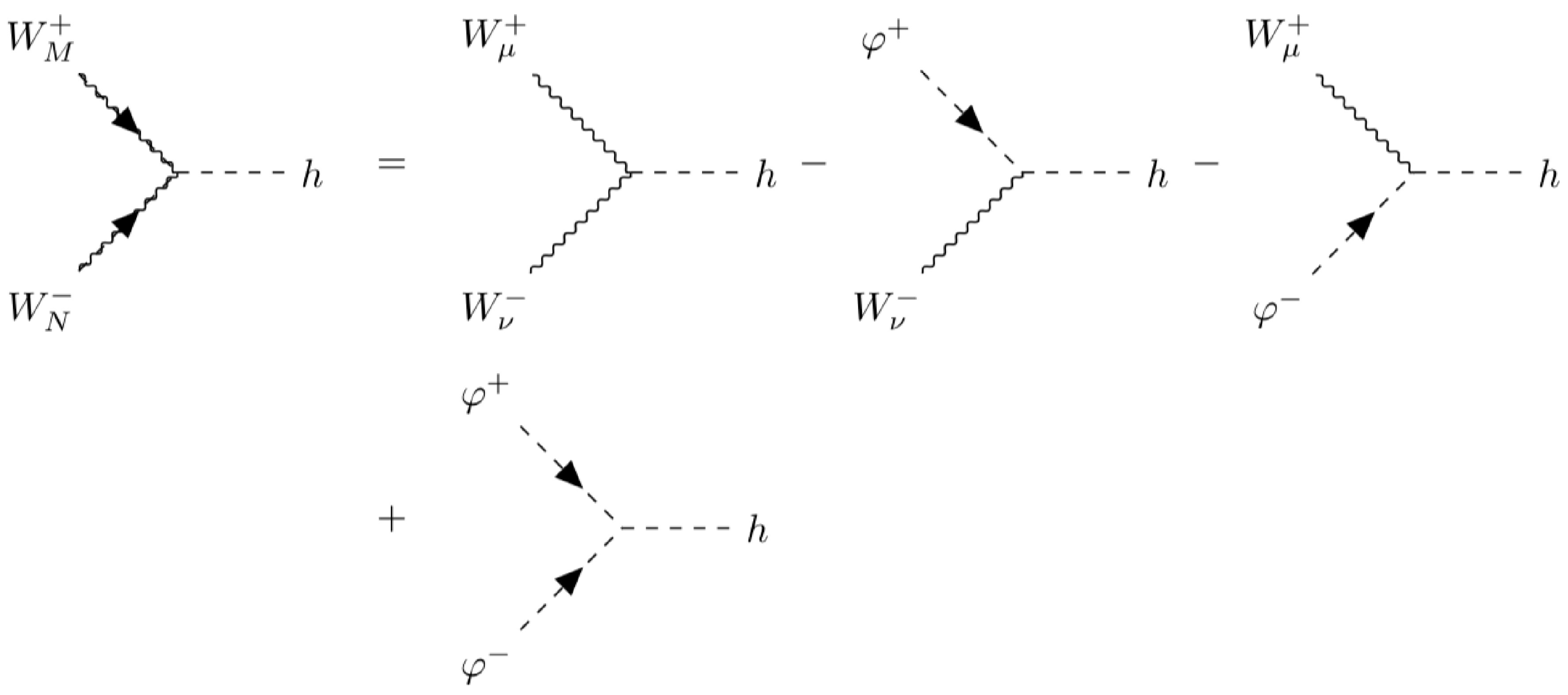 $ \begin{aligned}[b] g_{WWh} &=gm_W(1+\delta^1_{WWh}),\quad g_{W\varphi h}=\frac{g}{2}(1+\delta^2_{WWh}), \\ g_{\varphi W h} &= \frac{g}{2} (1+\delta^3_{WWh}), \quad \lambda_{\varphi\varphi h}=\frac{gm^2_h}{2m_W}(1+\delta^4_{WWh}). \end{aligned} $